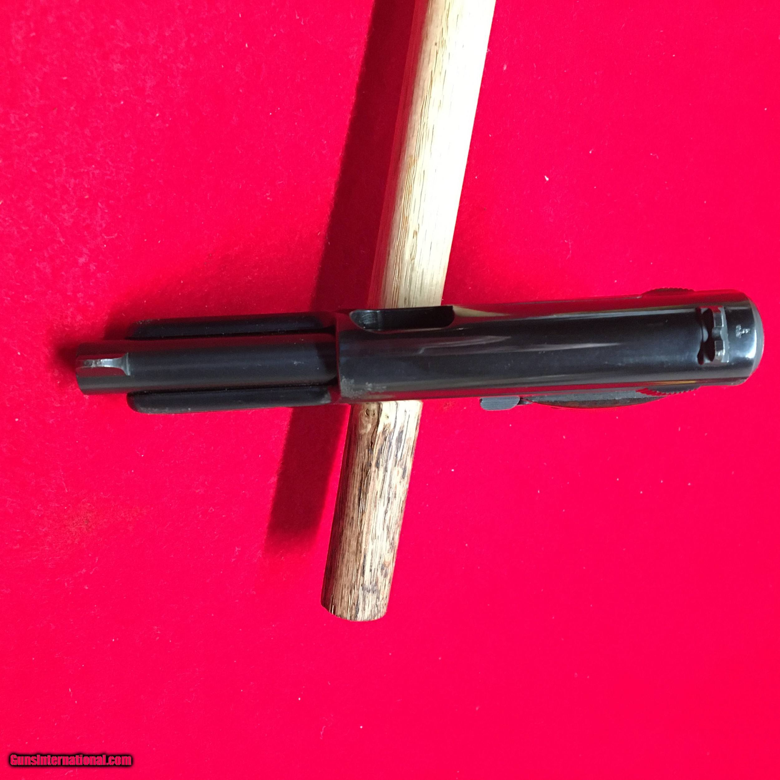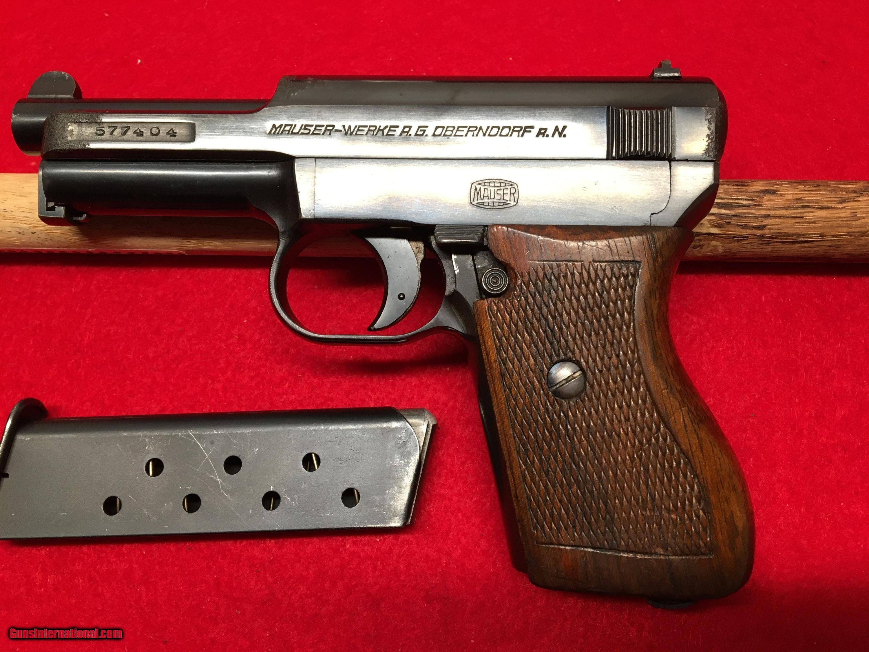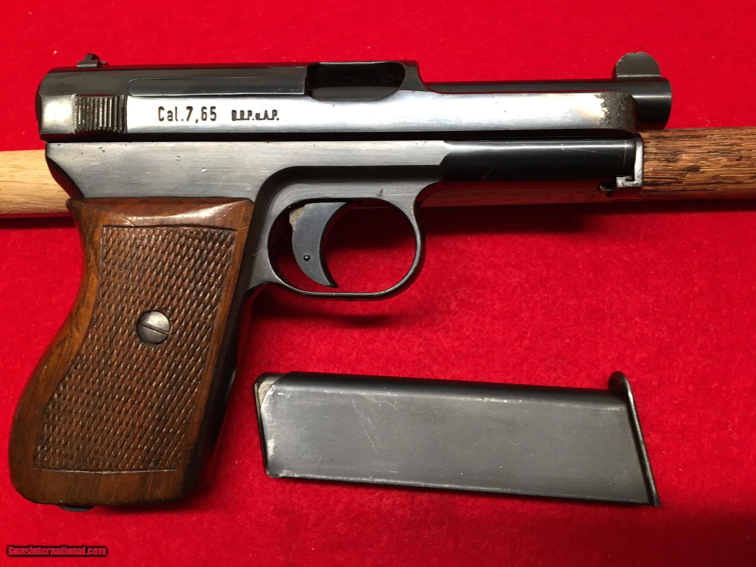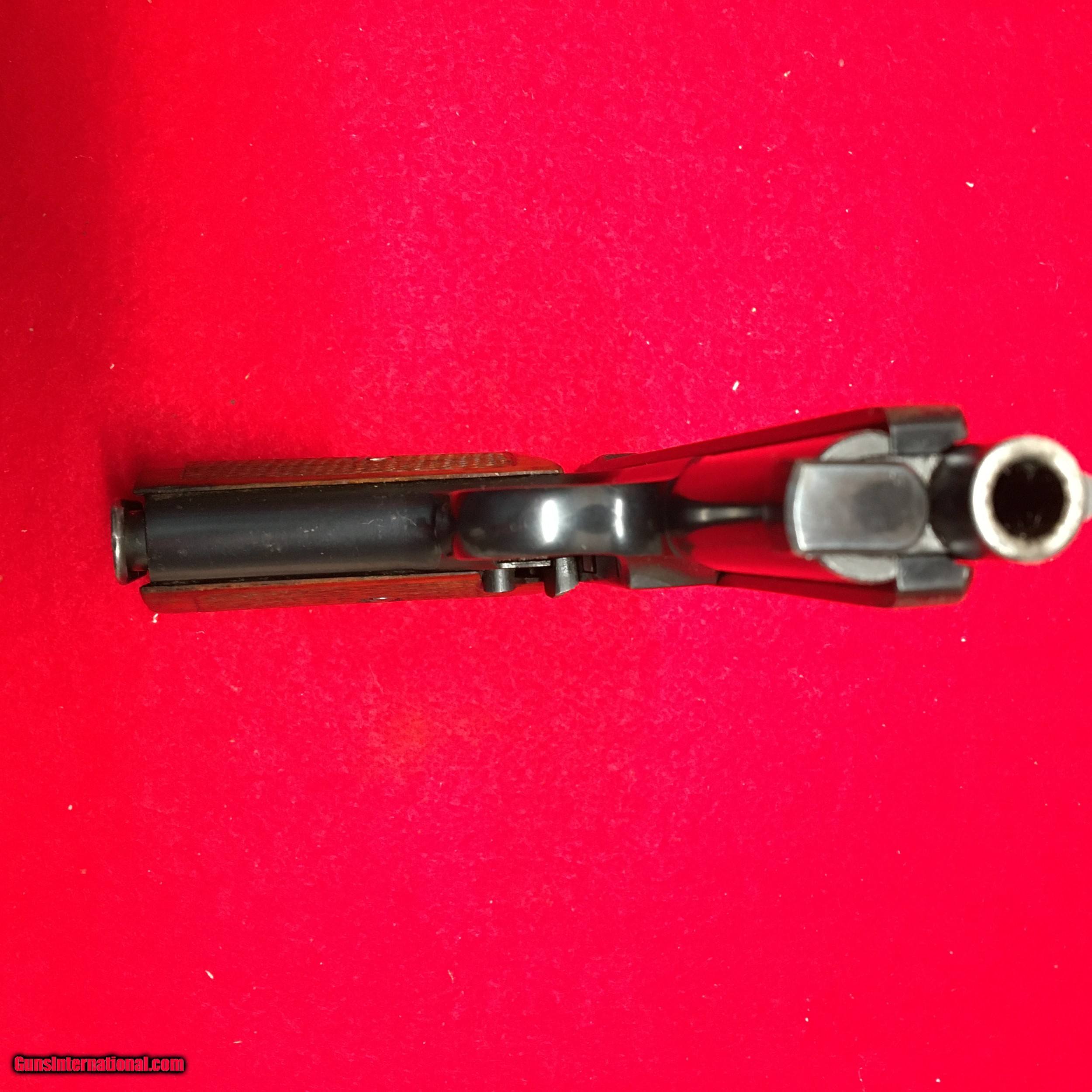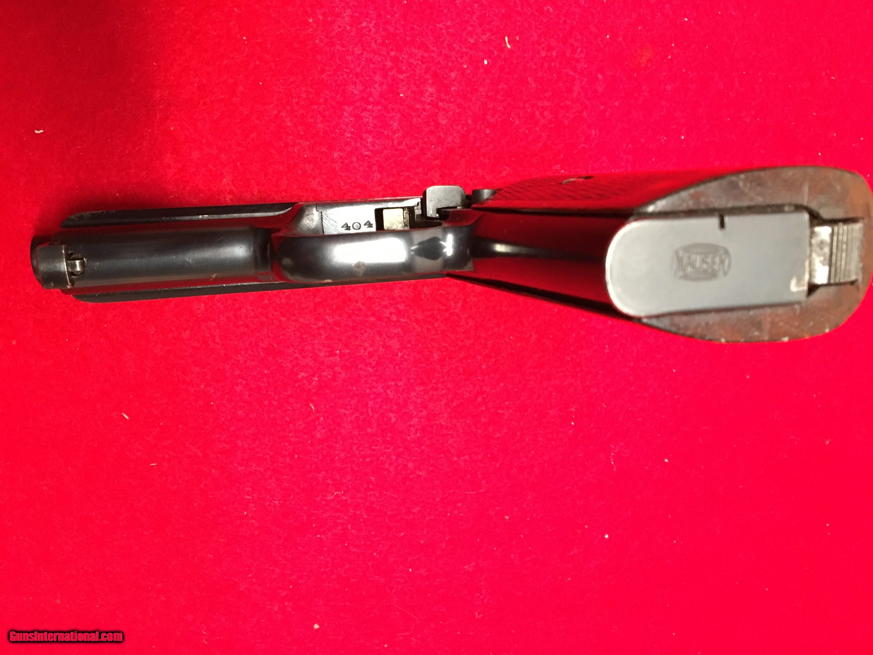 Description: Mauser 1914/40 7.65mm Standard model 1st variation 95% overall. 1934 style (curved) wood grip, E/N Proofs. Salt blue finish, Mauser Werke address, fat banner sideplate and CAL 7.65 with half height patent RH slide marking. Slide SN in milled slot. This is one of the so called "Commercials", which were the fewest made and while not usage marked, many of these were militarily used having been obtained through private purchase. This is an early E/N Proof instead of the C/U Proof. Hard to find. 95% instead of 99% due to light pitting on end of slide, both sides and rear of slide left side. Basic variation SN range 576630-629000. Correct mag. SN 577404 Payment: USPS Money Order, Certified Check, Personal Check. Buyer pays shipping, handling and insurance costs; flat rate $35 SOLD Manufacturer: Mauser Model: 1914/40 Serial Number: 577404 |