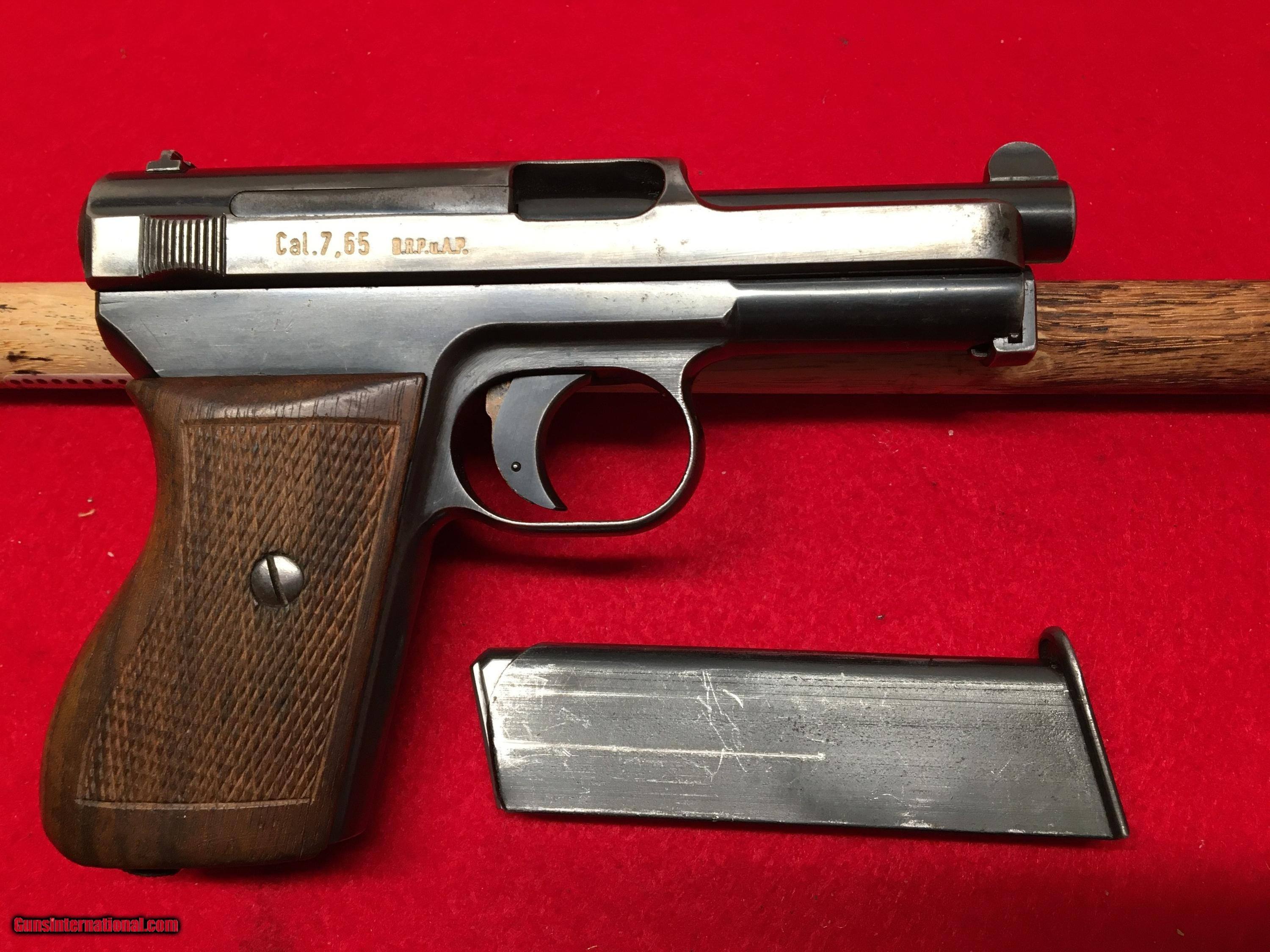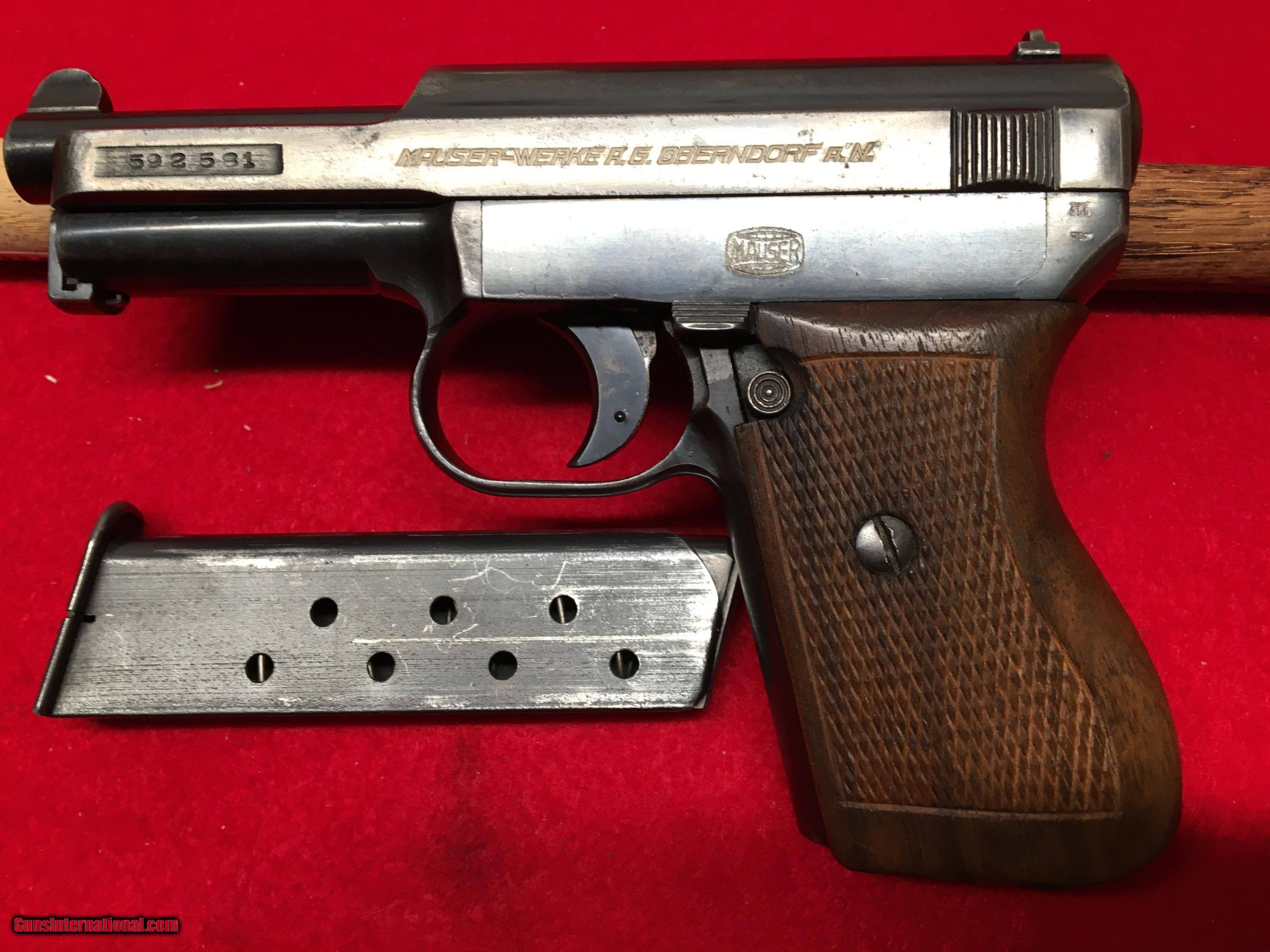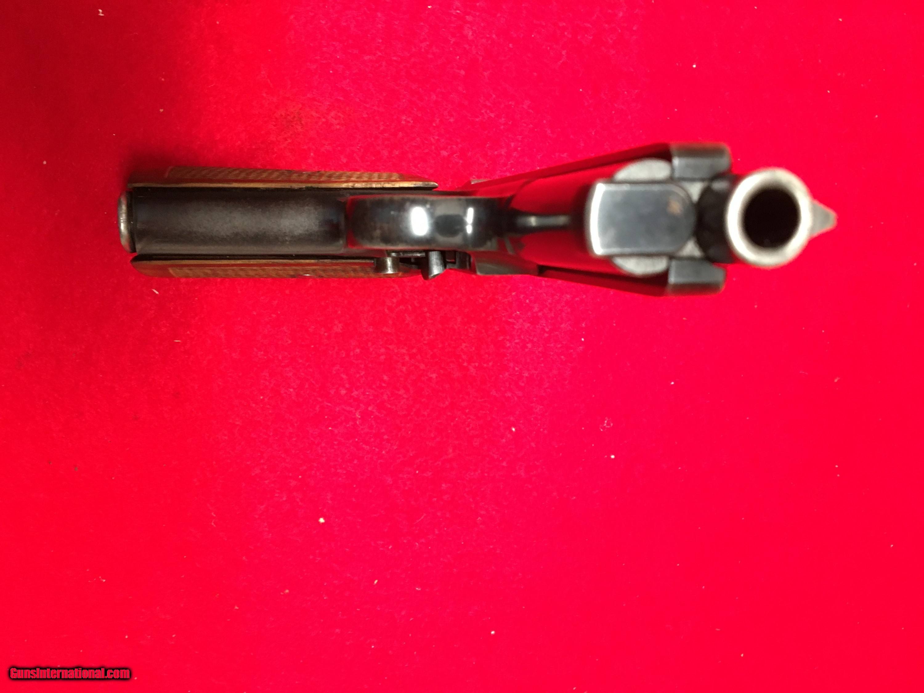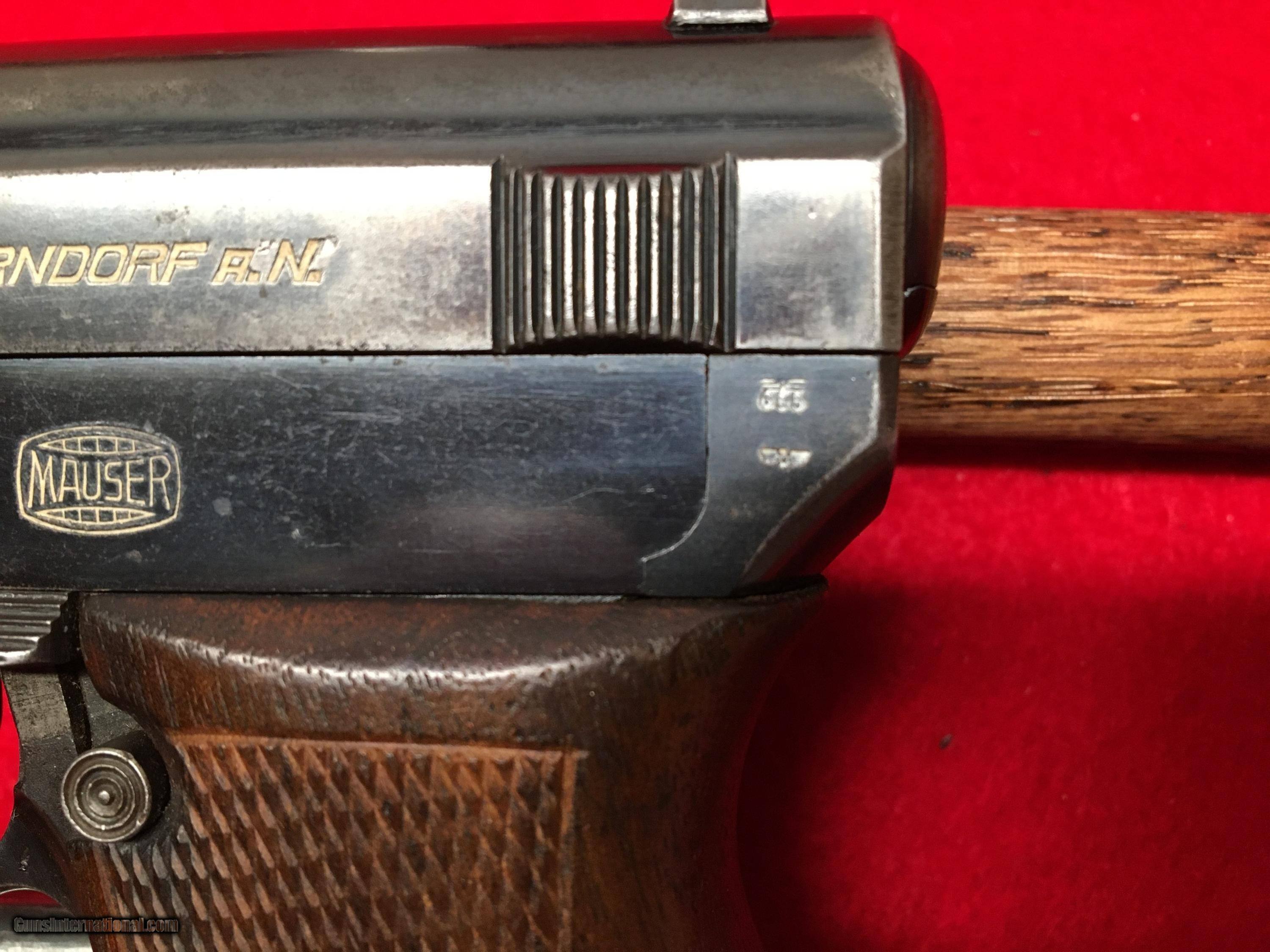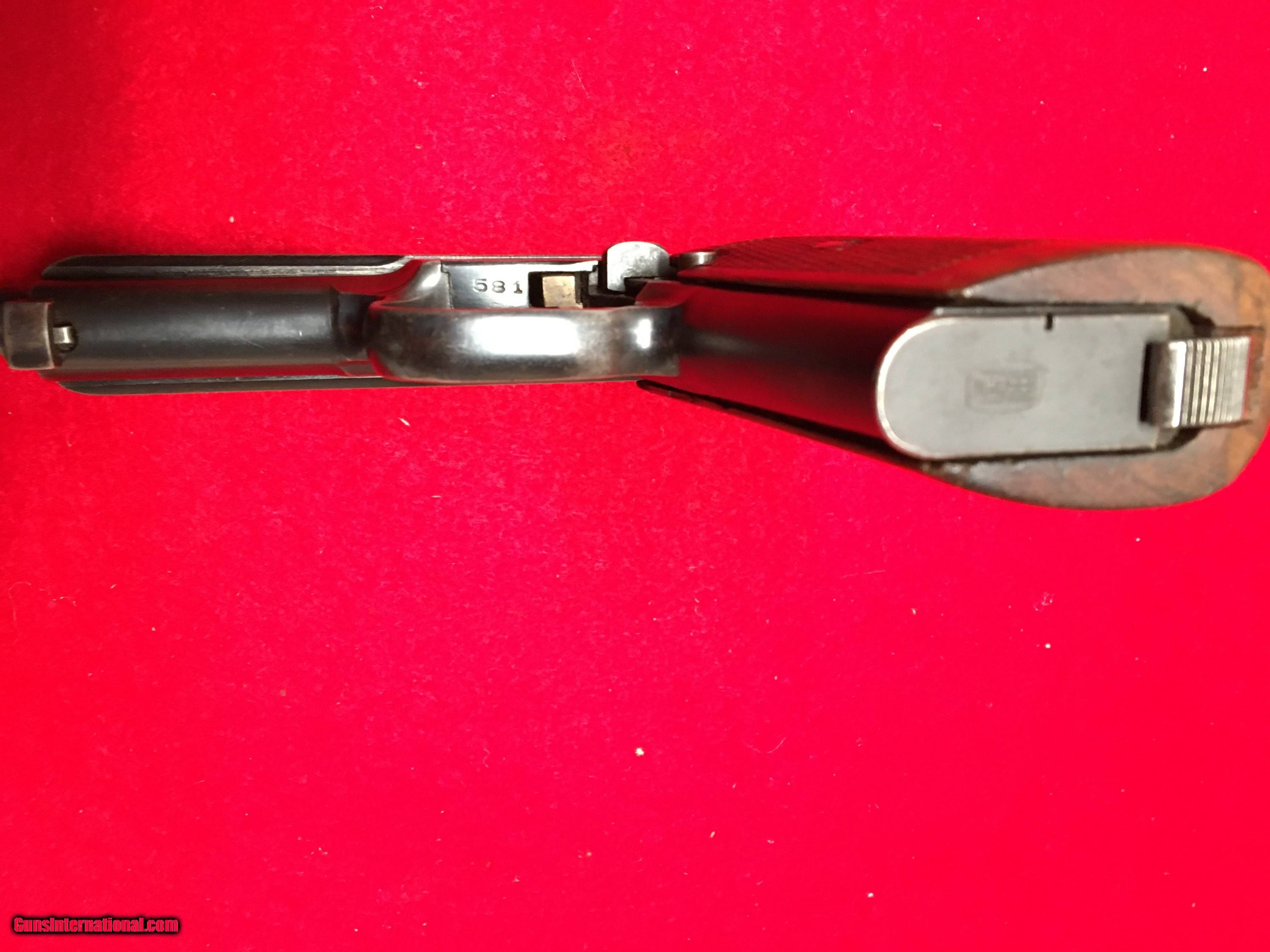 Description: Mauser 1914/40 7.65mm Army E/655 95% overall. 1934 style (curved) wood grip, E/N Proofs. Salt blue finish, Mauser Werke address, fat banner sideplate and CAL 7.65 with half height patent RH slide marking. Slide SN in milled slot. Small E/655 Army Acceptance and Test Proof on LH rear frame. These are harder to find than Navy models. Estimated 8K Army made to 23K Navy. Basic SN Range 576630-629000. SN 592581 Correct Mag Payment: USPS Money Order, Certified Check, Personal Check. Buyer pays shipping, handling and insurance costs; flat rate $35 SOLD Manufacturer: Mauser Model: 1914/40 Serial Number: 592581 |