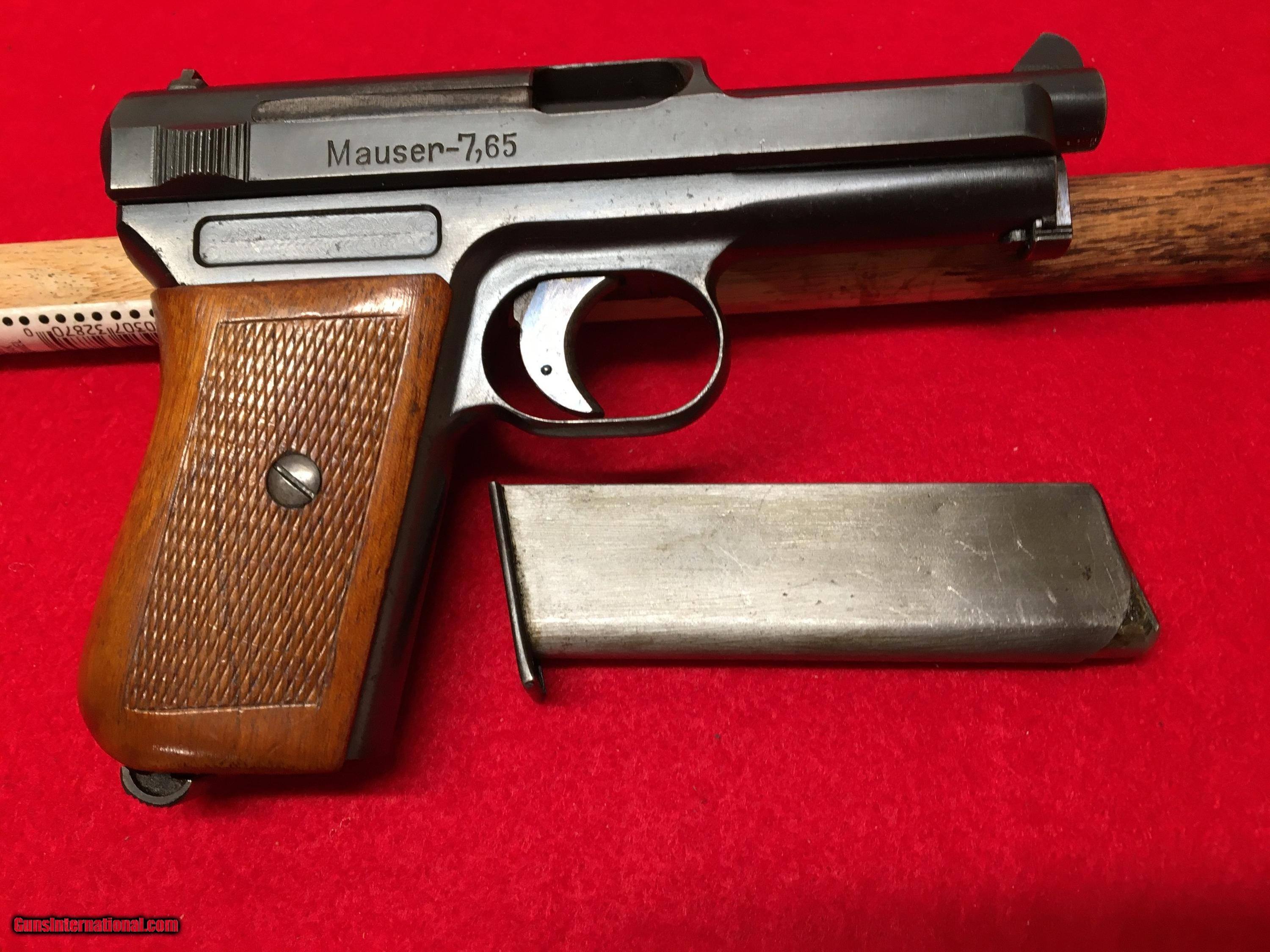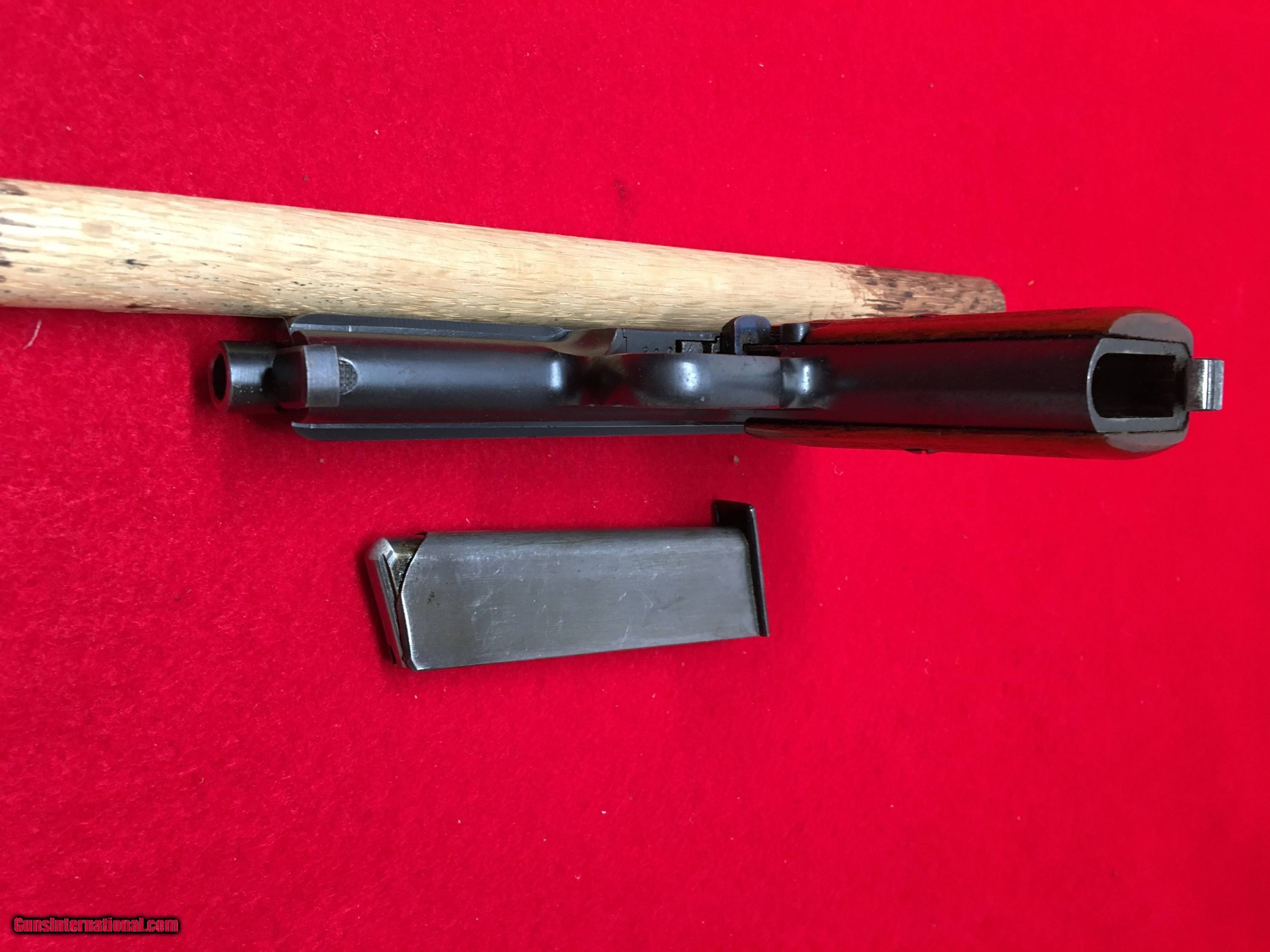 Description: Mauser 1914 7.65mm 9th Variation 98-99% overall. Wood grip. Large pattern address, no banner sideplate, 6th style Mauser 7.65. CAL marking on RH slide. A very nice piece. Excellent bore. Basic variation SN range 230000-296000. Correct mag. SN 269812 Payment: USPS Money Order, Certified Check, Personal Check. Buyer pays shipping, handling and insurance costs; flat rate $35 SOLD Serial Number: 269812 |