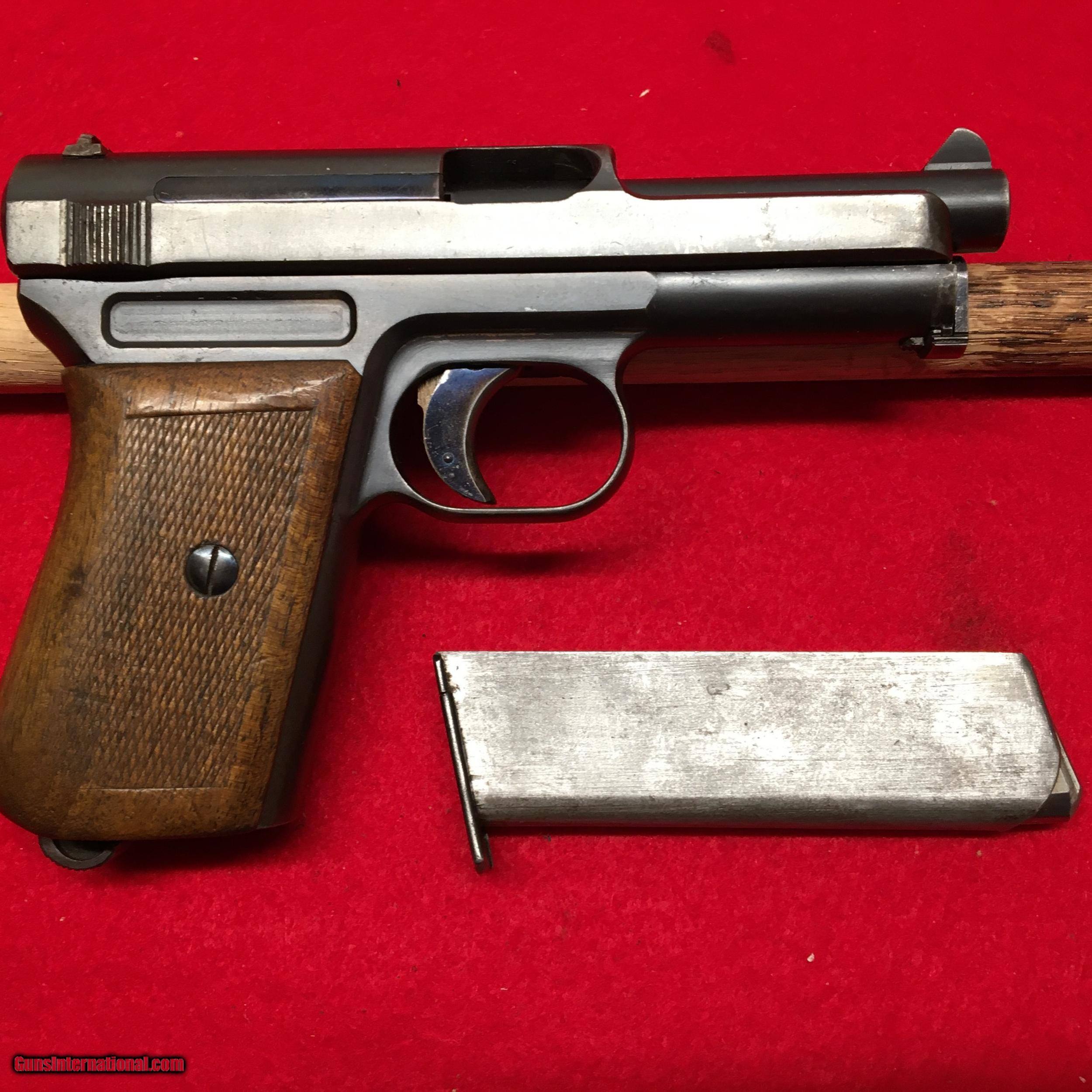 Description: Mauser 1914 7.65mm 2nd Variation Mil. SN 18297. 95-97% overall. Wood grip. Small pattern address, large BNR sideplate, mil acc mark front of rear sight. A nice correct early mil with some honest wear and good heat colors. These early small pattern address mils are becoming harder to find. Basic Variation SN 13500-5000. Correct mag Payment: USPS Money Order, Certified Check, Personal Check. Buyer pays shipping, handling and insurance costs; flat rate $35 SOLD Manufacturer: Mauser Model: 1914 Serial Number: 18297 Condition: 95-97% |