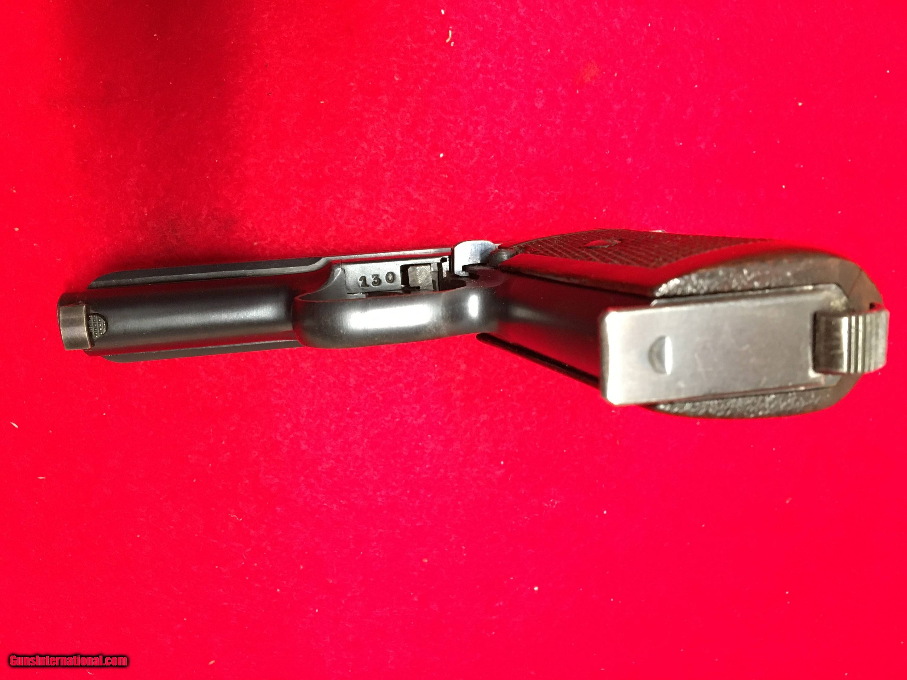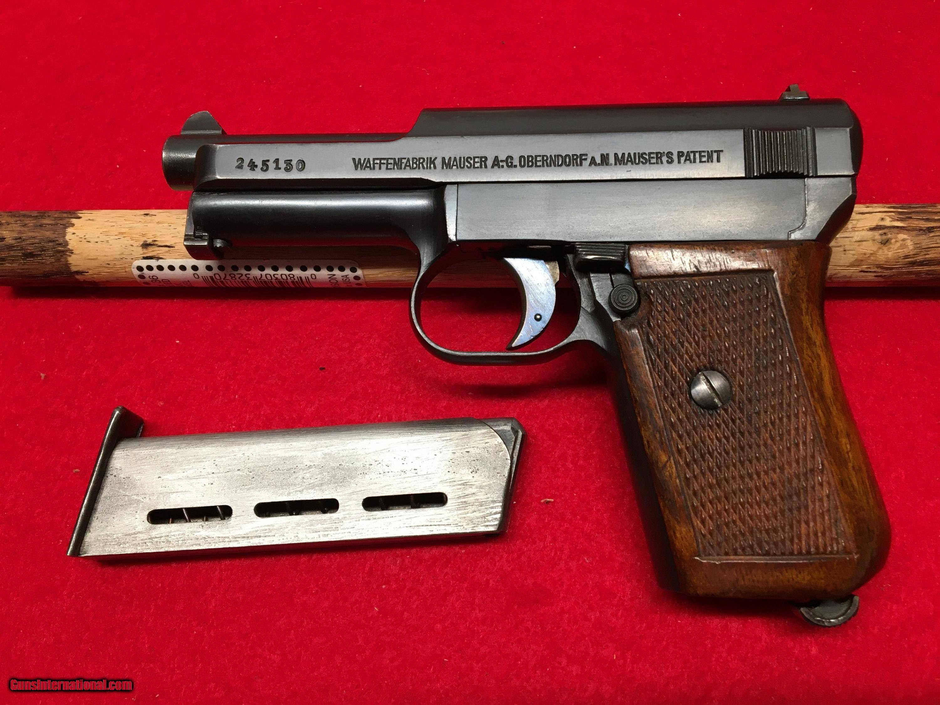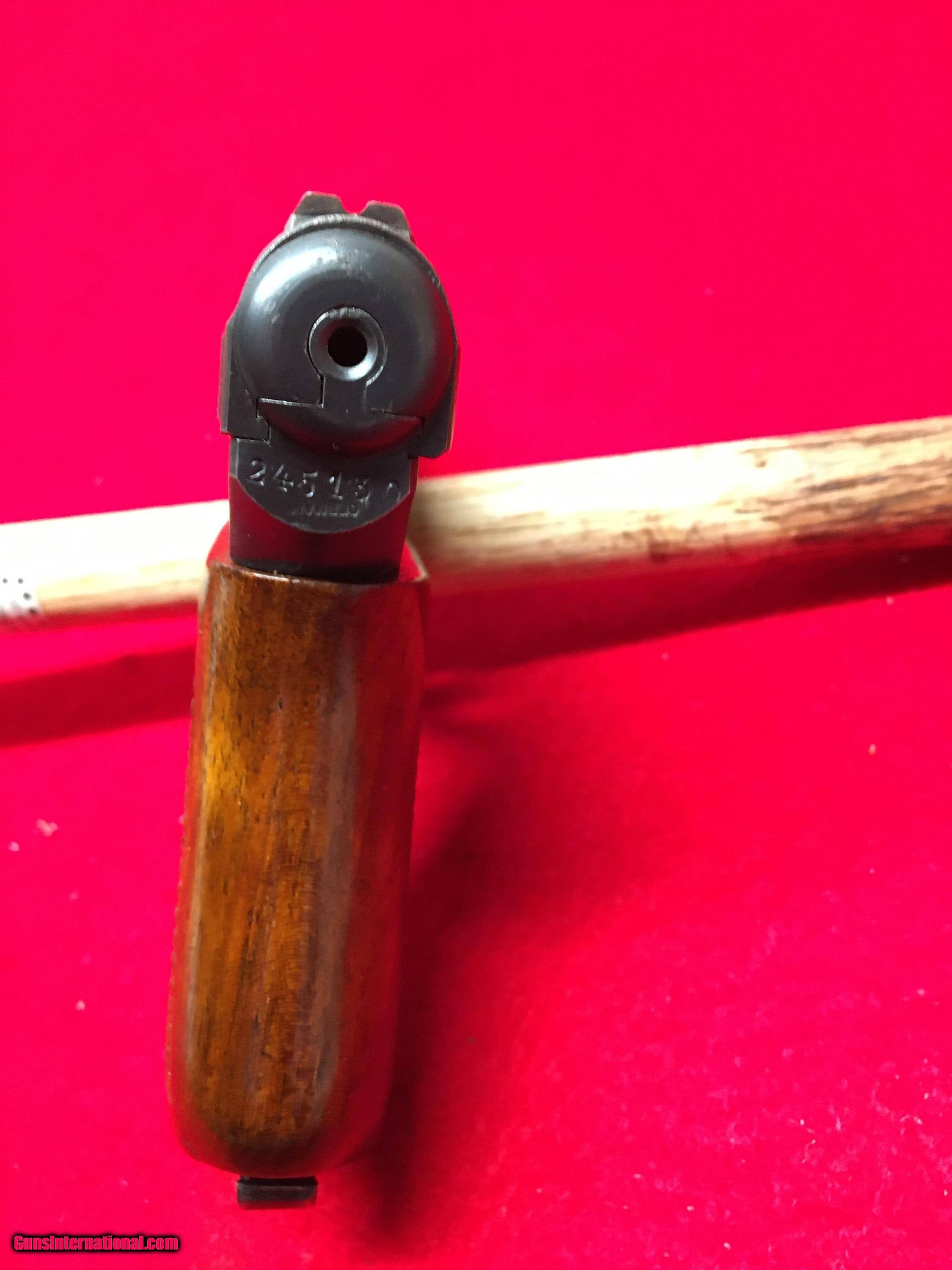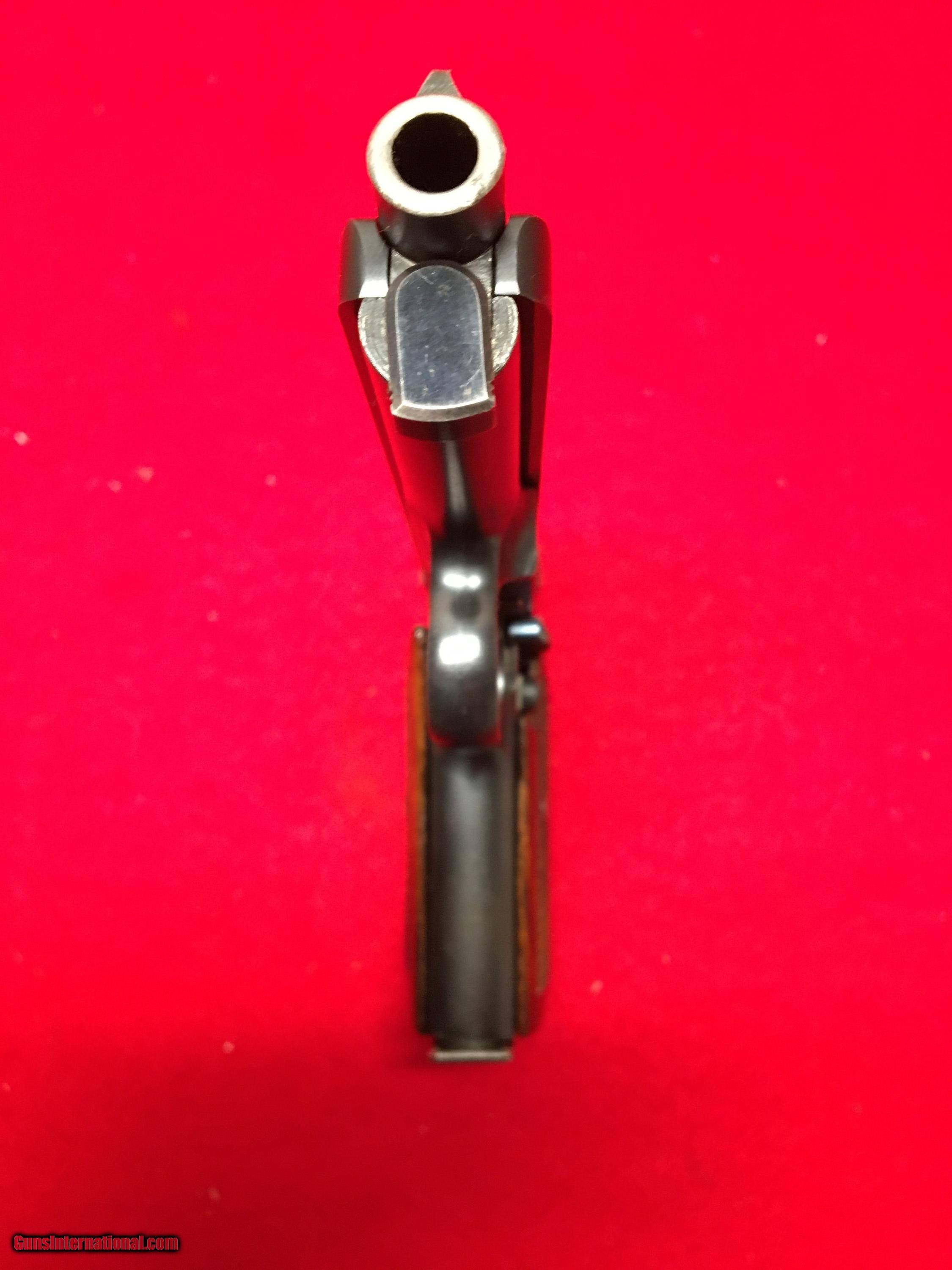Description: Mauser 1914 7.65mm 9th Variation. SN 245130. 99% overall. Wood grip. Large pattern address, no banner sideplate, 6th style "Mauser-7.65" cal marking on the RD slide. Importer "Germany" marked on rear frame below SN. Basic Variation SN Range: 23000-296000. Correct mag Payment: USPS Money Order, Certified Check, Personal Check. Buyer pays shipping, handling and insurance costs; flat rate $35 SOLD Manufacturer: Mauser Model: 1914 Serial Number: 245130 |