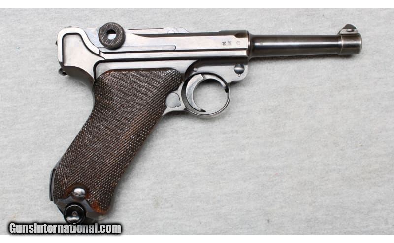 Description: Mauser S/42 1937 chambered in 9MM Luger. This is a nice example of an original 1937 dated mauser luger pistol. This series of luger has the all salt blued finish with the checkered walnut grip. The top of the chamber area is dated 1937 with the "42" code markings on the top of the front toggle. The right side of the barrel extension has the double "eagle/655" Waffenamt proofs next to the single spread winged Nazi eagle firing proof which also appears on the right side of the barrel and the left side of the breechblock. The upper safety area is marked "GESICHERT". The pistol is fitted with a magazine with the plastic base. 9mm Luger SOLD Metal Condition: Excellent Bore Condition: Bright Barrels: 4 Inches Triggers: Factory Sights: Fixed Item Location: La Vista, NE |