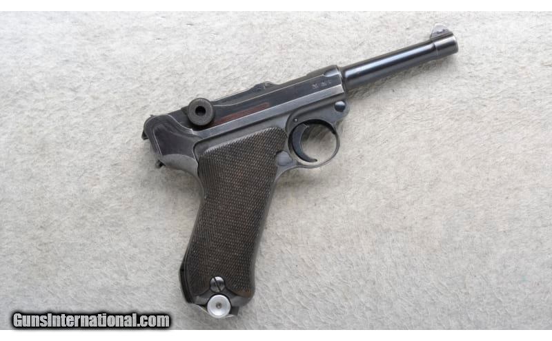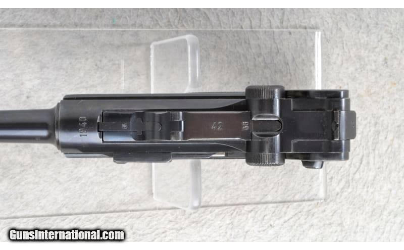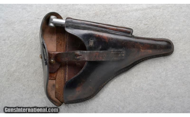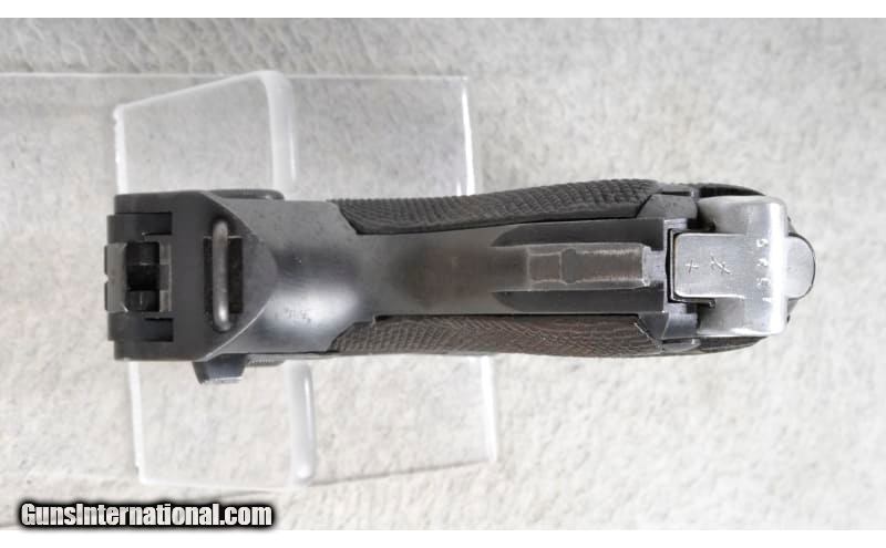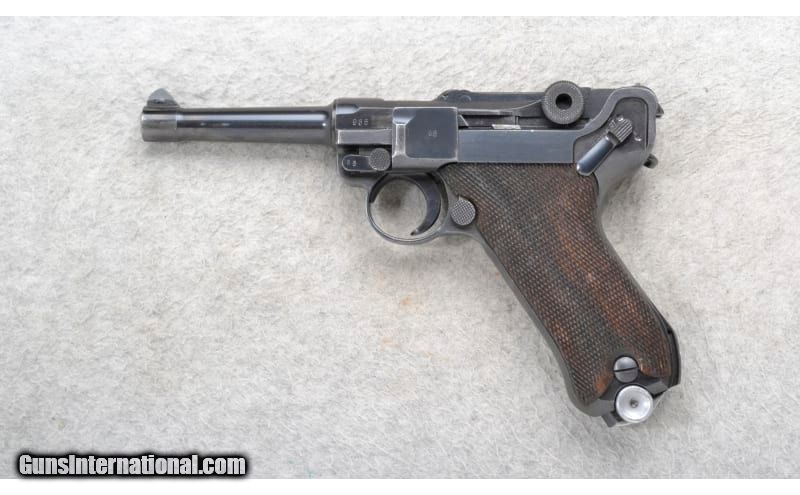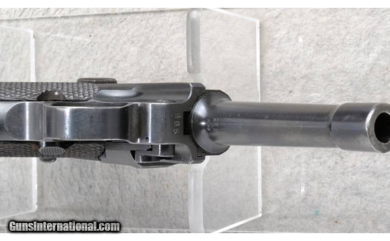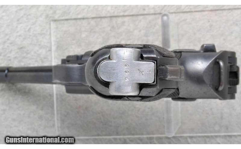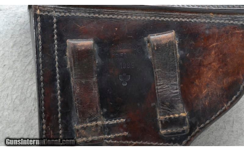 Description: This Mauser Model 1940 Luger is a right hand toggle locked recoil operated semi-automatic pistol in 9mm Cal. It has a 4 inch barrel. A blade front sight and notch rear sight. The grip is a checkered hardwood. The leather holster is stamped Berlin 1939. Serial number 965 is a match on the gun and one magazine bottom. The second magazine bottom is stamped 4898. 9mm Luger SOLD Curio/Relic: Yes Chambers: 8 shot. Metal Condition: Very Good. Minor use marks. Wood Condition: Very Good. Minor handling marks. Bore Condition: Very Good. Barrels: 4 inch. Weight: 32 oz. Sights: Raised blade front Notch rear. Item Location: Richfield, WI |