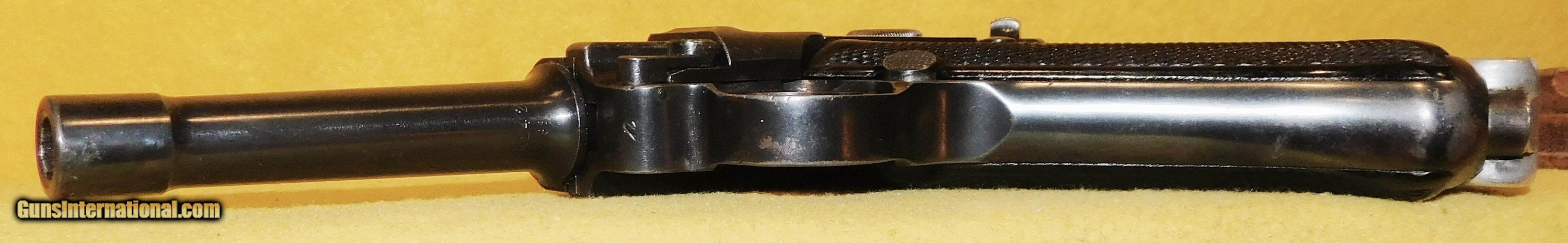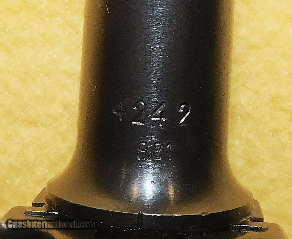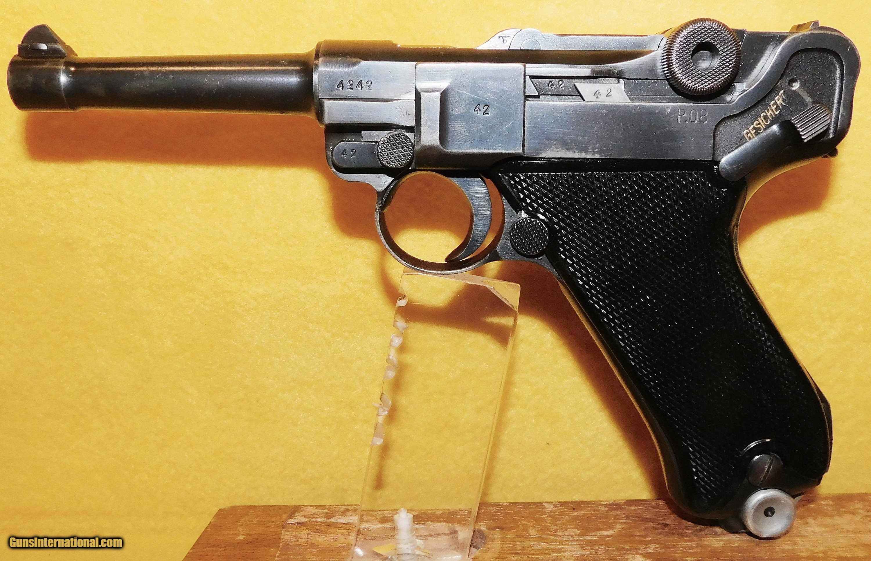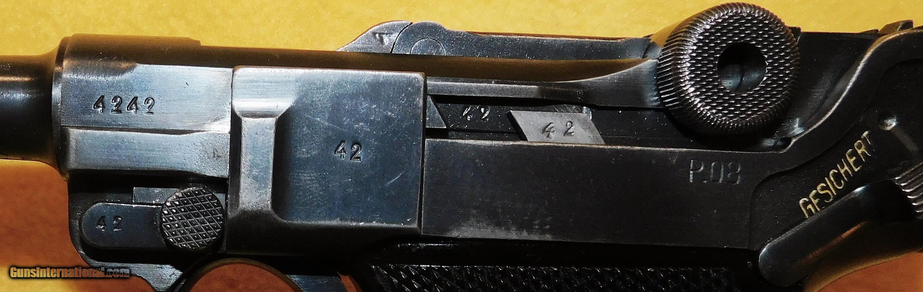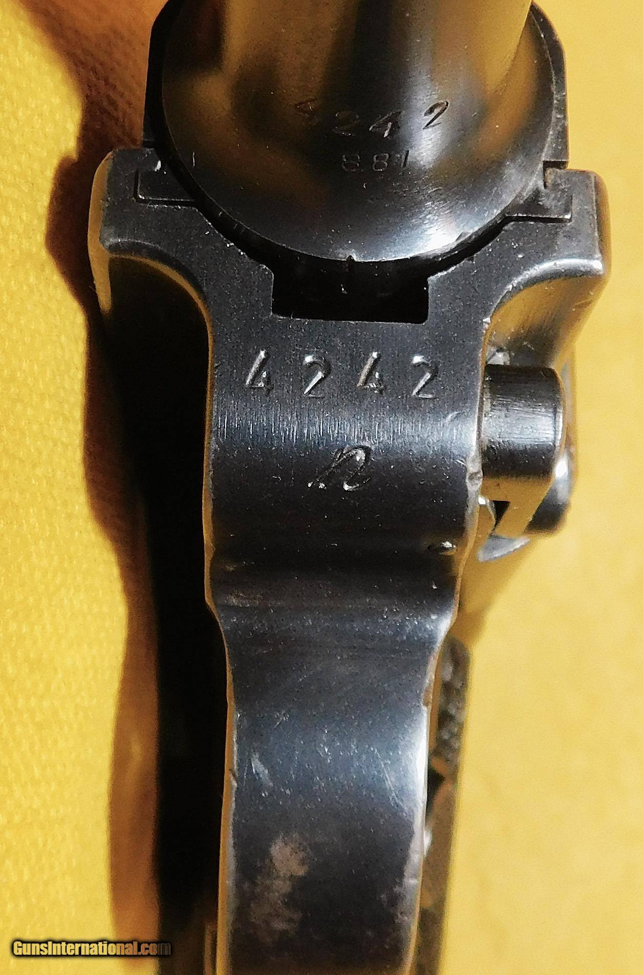 Description: MAUSER 41/42 (BLACK WIDOW) IN 9MM CAL., WITH 4" BARREL. COLOR BLUE. CONDITION 95%. SERIAL NUMBER 4242 n. MAUSER “42” CODE “41” DATE P.08 “BLACK WIDOW” LUGER ONE OF ONLY 7000 41 DATE CODE WITH 42 ON THE FRONT TOGGLE PRODUCED, IN 9MM CALIBER, 8/10 BORE WITH STRONG RIFLING, EAGLE/655 PROOFS, SERIAL NUMBER 4242 n, “881” UNDER BARREL, KRIEGHOFF BLACK BAKELITE GRIPS WITH TWO SMALL SCREW HOLES IN EACH PANEL WITH TWO FINE CHECKERED RITZE PANELS IN EXCELLENT CONDITION, COMES WITH ONE SERIAL NUMBERED ALUMINUM BASED KRIEGHOFF FACTORY MAGAZINE WITH “122” AND EAGLE “37” PROOFS, 95%+ OVERALL CONDITION, STOCK # D6971 SOLD |