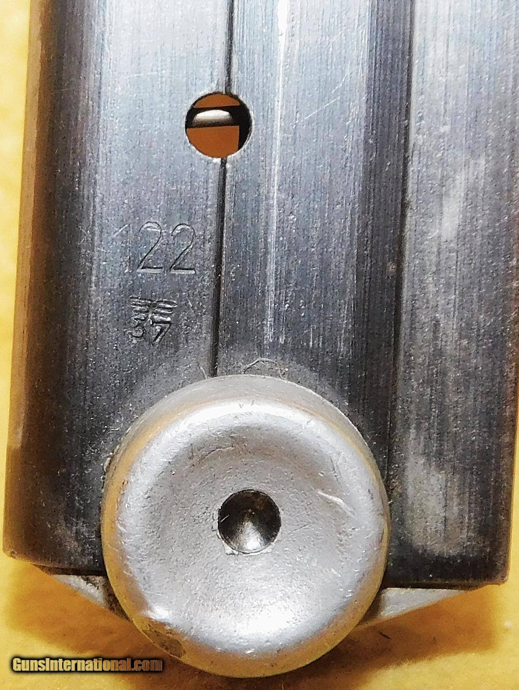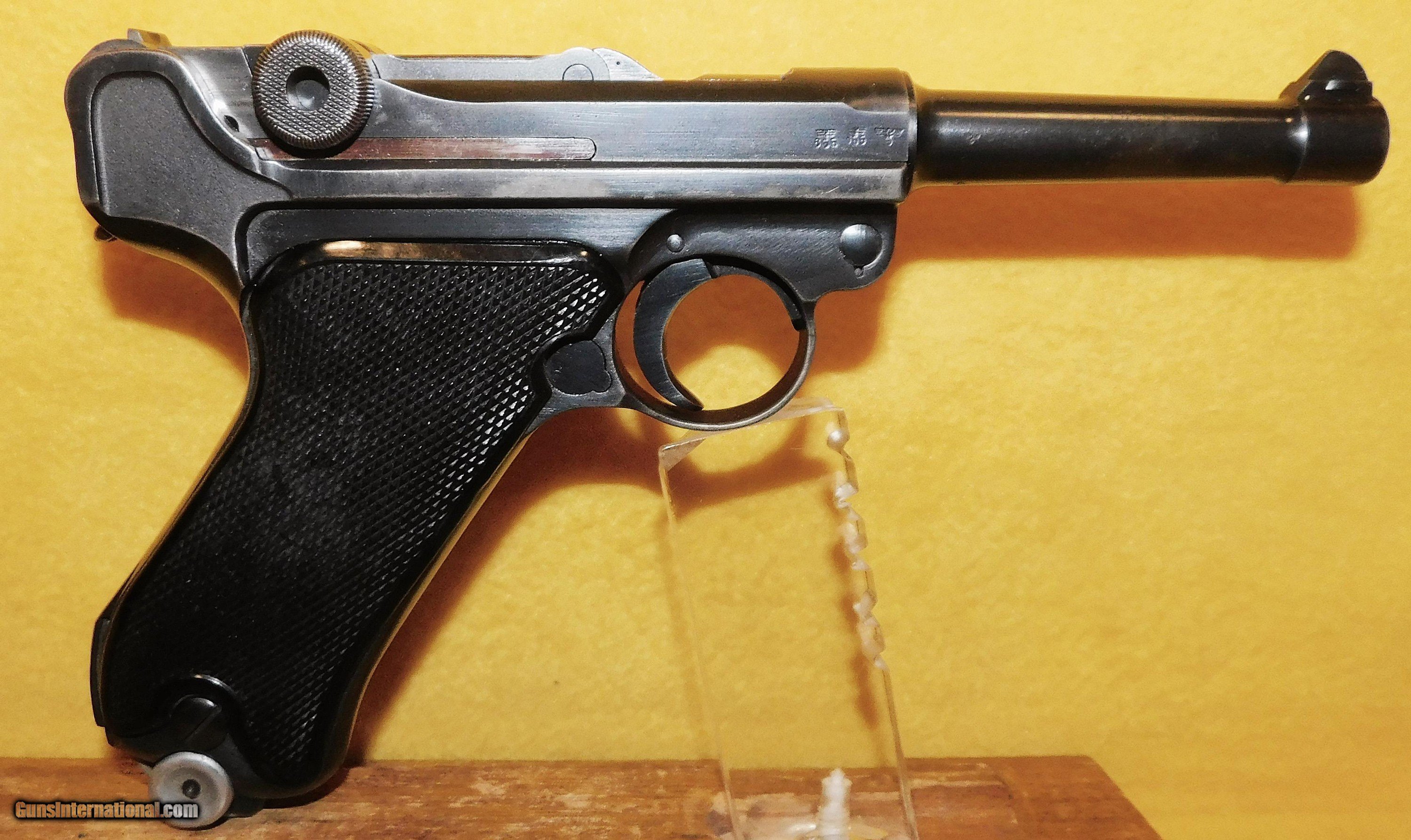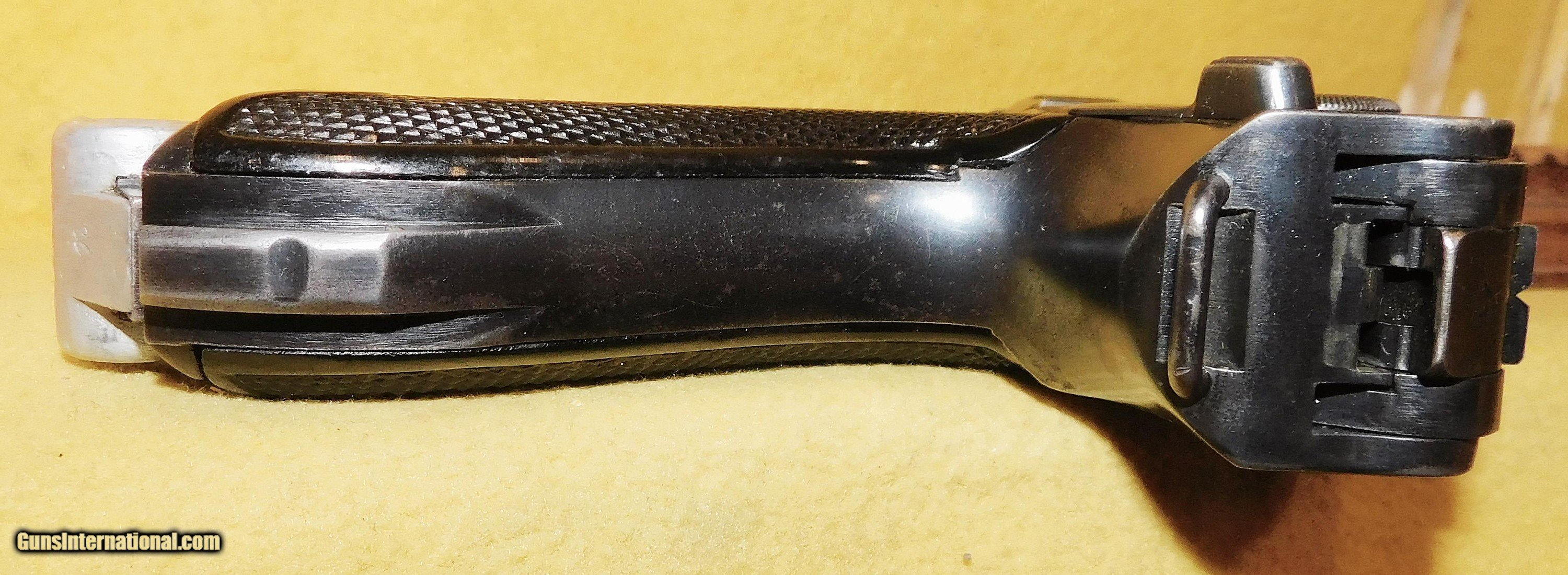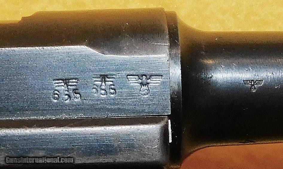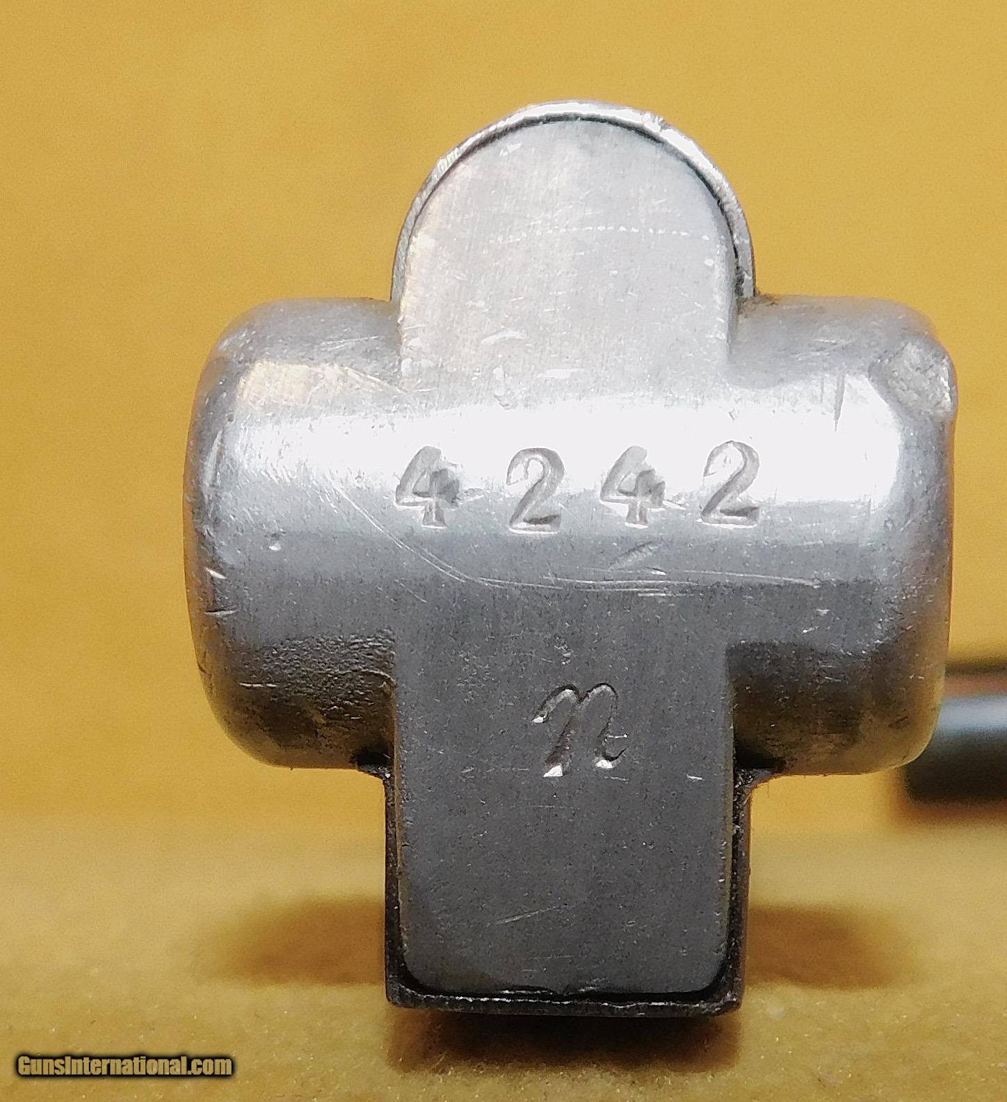 Description: MAUSER 41/42 (BLACK WIDOW) IN 9MM CAL., WITH 4" BARREL. COLOR BLUE. CONDITION 95%. SERIAL NUMBER 4242 n. MAUSER “42” CODE “41” DATE P.08 “BLACK WIDOW” LUGER ONE OF ONLY 7000 41 DATE CODE WITH 42 ON THE FRONT TOGGLE PRODUCED, IN 9MM CALIBER, 8/10 BORE WITH STRONG RIFLING, EAGLE/655 PROOFS, SERIAL NUMBER 4242 n, “881” UNDER BARREL, KRIEGHOFF BLACK BAKELITE GRIPS WITH TWO SMALL SCREW HOLES IN EACH PANEL WITH TWO FINE CHECKERED RITZE PANELS IN EXCELLENT CONDITION, COMES WITH ONE SERIAL NUMBERED ALUMINUM BASED KRIEGHOFF FACTORY MAGAZINE WITH “122” AND EAGLE “37” PROOFS, 95%+ OVERALL CONDITION, STOCK # D6971 SOLD |