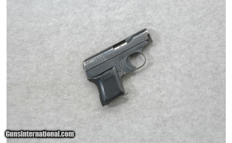 Description: SOLD Caliber Info: 6.35mm Metal Condition: Shows some age, use and wear. Bore Condition: Rough Barrels: 2.5 inches. Stock: Mauser black checkered Bakelite. Weight: 12 oz. Sights: Blade front. Notch rear. Item Location: Richfield, WI |