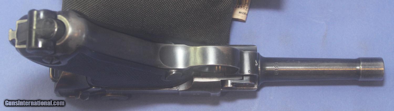 Description: Inv. 5682 Mauser (byf, Black Widow) Dated "42", Serial Number 83XX h. Super nice, the gun still has about 90-95% 0f the original blue. The loss is contained to the usual muzzle, sideplate and sharp edge silvering. The grip straps have grayed slightly and there is some very faint thinning on the toggle. Most of which is due to holster wear. There are no pits rust spots or scratches to be seen. All numbered parts match. The slide is marked Eagle/135, Eagle/135, Eagle Swastika. The toggle is marked Eagle/Swastika. The barrel also has an Eagle/Swastika. The black Bakelite are not perfect but in very nice condition. The right panel has a small surface chip and the left, a very small chip at the top. The bolt of the gun locks up tight and functions properly. The bolt face and feed ramp, like the rest of the gun, shows very little use. The bore is super. The rifling is very sharp and well defined with just a minimum of graying. The gun comes with one correct Black Widow extruded magazine. The bottom right side has a small chip. The magazine is stamped FXO and Eagle/33, P 08. It's a right gun and a great value at..... $2395. To purchase this firearm or if you want to request more information contact us at: Email ckgunsymail Phone 201-512-0002 Cell 201-575-6838 FAX 201-215-4759 We accept most major credit cards. Prices shown are Discounted 3% for Cash or Check. The buyer must be familiar with all the laws governing the purchase and the ownership of firearms in their own city and state. The Yankee Armorer, Inc is not responsible for any failure to comply with or observe these laws. The Yankee Armorer, Inc will only ship after full payment and receipt of all required documents. Shipping: Add $35.00 for handguns, $45.00 for long guns. New Jersey buyers are subject to a 7% sales tax. The Yankee Armorer, Inc offers a 3 day inspection period with full refund upon return of intact firearm and in the original condition. The Yankee Armorer, Inc offers a no interest lay away program - 25% down; 25% in 30 days; 25% in 60 days; and full payment in 90 days. Any violation of this policy is subject to restocking and forfeiture of all payments. Any variation from this policy must be agreed to in advance. Unshipped Cancelled sales are subject to a 20% restocking fee. Be advised that all firearms sold by The Yankee Armorer, Inc. or the Gun Exchange, LLC (SELLER) are sold as collector’s items. They have not been fired or tested for safety and must be examined by a license gunsmith prior to use. By purchasing any item from the (SELLER), you are agreeing to hold the (SELLER) free from any damages or lawsuits of any nature. Any item left for transfer or storage will be charged to $25.00 per month, per item from the day of its receipt. Any variation from this policy must be agreed to in advance. Store hours 10:00 am to 5:00 pm Tuesday -Saturday. It's always best to call for appointment. Store 201-512-0002, cell 201-575-6838. SOLD Curio/Relic: Yes Manufacturer: Mauser Model: Po8 Luger Black Widow Serial Number: 83XX |