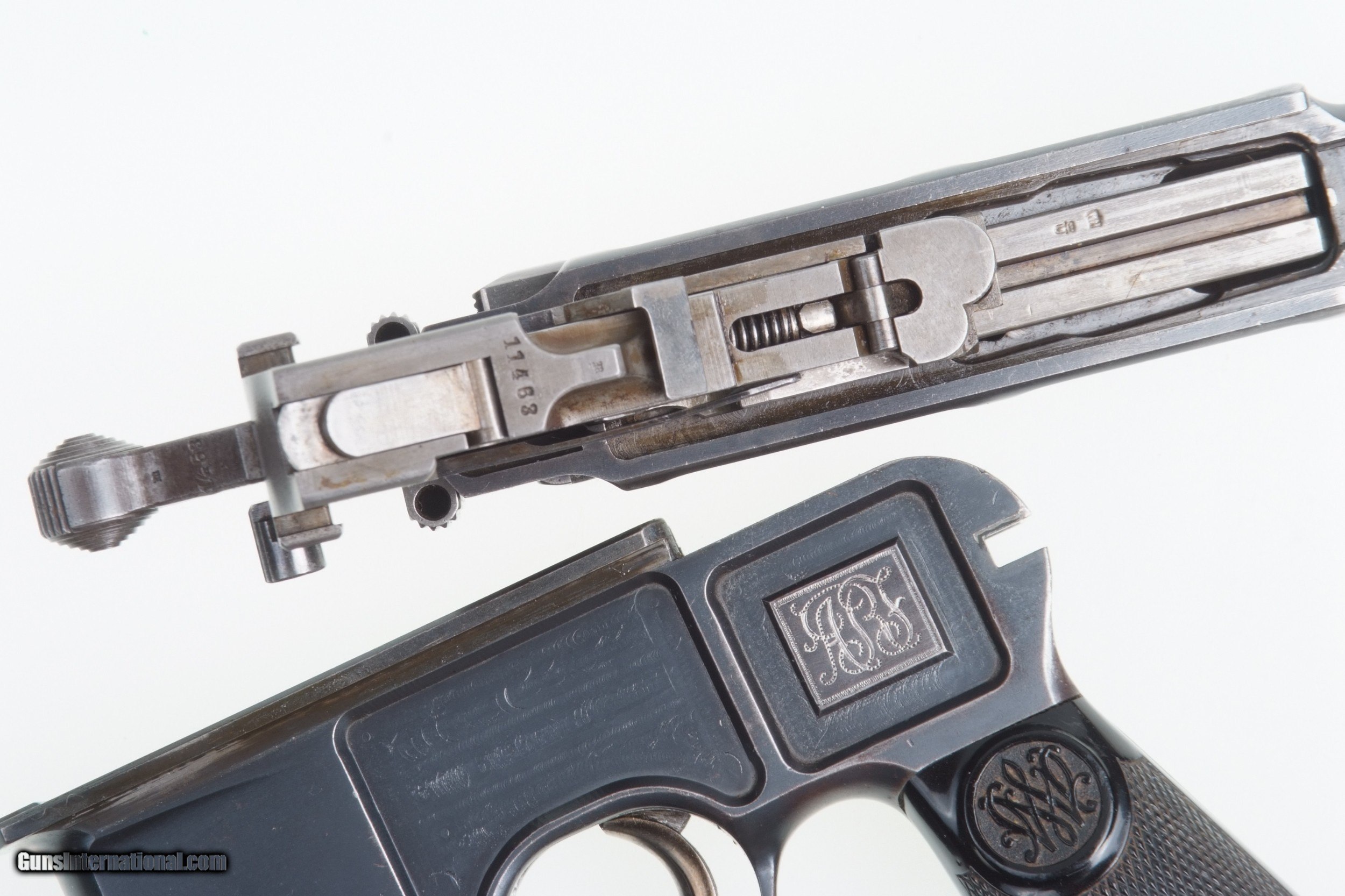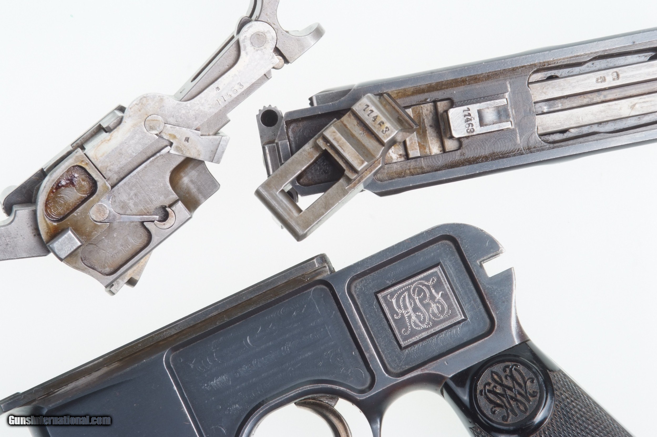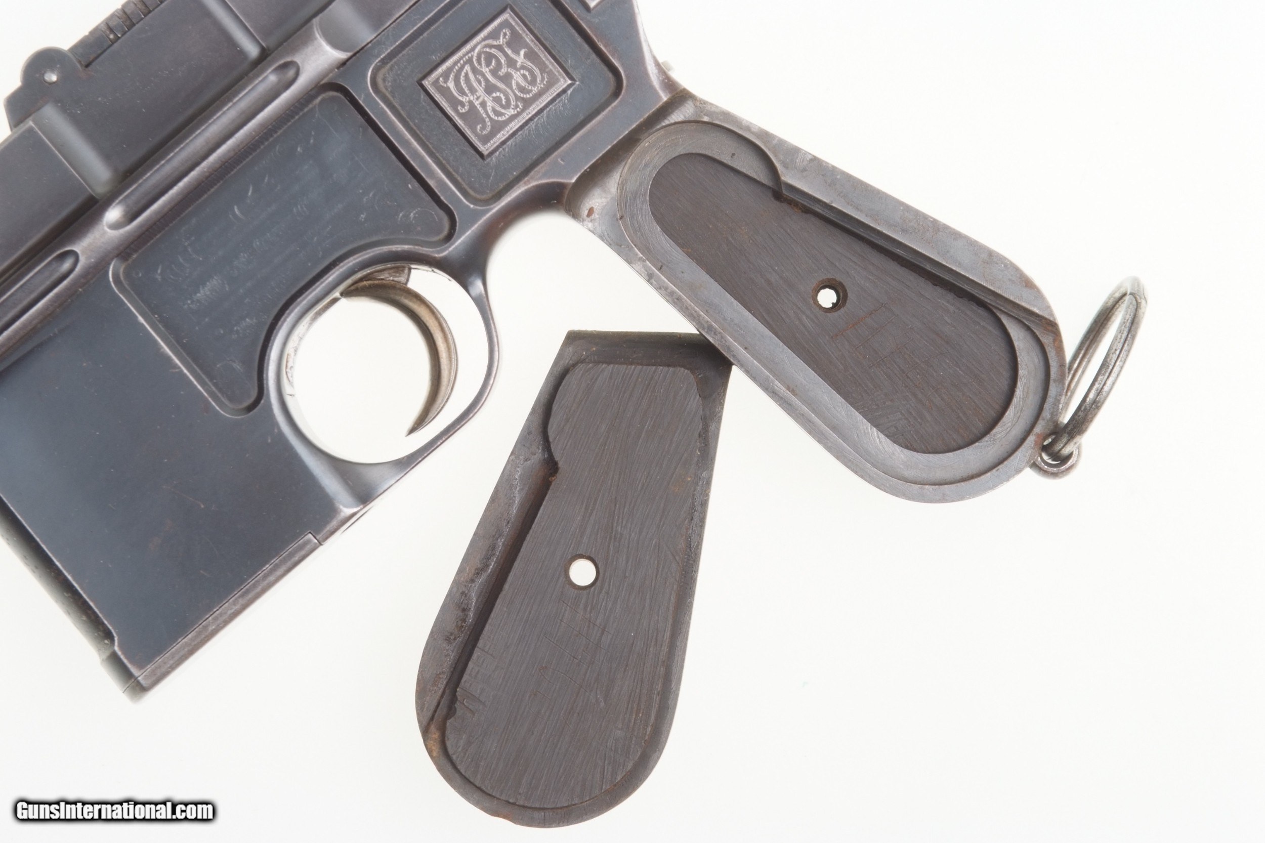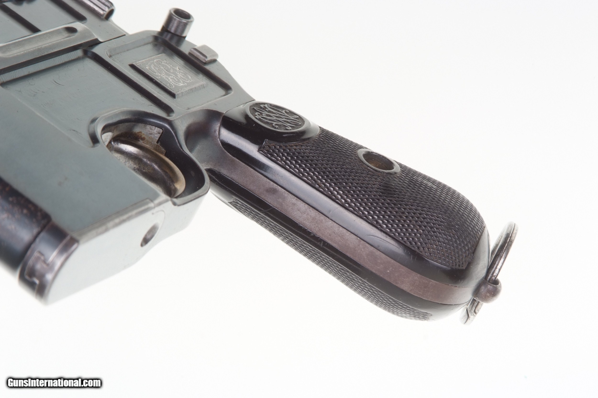 Description: Attractive, original condition Mauser Conehammer, late production, all matching parts, with silver inlayed initials and HR grips. SN: 11463. Cal. 7.63mm. Standard features having 5.5 in. barrel and 50-500 pinned sight. Usual chamber address with Crown/Crown/U on left side of barrel extension and antler proof on right side. Full serial number on bolt, firing pin retainer, and back of frame with last four digits on back of hammer. Silver inlayed “ARF”, finely bordered, on left rear panel. Detailed disassembly shows all usually numbered components matched to the serial number including each of the lightly scribed grip panels. Major parts are rust blued. Most minor parts are heat treated to fire blue with the bolt and trigger assembly in the white and the hammer grey case hardened. Hard rubber “MW” logo grips. Replacement lanyard ring present. Condition: VG+ original rust blue with usual sharp edge wear and rub marks in the usual locations. VG+ fire blue showing no enhancement. Comparable condition hard rubber grips with areas of blunted checkering but no splits. Dull bore with easily discernable rifling. Perfect manual mechanics. A very nice, original Conehammer with interesting personalization and the seldom seem hard rubber grips. ANTIQUE. A HISTORIC INVESTMENT! Buyer pays $40.00 shipping SOLD Curio/Relic: Yes Antique: Yes Manufacturer: Mauser Model: C96 |
