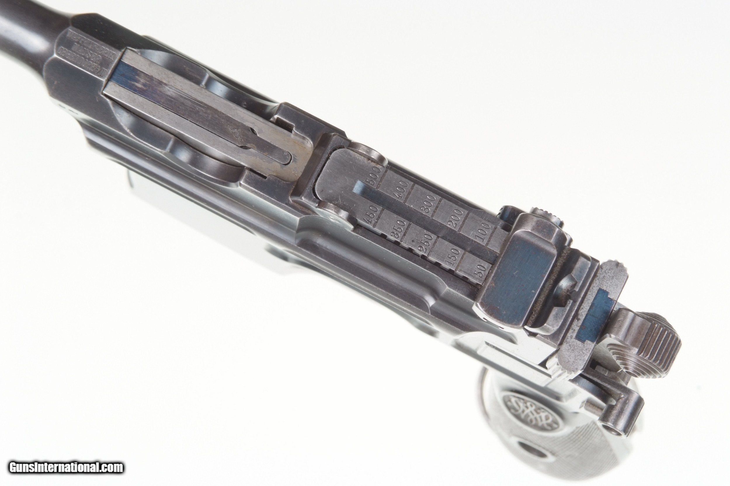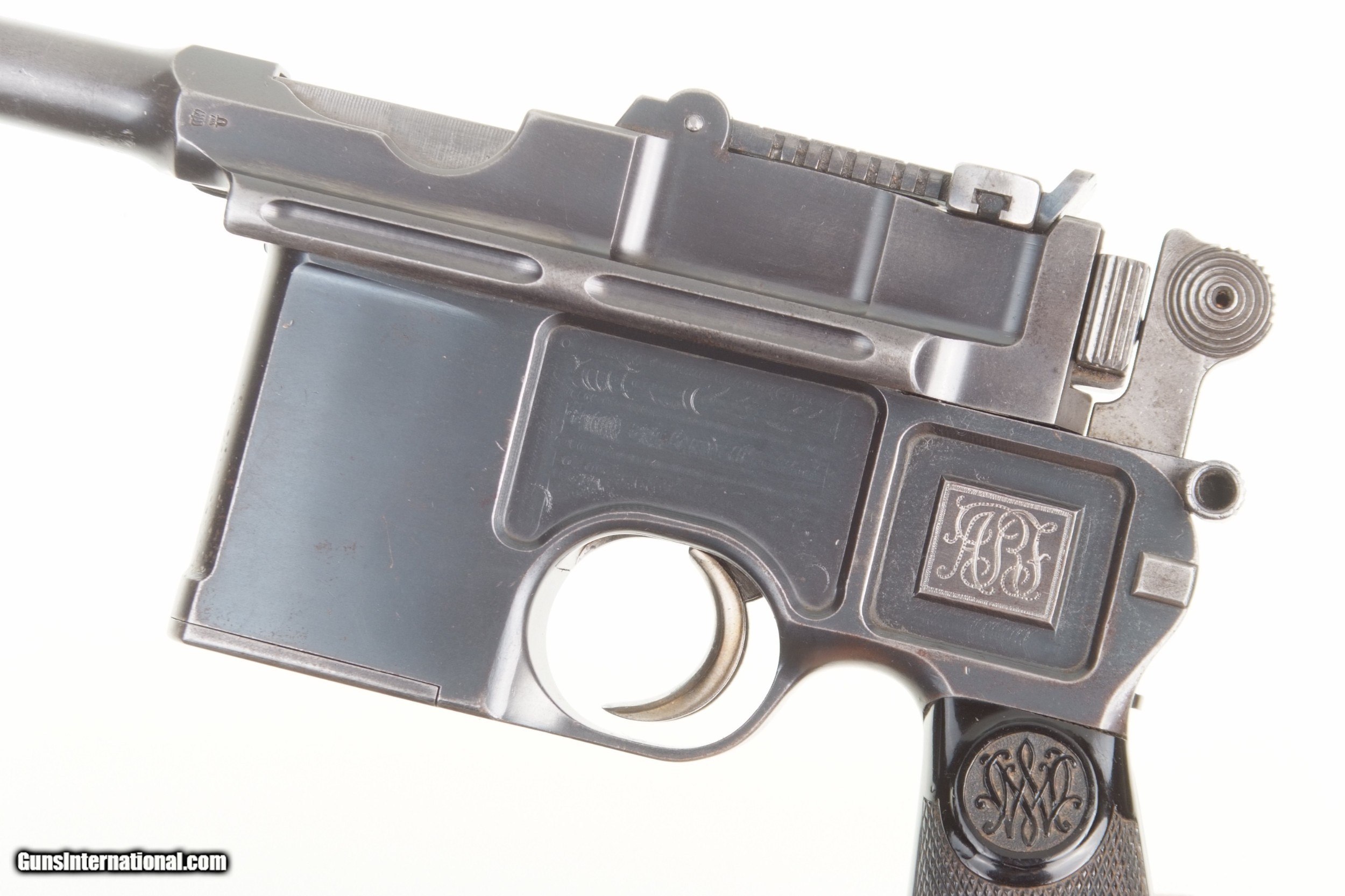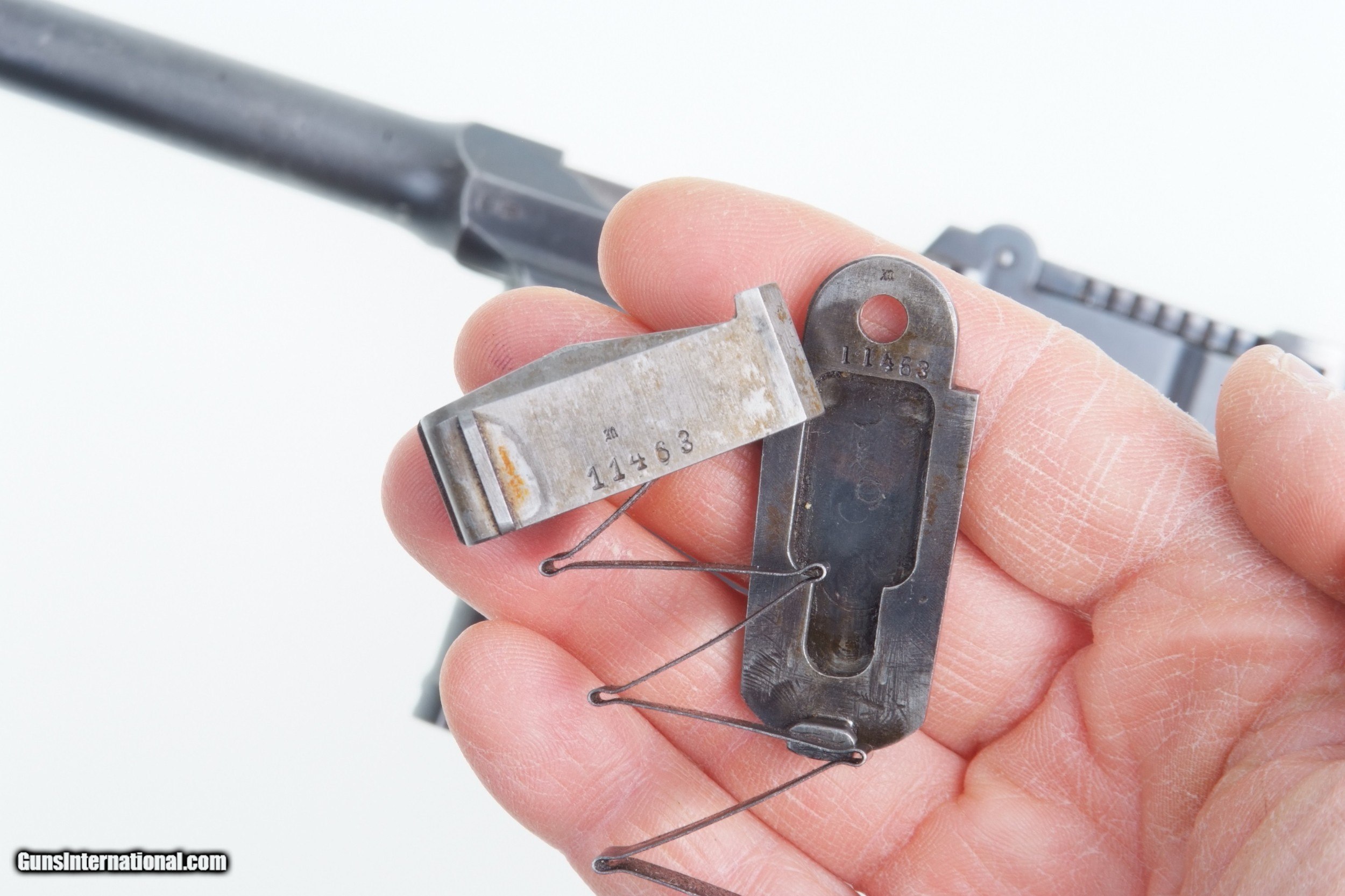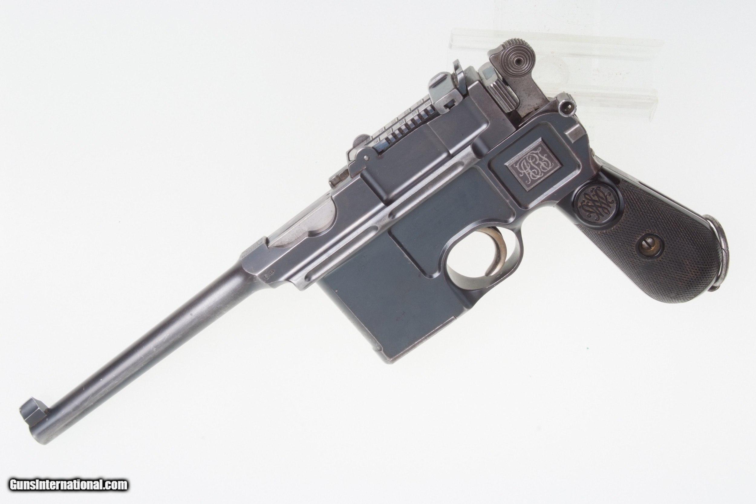 Description: Attractive, original condition Mauser Conehammer, late production, all matching parts, with silver inlayed initials and HR grips. SN: 11463. Cal. 7.63mm. Standard features having 5.5 in. barrel and 50-500 pinned sight. Usual chamber address with Crown/Crown/U on left side of barrel extension and antler proof on right side. Full serial number on bolt, firing pin retainer, and back of frame with last four digits on back of hammer. Silver inlayed “ARF”, finely bordered, on left rear panel. Detailed disassembly shows all usually numbered components matched to the serial number including each of the lightly scribed grip panels. Major parts are rust blued. Most minor parts are heat treated to fire blue with the bolt and trigger assembly in the white and the hammer grey case hardened. Hard rubber “MW” logo grips. Replacement lanyard ring present. Condition: VG+ original rust blue with usual sharp edge wear and rub marks in the usual locations. VG+ fire blue showing no enhancement. Comparable condition hard rubber grips with areas of blunted checkering but no splits. Dull bore with easily discernable rifling. Perfect manual mechanics. A very nice, original Conehammer with interesting personalization and the seldom seem hard rubber grips. ANTIQUE. A HISTORIC INVESTMENT! Buyer pays $40.00 shipping SOLD Curio/Relic: Yes Antique: Yes Manufacturer: Mauser Model: C96 |
