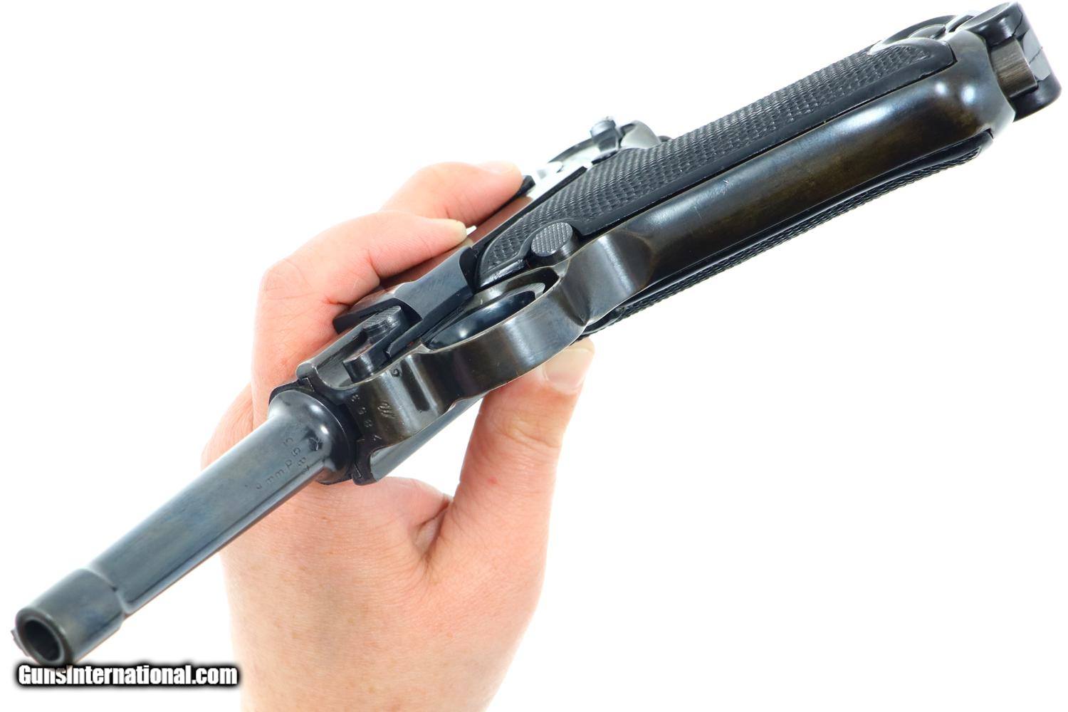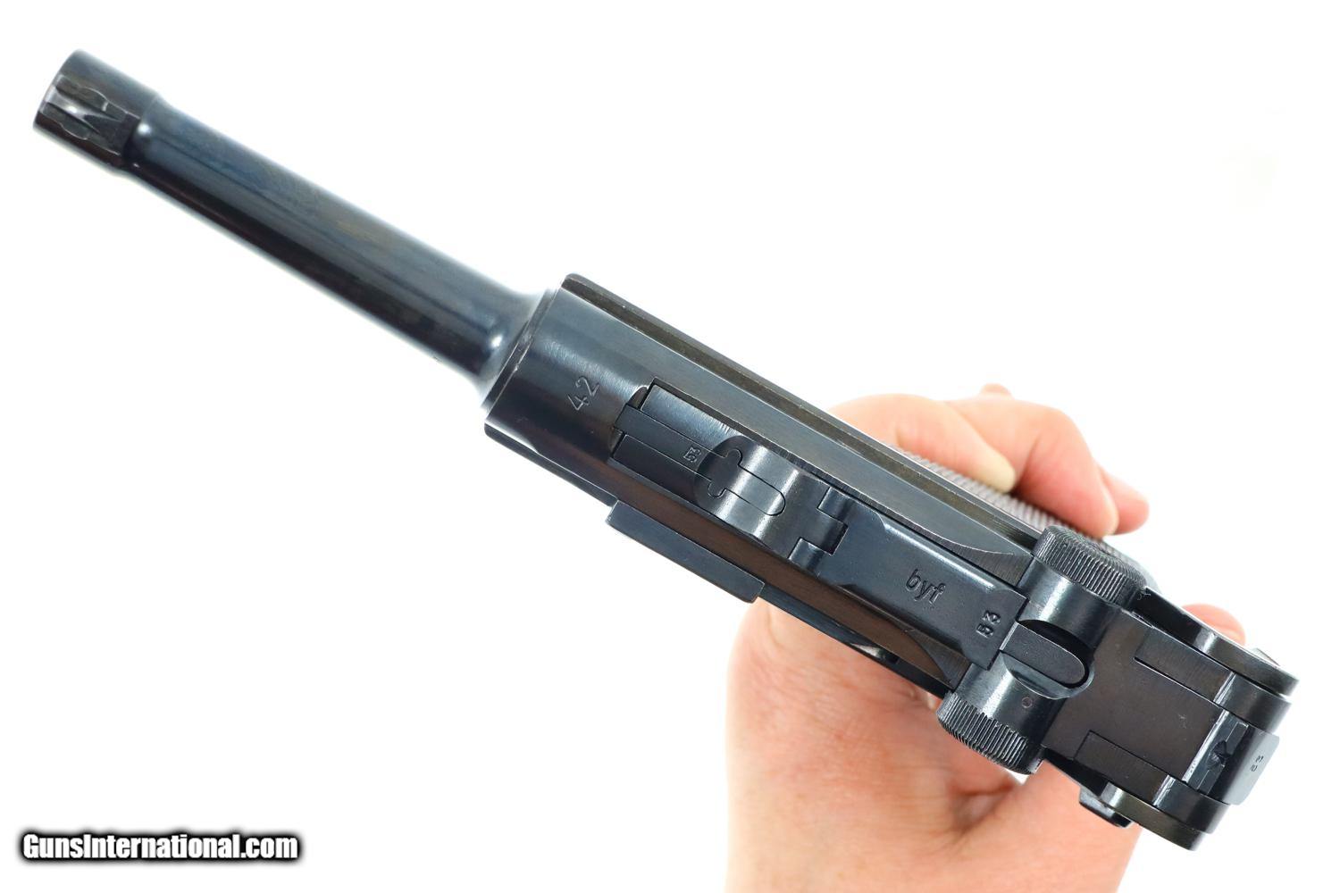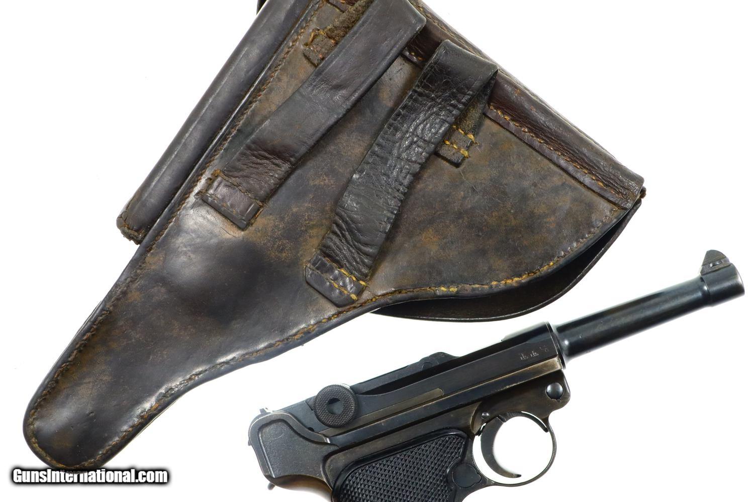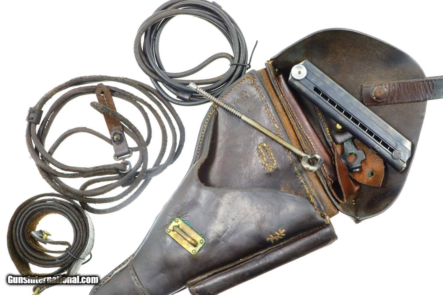 Description: Synopsis: Mauser, German, P08 Luger, Military, 2853n, FB00798 Description: Mauser Black Widow Luger made in 1942, coded byf, with holster, spare extruded magazine, cleaning rod, takedown tool, two lanyard cords and strap. This standard configuration gun has a 5 inch barrel with drift adjustable front sight and “V” notched rear sight. Chamber dated “42”, toggle linkage with byf code. Full serial number on forward frame, under barrel, and on left side of barrel extention, last two digits on all the usual matching parts except for the holdopen that is numbered “62”. Caliber additionally noted under barrel. Scattered post war German proofs, most notable inside frame. Original unnumbered grips. Neither of the fxo extruded magazines have a numbered base, the aluminum base having been struck with a facisimile acceptance. Additional markings include the caliber under the barrel and post war German proofing in usual locations. US import marks as photographed. Complete with repaired holster, two leather lanyard cords and strap. Condition: VG as refurbished with holster and handling wear in expected locations. The holdopen has no visible defects but does not function with either magazine, the aluminum base magazine is difficult to remove after insertion. Mirror bright bore. Cocks, fires upon trigger pull, the safety blocking sear properly. Holster is oil soaked with takedown, cleaning rod pockets, and lid having been restitched. A nice ensemble though one that will need some work to function properly. ~~Insured shipping fee of $65; most packages shipped using FedEx 2nd Day.~~ SOLD Manufacturer: Mauser Serial Number: 2853n Caliber Info: 9mmP |