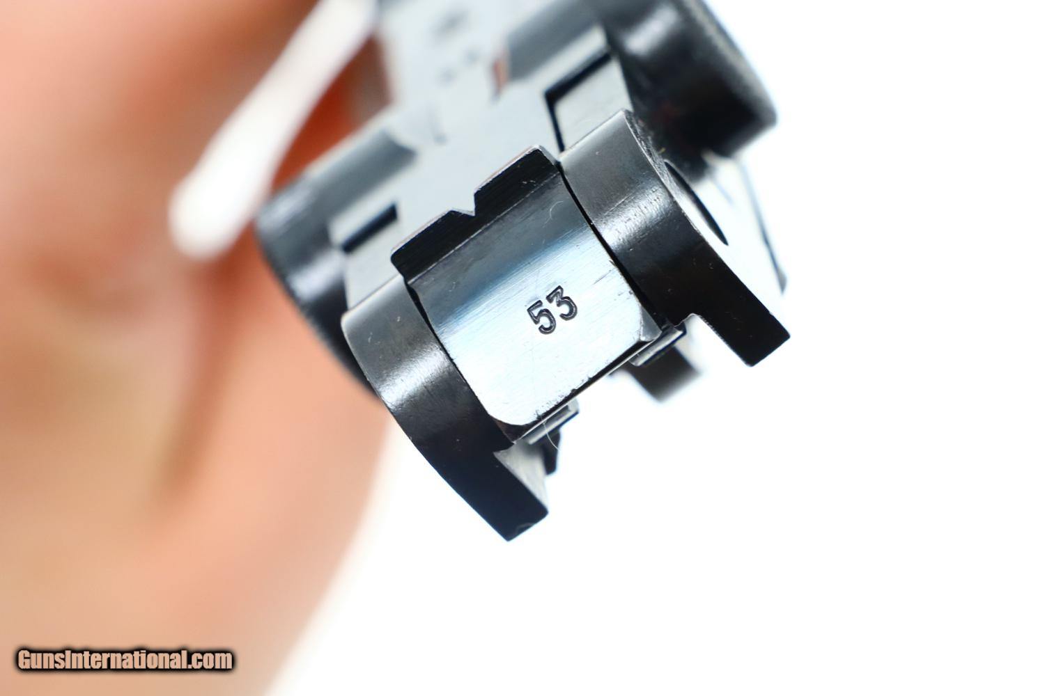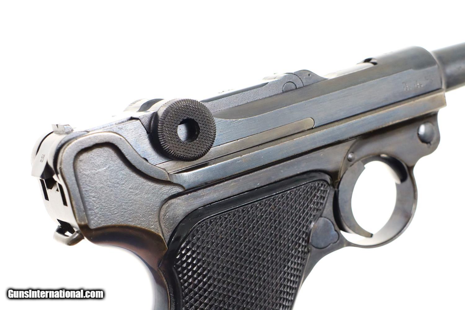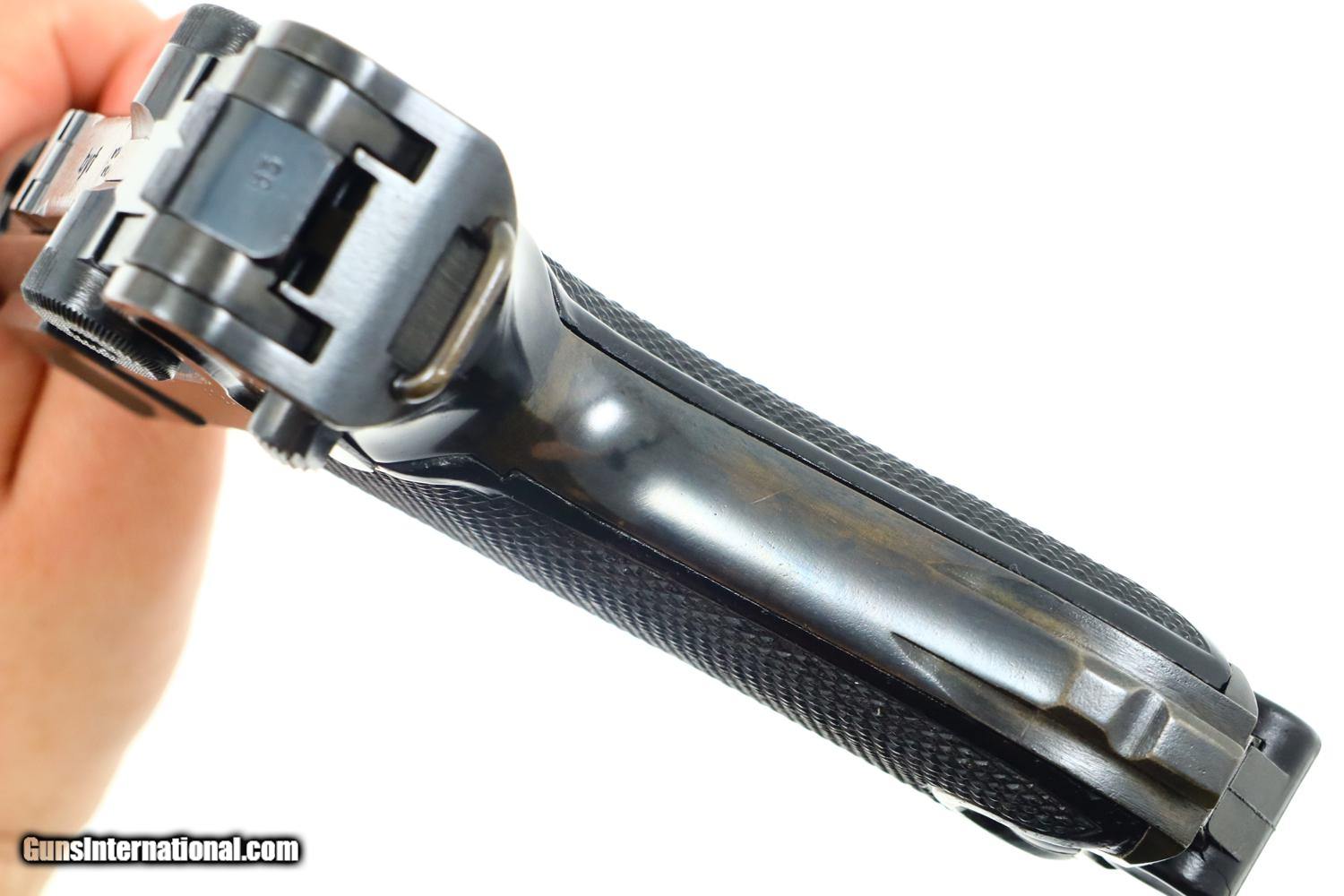 Description: Synopsis: Mauser, German, P08 Luger, Military, 2853n, FB00798 Description: Mauser Black Widow Luger made in 1942, coded byf, with holster, spare extruded magazine, cleaning rod, takedown tool, two lanyard cords and strap. This standard configuration gun has a 5 inch barrel with drift adjustable front sight and “V” notched rear sight. Chamber dated “42”, toggle linkage with byf code. Full serial number on forward frame, under barrel, and on left side of barrel extention, last two digits on all the usual matching parts except for the holdopen that is numbered “62”. Caliber additionally noted under barrel. Scattered post war German proofs, most notable inside frame. Original unnumbered grips. Neither of the fxo extruded magazines have a numbered base, the aluminum base having been struck with a facisimile acceptance. Additional markings include the caliber under the barrel and post war German proofing in usual locations. US import marks as photographed. Complete with repaired holster, two leather lanyard cords and strap. Condition: VG as refurbished with holster and handling wear in expected locations. The holdopen has no visible defects but does not function with either magazine, the aluminum base magazine is difficult to remove after insertion. Mirror bright bore. Cocks, fires upon trigger pull, the safety blocking sear properly. Holster is oil soaked with takedown, cleaning rod pockets, and lid having been restitched. A nice ensemble though one that will need some work to function properly. ~~Insured shipping fee of $65; most packages shipped using FedEx 2nd Day.~~ SOLD Manufacturer: Mauser Serial Number: 2853n Caliber Info: 9mmP |