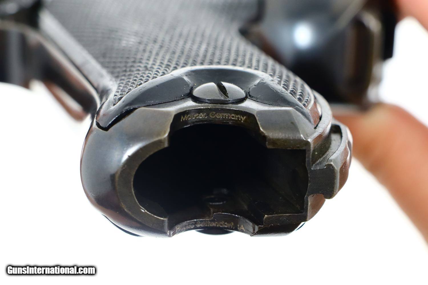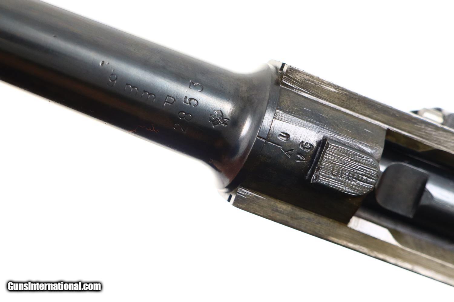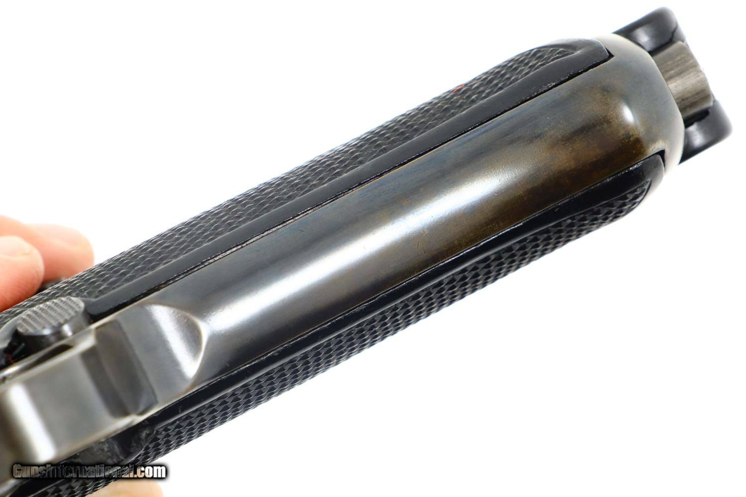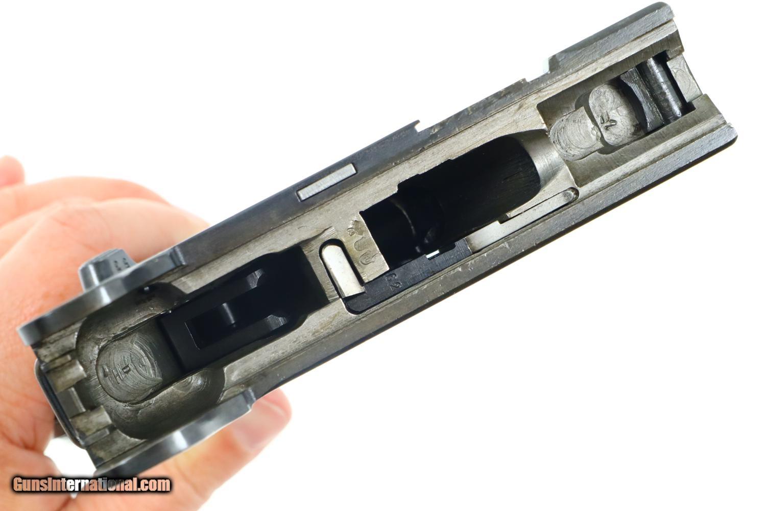 Description: Synopsis: Mauser, German, P08 Luger, Military, 2853n, FB00798 Description: Mauser Black Widow Luger made in 1942, coded byf, with holster, spare extruded magazine, cleaning rod, takedown tool, two lanyard cords and strap. This standard configuration gun has a 5 inch barrel with drift adjustable front sight and “V” notched rear sight. Chamber dated “42”, toggle linkage with byf code. Full serial number on forward frame, under barrel, and on left side of barrel extention, last two digits on all the usual matching parts except for the holdopen that is numbered “62”. Caliber additionally noted under barrel. Scattered post war German proofs, most notable inside frame. Original unnumbered grips. Neither of the fxo extruded magazines have a numbered base, the aluminum base having been struck with a facisimile acceptance. Additional markings include the caliber under the barrel and post war German proofing in usual locations. US import marks as photographed. Complete with repaired holster, two leather lanyard cords and strap. Condition: VG as refurbished with holster and handling wear in expected locations. The holdopen has no visible defects but does not function with either magazine, the aluminum base magazine is difficult to remove after insertion. Mirror bright bore. Cocks, fires upon trigger pull, the safety blocking sear properly. Holster is oil soaked with takedown, cleaning rod pockets, and lid having been restitched. A nice ensemble though one that will need some work to function properly. ~~Insured shipping fee of $65; most packages shipped using FedEx 2nd Day.~~ SOLD Manufacturer: Mauser Serial Number: 2853n Caliber Info: 9mmP |