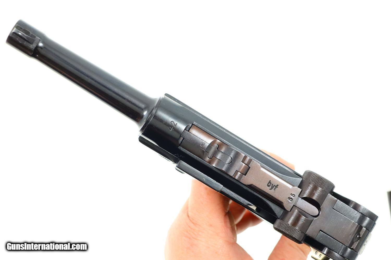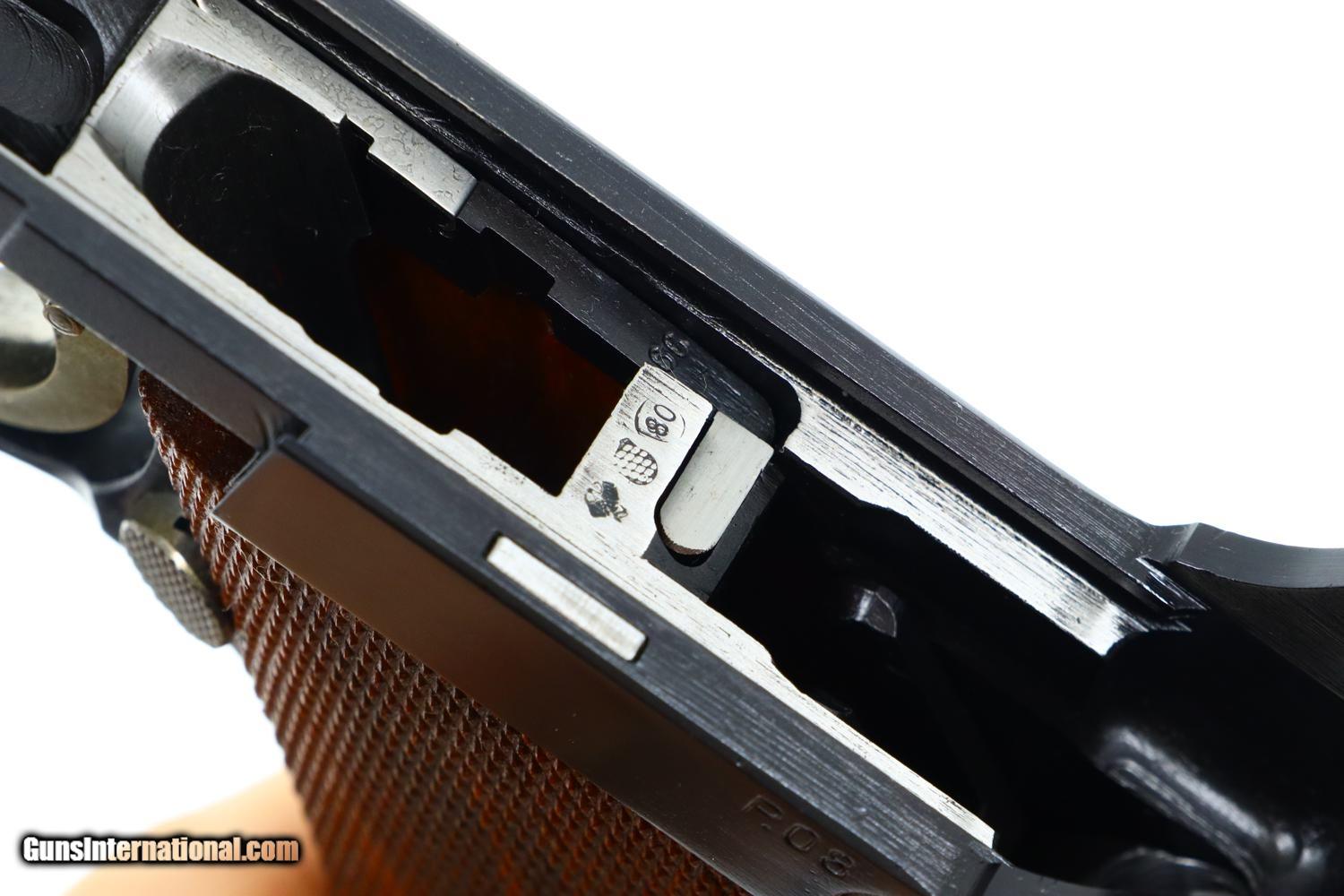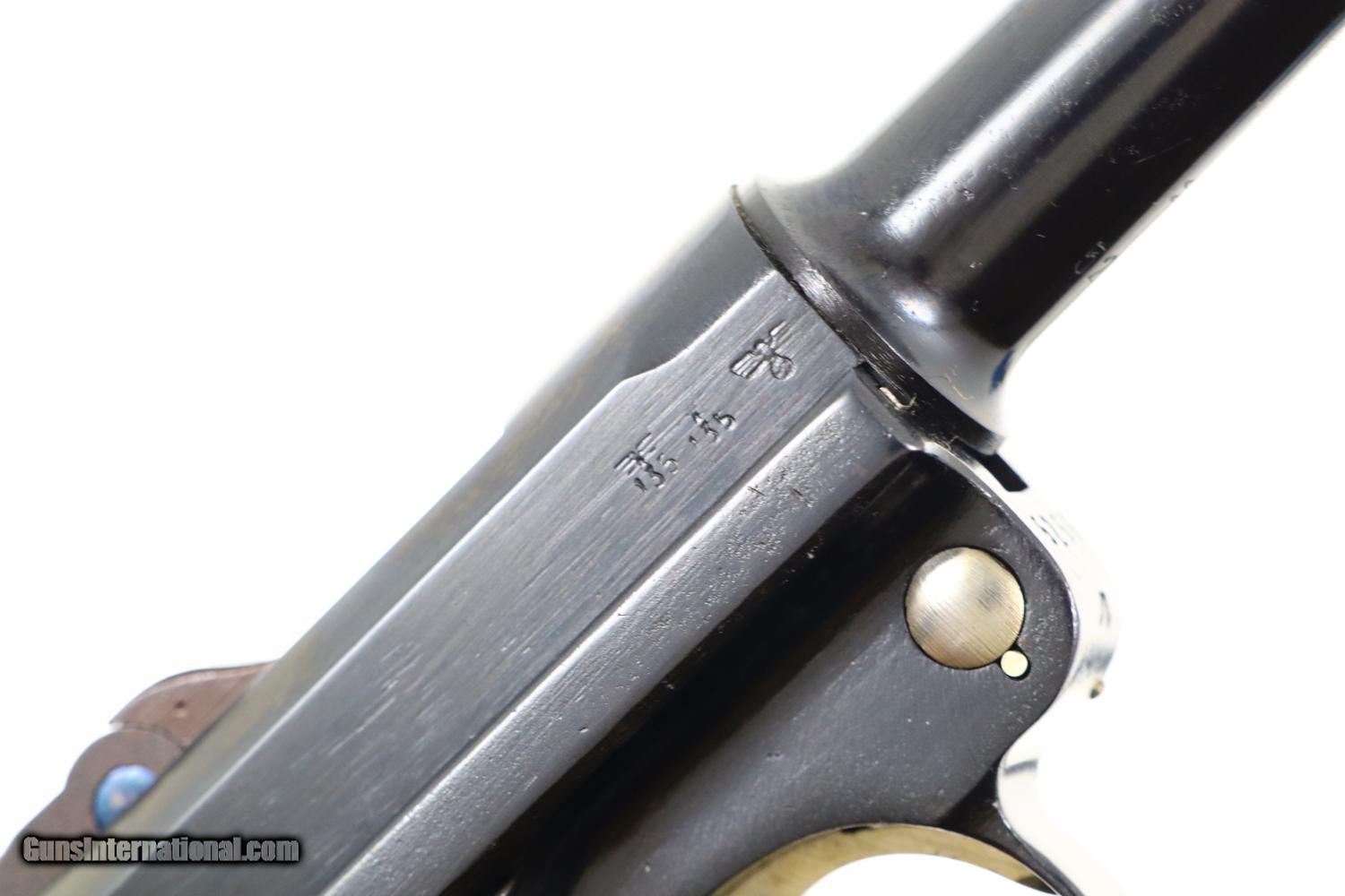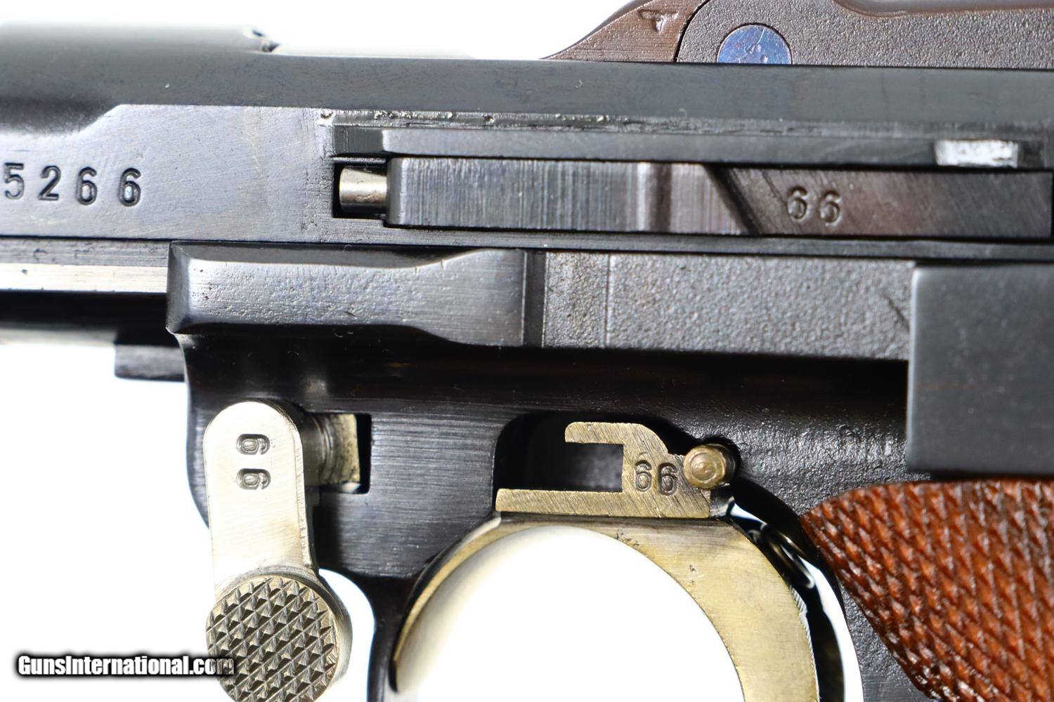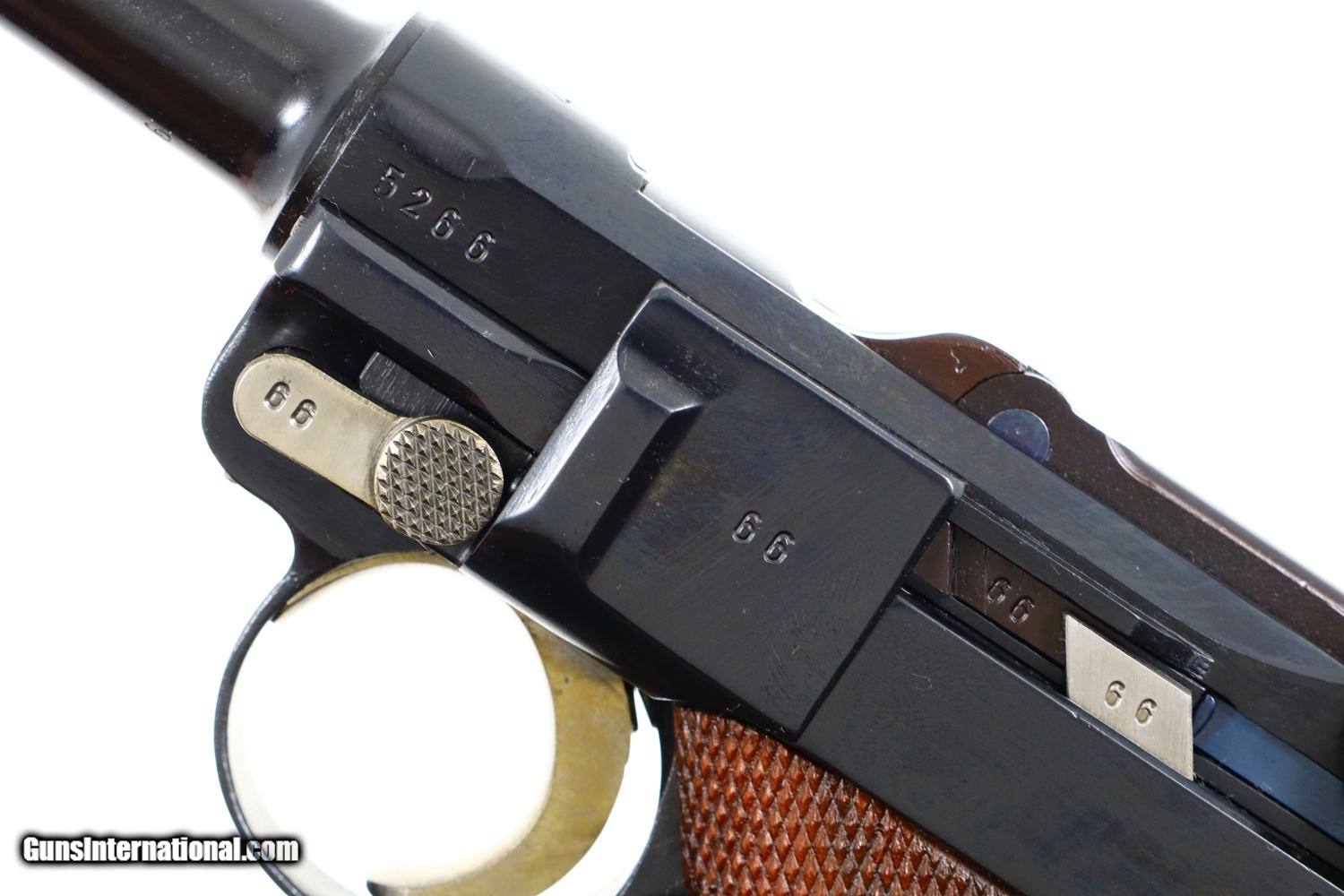 Description: Synopsis: Mauser, German P08 Military WWII Luger, 9mmP, 5266n, FB00756 Description: Mauser Luger made in 1942, a very attractive all matching restoration with reproduction grips and correct but unnumbered extruded magazine. This standard configuration gun has a 5 inch barrel with drift adjustable front sight, a “V” notched rear sight. Chamber dated “42”, toggle linkage with byf code. Full serial number on forward frame, under barrel, and on left side of barrel extention, last two digits on all the usuall matching parts except for an unnumbered rear toggle pin, magazine, and unnumbered reproduction grips. Additional markings include the caliber under the barrel and post war German proofing on the barred extention lug and inside frame adjacent to hold open. Import marks as photographed. Condition: Near 100% as refurbished with salt blue and strawed/fire blued small parts, the latter having been incorrectly restored as all small parts for this variation should also have been salt blued. Mirror bright bore. Perfect manual mechanics. A very desirable WWII luger sold as an attractive restoration! ~~Insured shipping fee of $65; most packages shipped using FedEx 2nd Day.~~ SOLD Curio/Relic: Yes Manufacturer: Mauser Serial Number: 5266n Caliber Info: 9mmP |