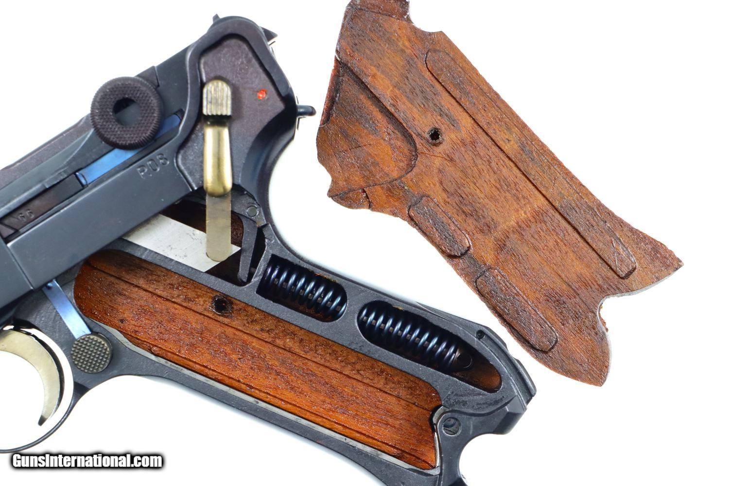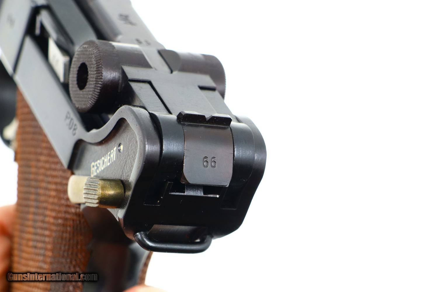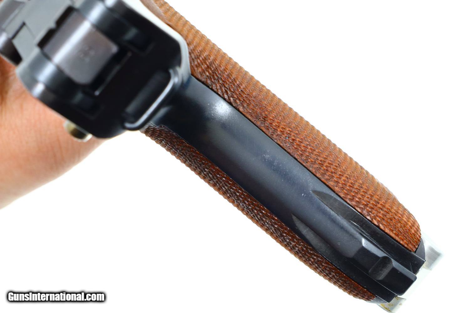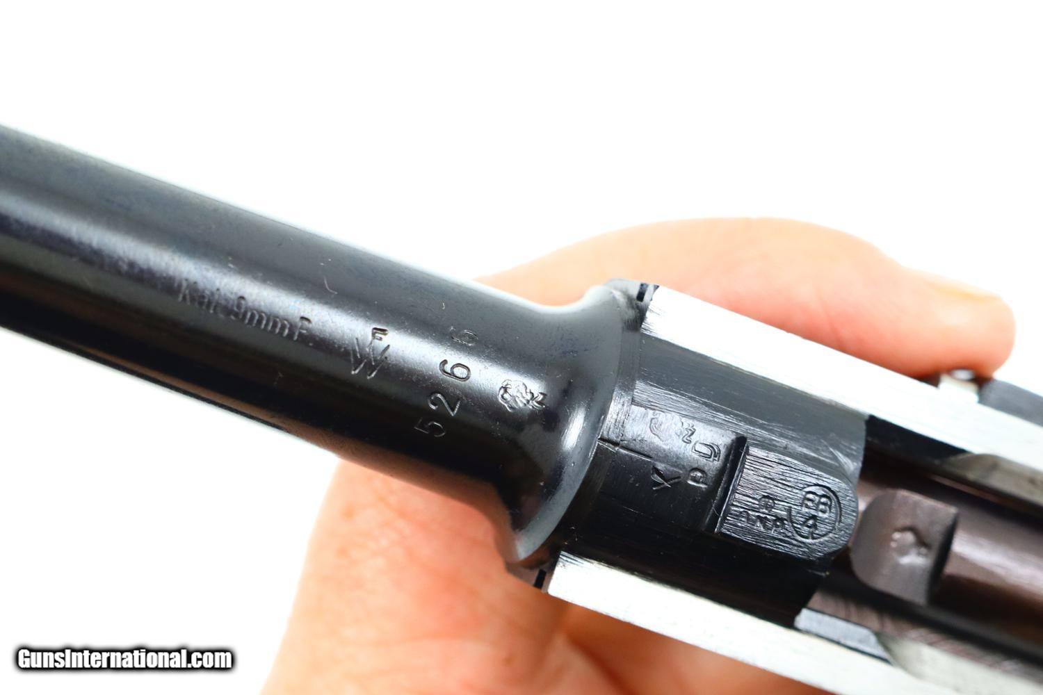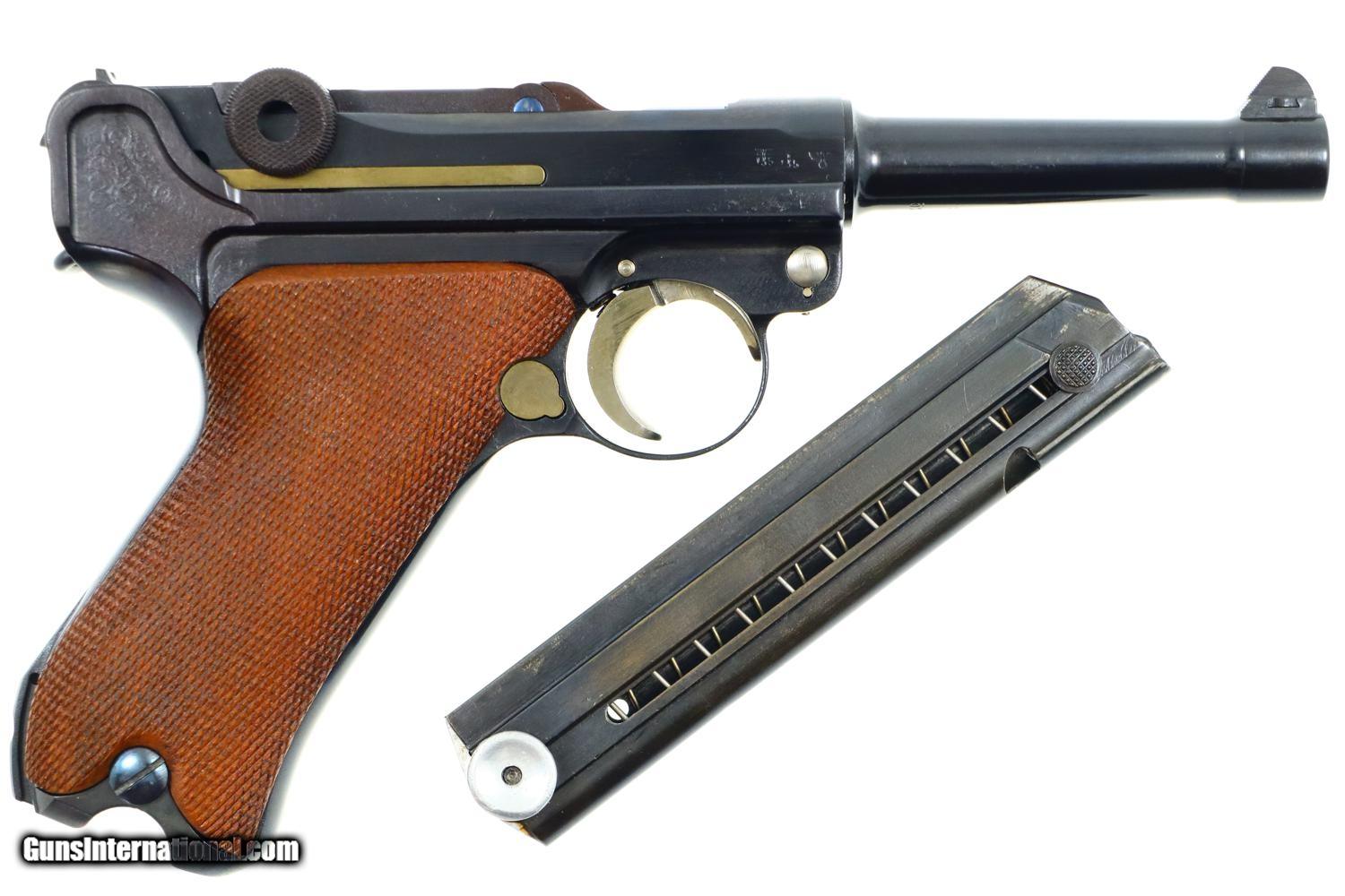 Description: Synopsis: Mauser, German P08 Military WWII Luger, 9mmP, 5266n, FB00756 Description: Mauser Luger made in 1942, a very attractive all matching restoration with reproduction grips and correct but unnumbered extruded magazine. This standard configuration gun has a 5 inch barrel with drift adjustable front sight, a “V” notched rear sight. Chamber dated “42”, toggle linkage with byf code. Full serial number on forward frame, under barrel, and on left side of barrel extention, last two digits on all the usuall matching parts except for an unnumbered rear toggle pin, magazine, and unnumbered reproduction grips. Additional markings include the caliber under the barrel and post war German proofing on the barred extention lug and inside frame adjacent to hold open. Import marks as photographed. Condition: Near 100% as refurbished with salt blue and strawed/fire blued small parts, the latter having been incorrectly restored as all small parts for this variation should also have been salt blued. Mirror bright bore. Perfect manual mechanics. A very desirable WWII luger sold as an attractive restoration! ~~Insured shipping fee of $65; most packages shipped using FedEx 2nd Day.~~ SOLD Curio/Relic: Yes Manufacturer: Mauser Serial Number: 5266n Caliber Info: 9mmP |
