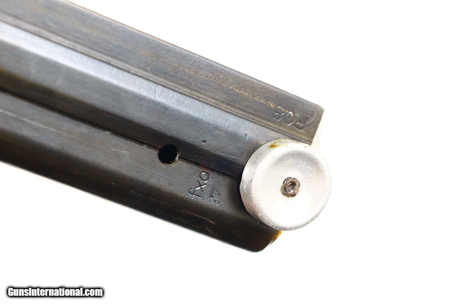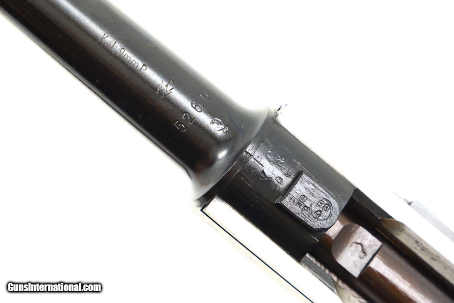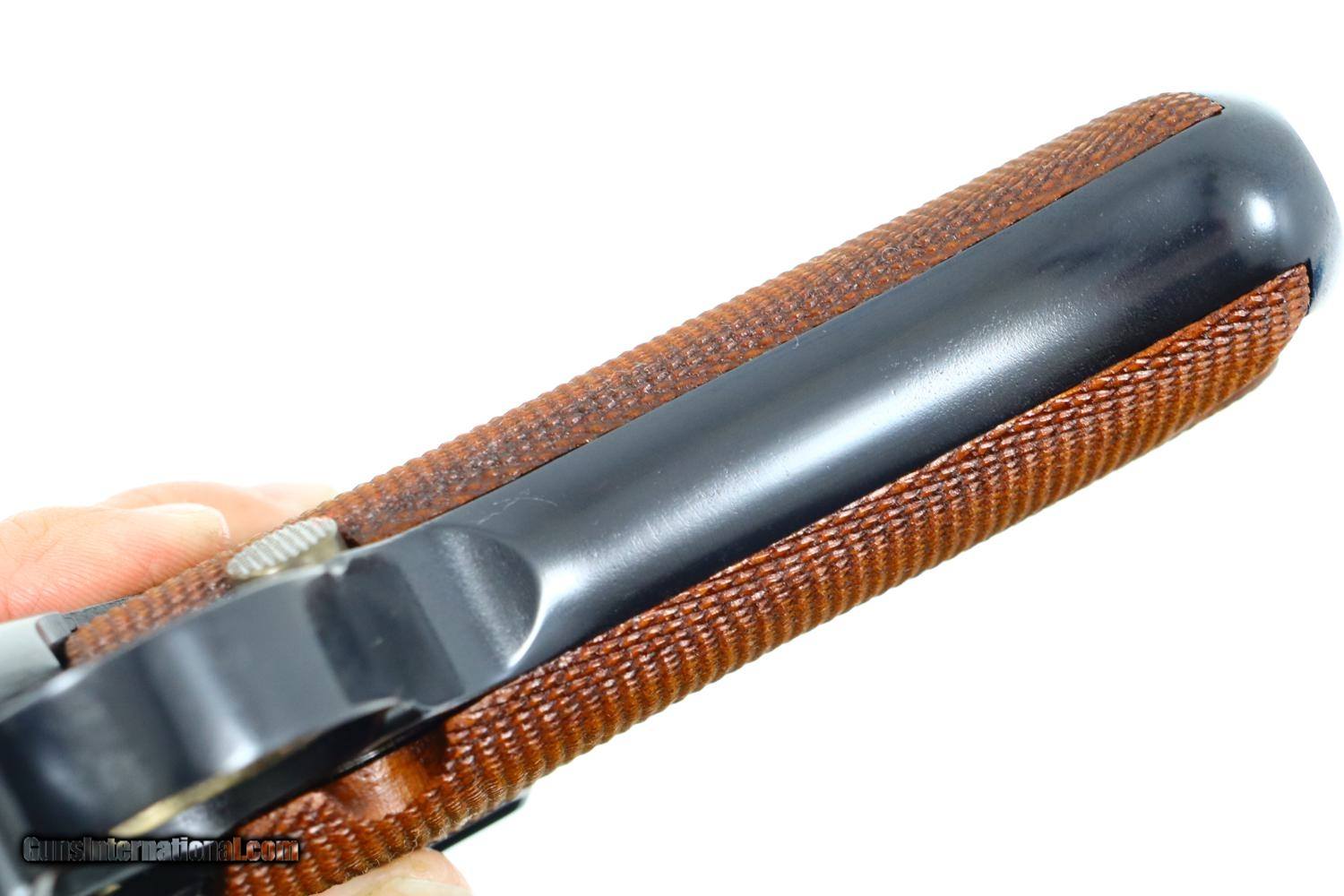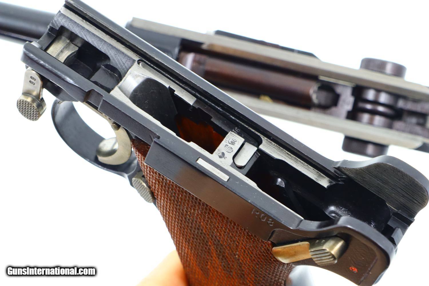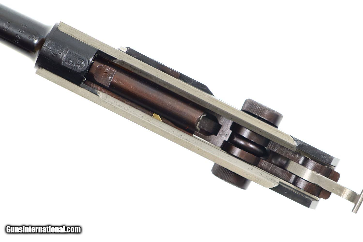 Description: Synopsis: Mauser, German P08 Military WWII Luger, 9mmP, 5266n, FB00756 Description: Mauser Luger made in 1942, a very attractive all matching restoration with reproduction grips and correct but unnumbered extruded magazine. This standard configuration gun has a 5 inch barrel with drift adjustable front sight, a “V” notched rear sight. Chamber dated “42”, toggle linkage with byf code. Full serial number on forward frame, under barrel, and on left side of barrel extention, last two digits on all the usuall matching parts except for an unnumbered rear toggle pin, magazine, and unnumbered reproduction grips. Additional markings include the caliber under the barrel and post war German proofing on the barred extention lug and inside frame adjacent to hold open. Import marks as photographed. Condition: Near 100% as refurbished with salt blue and strawed/fire blued small parts, the latter having been incorrectly restored as all small parts for this variation should also have been salt blued. Mirror bright bore. Perfect manual mechanics. A very desirable WWII luger sold as an attractive restoration! ~~Insured shipping fee of $65; most packages shipped using FedEx 2nd Day.~~ SOLD Curio/Relic: Yes Manufacturer: Mauser Serial Number: 5266n Caliber Info: 9mmP |