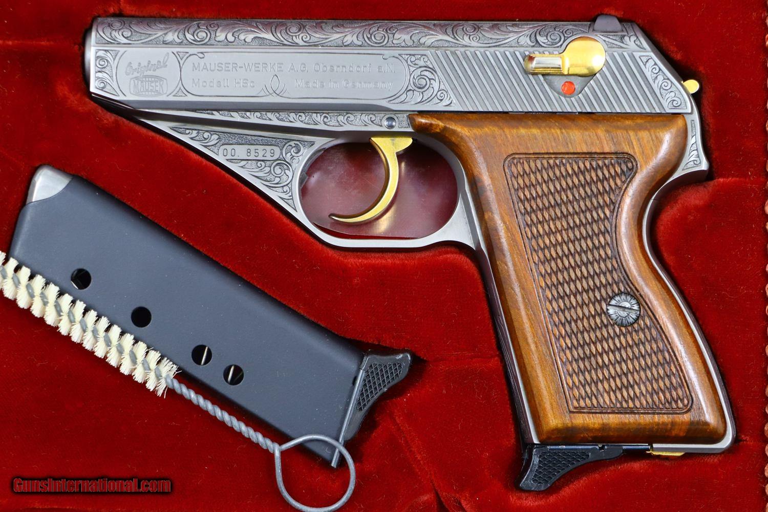 Description: Synopsis: Spectacular, Mauser, HSc, Factory Engraved, Presentation Case, 00.8529, FB00910 Description: Fabulous factory engraved Mauser Hsc, extensive scroll engraving with gold plated small parts in factory presentation case with a guarantee card and instruction manual. The pistol has standard post war HSc markings with the left slide “Original Mauser” followed by two line address reflecting model and its manufacturer in Germany. Exposed chamber marked with caliber 9mmKurz (.380 ACP). Full serial number on left side of frame and right side of slide with production year of “70” marked on the right side of the frame. At least 80% of the greyed surface covered in vegetal scroll, highlighting the required factory markings. Small parts gold plated. Standard wood grips with impressed checkering, the grip screws engraved in a complementary pattern. Magazines with blued bodies and black plastic finger extensions. Guarantee card, instruction manual. Ensemble in brown leatheret hard case, Mauser in gold foil on lid, burgandy lined, base, bordered in corded trim, compartmentalized for pistol, spare magazine and cleaning rod. Condition: Entire set presents as new. An extraordinarily rare factory engraved post war Mauser HSc that would be impossible to upgrade. A real gem by any metric. ~~Insured shipping fee of $155; most packages shipped using FedEx 2nd Day.~~ SOLD Manufacturer: Mauser Serial Number: 0.8529 Caliber Info: 9mmKurz |