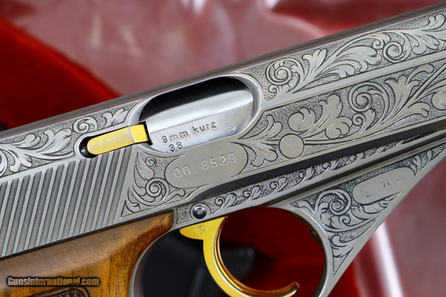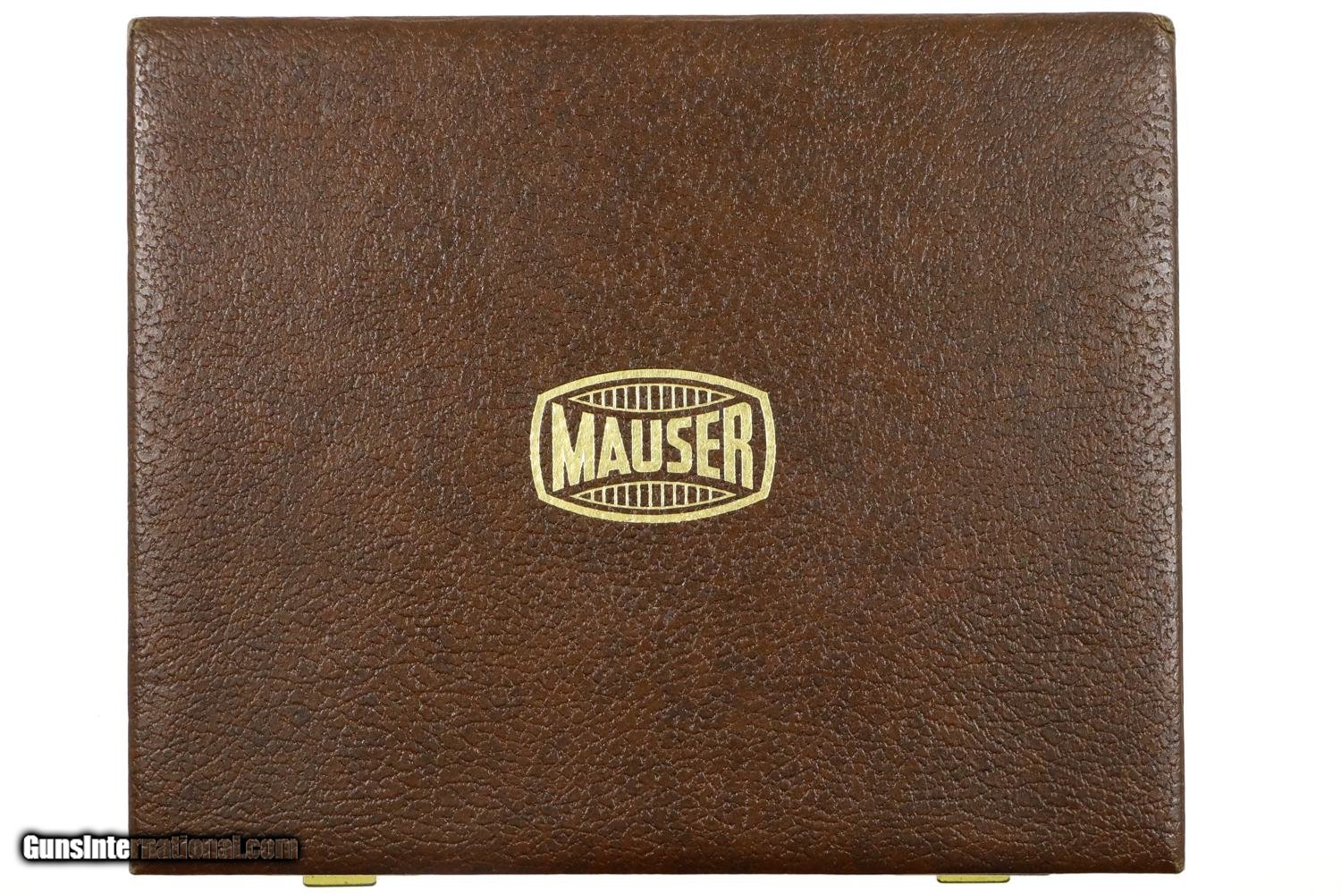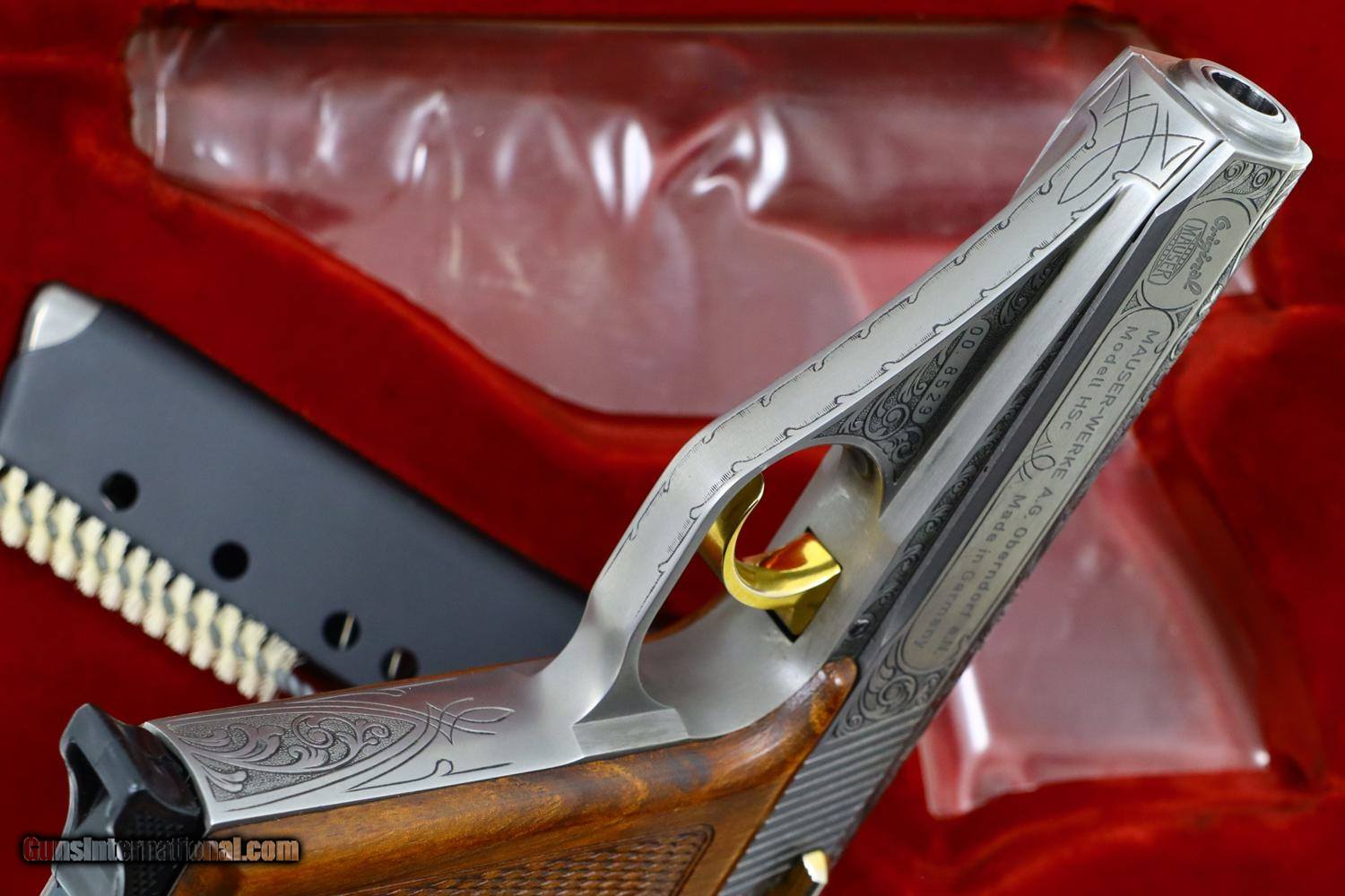 Description: Synopsis: Spectacular, Mauser, HSc, Factory Engraved, Presentation Case, 00.8529, FB00910 Description: Fabulous factory engraved Mauser Hsc, extensive scroll engraving with gold plated small parts in factory presentation case with a guarantee card and instruction manual. The pistol has standard post war HSc markings with the left slide “Original Mauser” followed by two line address reflecting model and its manufacturer in Germany. Exposed chamber marked with caliber 9mmKurz (.380 ACP). Full serial number on left side of frame and right side of slide with production year of “70” marked on the right side of the frame. At least 80% of the greyed surface covered in vegetal scroll, highlighting the required factory markings. Small parts gold plated. Standard wood grips with impressed checkering, the grip screws engraved in a complementary pattern. Magazines with blued bodies and black plastic finger extensions. Guarantee card, instruction manual. Ensemble in brown leatheret hard case, Mauser in gold foil on lid, burgandy lined, base, bordered in corded trim, compartmentalized for pistol, spare magazine and cleaning rod. Condition: Entire set presents as new. An extraordinarily rare factory engraved post war Mauser HSc that would be impossible to upgrade. A real gem by any metric. ~~Insured shipping fee of $155; most packages shipped using FedEx 2nd Day.~~ SOLD Manufacturer: Mauser Serial Number: 0.8529 Caliber Info: 9mmKurz |
