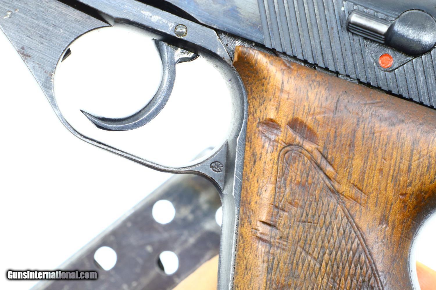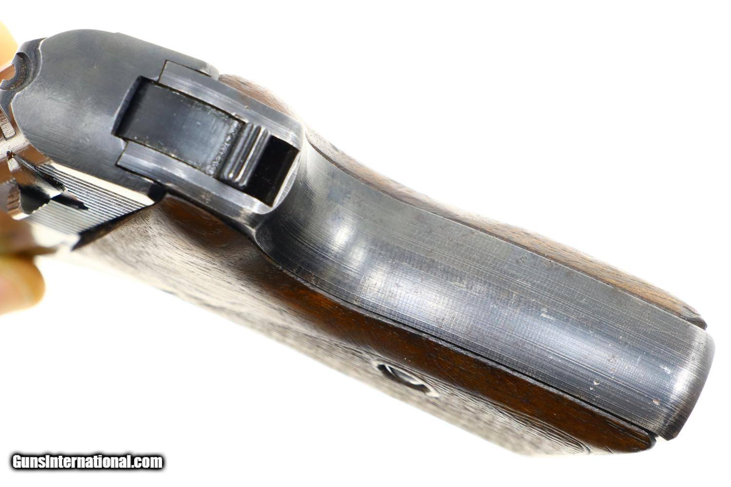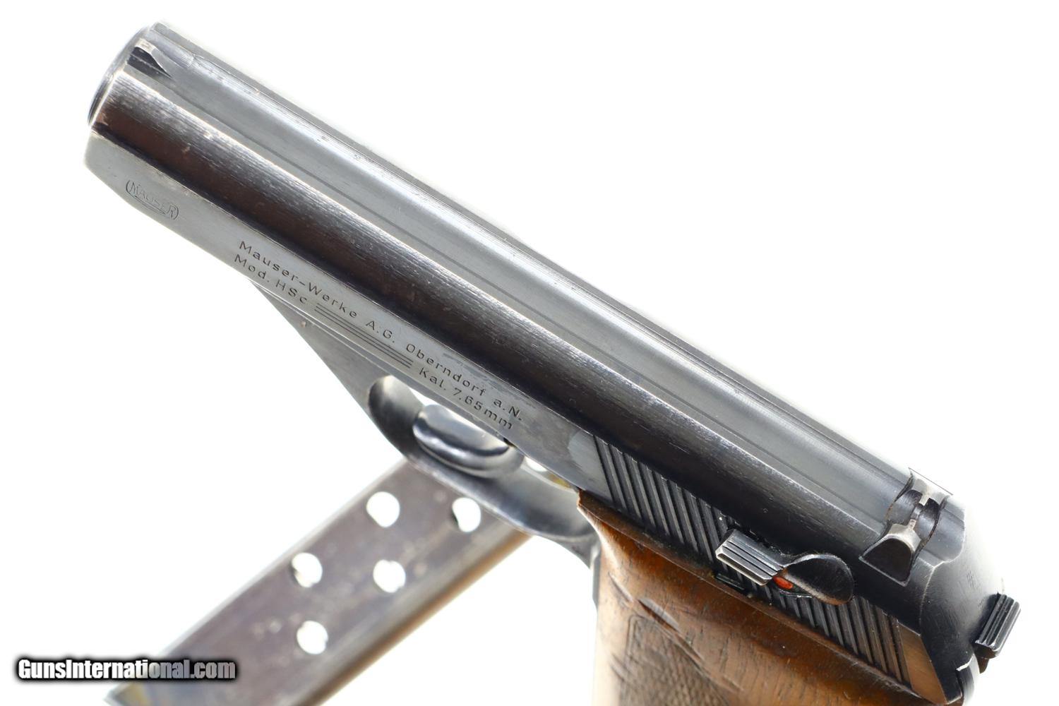 Description: Synopsis: Mauser Hsc, French Assembly, 967000, A-1850 Description: This Mauser HSc was assembled using Nazi-era parts after WII by the French. The left side if the slide has the Mauser banner followed by the late war 2-line address referencing the manufacturer, model and caliber. Safety with “S” and red dot (fire). Full serial number on bottom of front strap with French assembly inspection on the left side of the trigger guard web. Walnut panels with impressed checkering. Correct magazine with 7 indicator holes and unmarked, round nose floorplate. Disassembly shows an unnumbered slide and barrel marked “846”. Condition: Good original blue with wear pattern reflecting moderate-heavy use. Comparable condition grips, dark, oil stained with numberous handling marks, the left panel missing a small chip at forward tip. Comparable condition magazine. Correct manual mechanics. Mirror bore. ~~Insured shipping fee of $45; most packages shipped using FedEx 2nd Day.~~ SOLD Manufacturer: Mauser Serial Number: 967000 Caliber Info: 7.65mm |