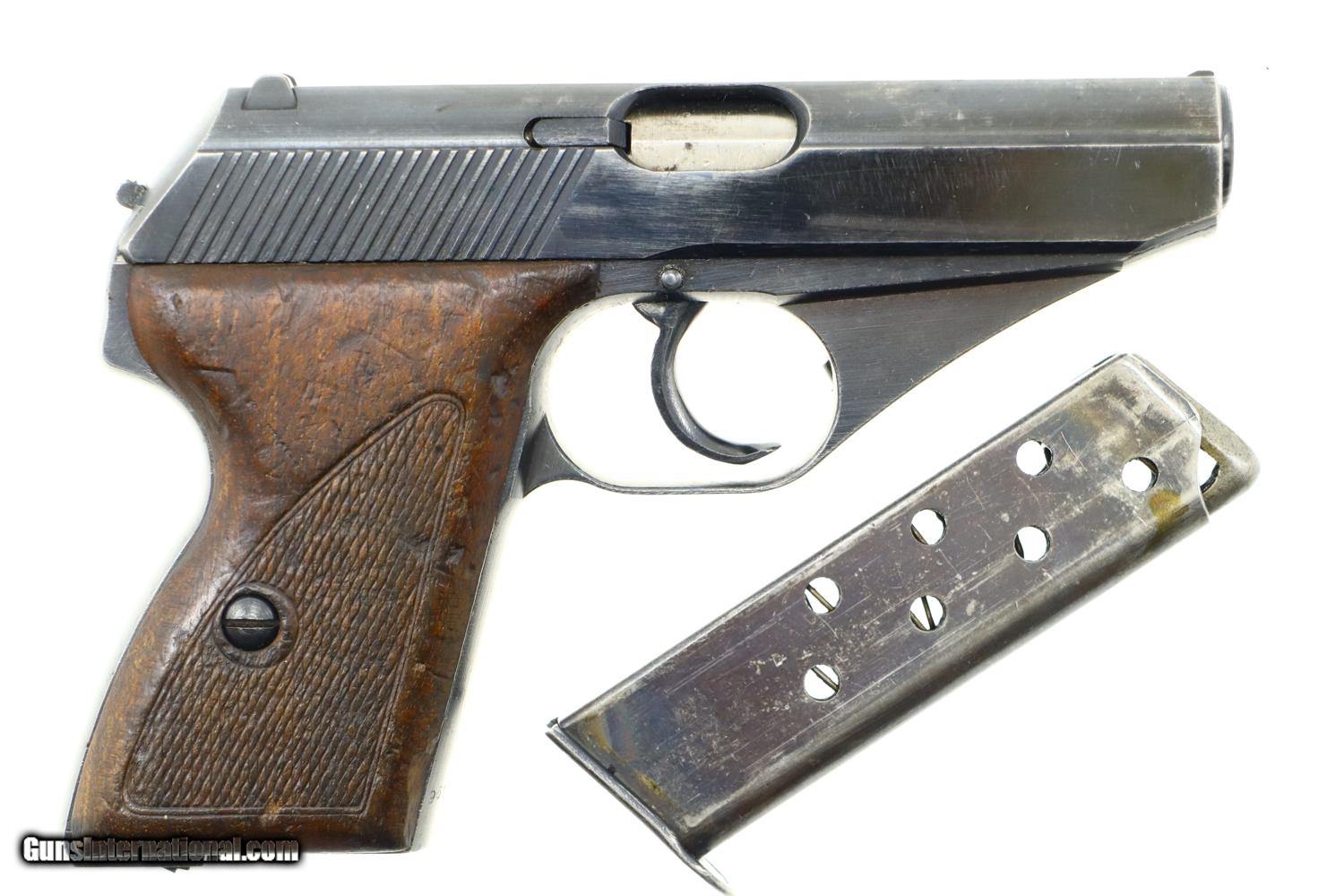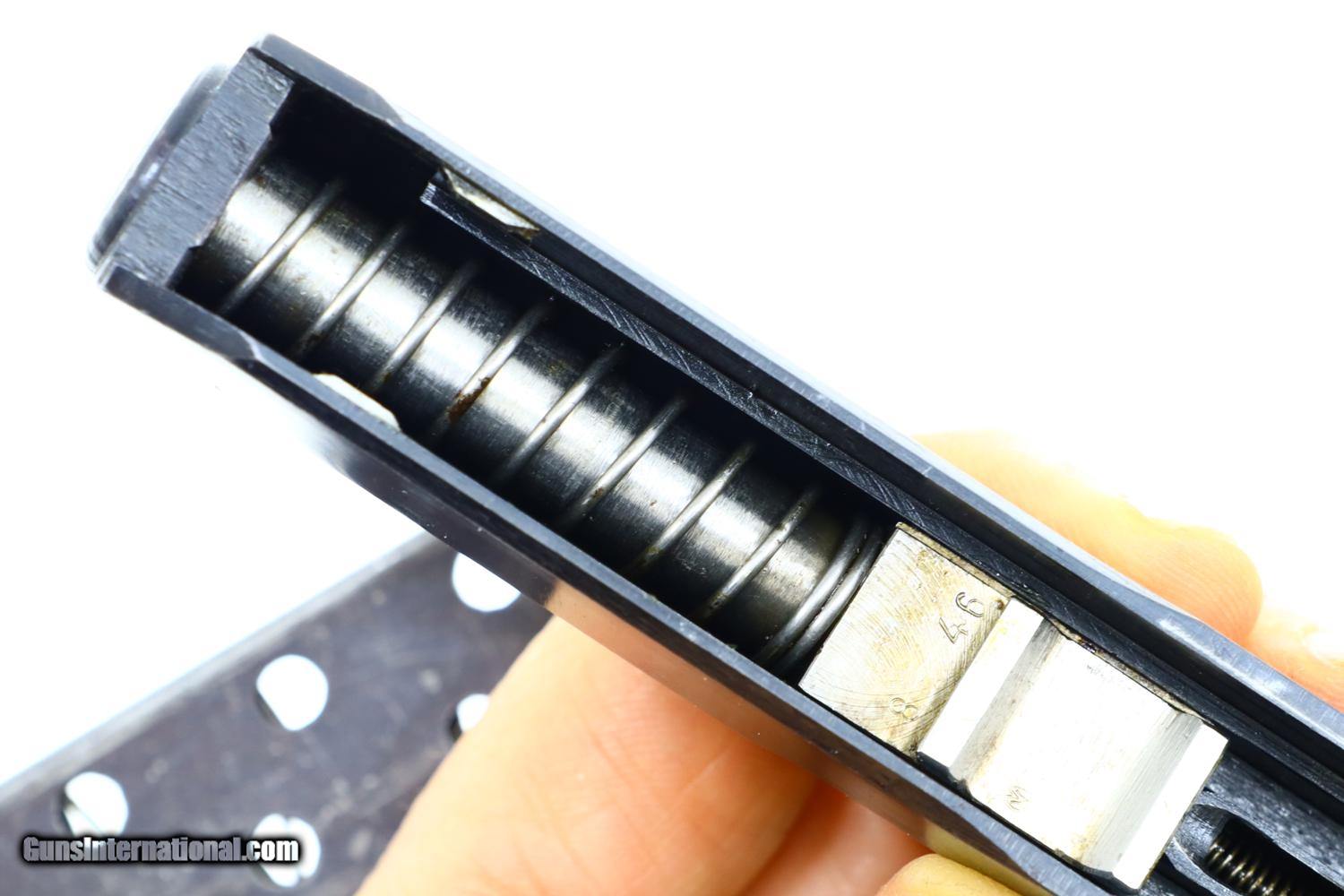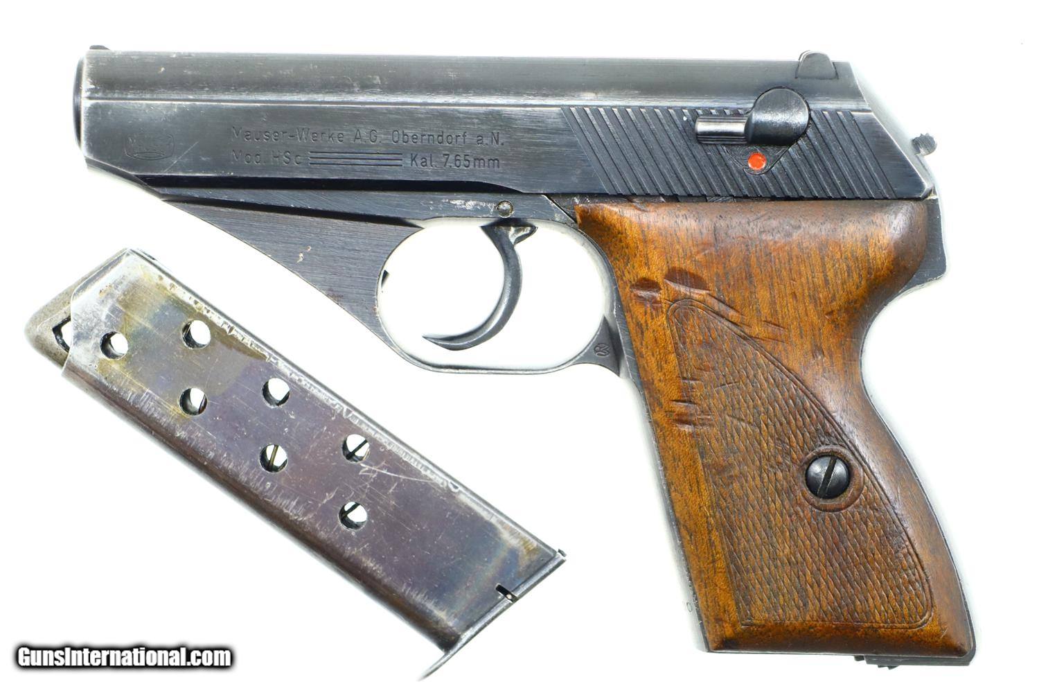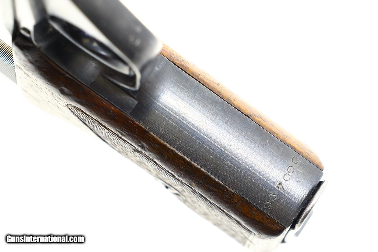 Description: Synopsis: Mauser Hsc, French Assembly, 967000, A-1850 Description: This Mauser HSc was assembled using Nazi-era parts after WII by the French. The left side if the slide has the Mauser banner followed by the late war 2-line address referencing the manufacturer, model and caliber. Safety with “S” and red dot (fire). Full serial number on bottom of front strap with French assembly inspection on the left side of the trigger guard web. Walnut panels with impressed checkering. Correct magazine with 7 indicator holes and unmarked, round nose floorplate. Disassembly shows an unnumbered slide and barrel marked “846”. Condition: Good original blue with wear pattern reflecting moderate-heavy use. Comparable condition grips, dark, oil stained with numberous handling marks, the left panel missing a small chip at forward tip. Comparable condition magazine. Correct manual mechanics. Mirror bore. ~~Insured shipping fee of $45; most packages shipped using FedEx 2nd Day.~~ SOLD Manufacturer: Mauser Serial Number: 967000 Caliber Info: 7.65mm |