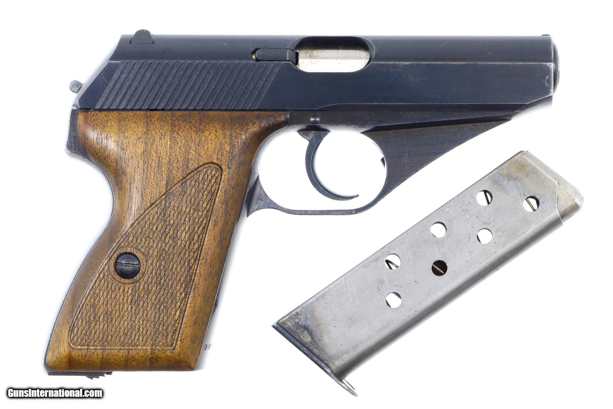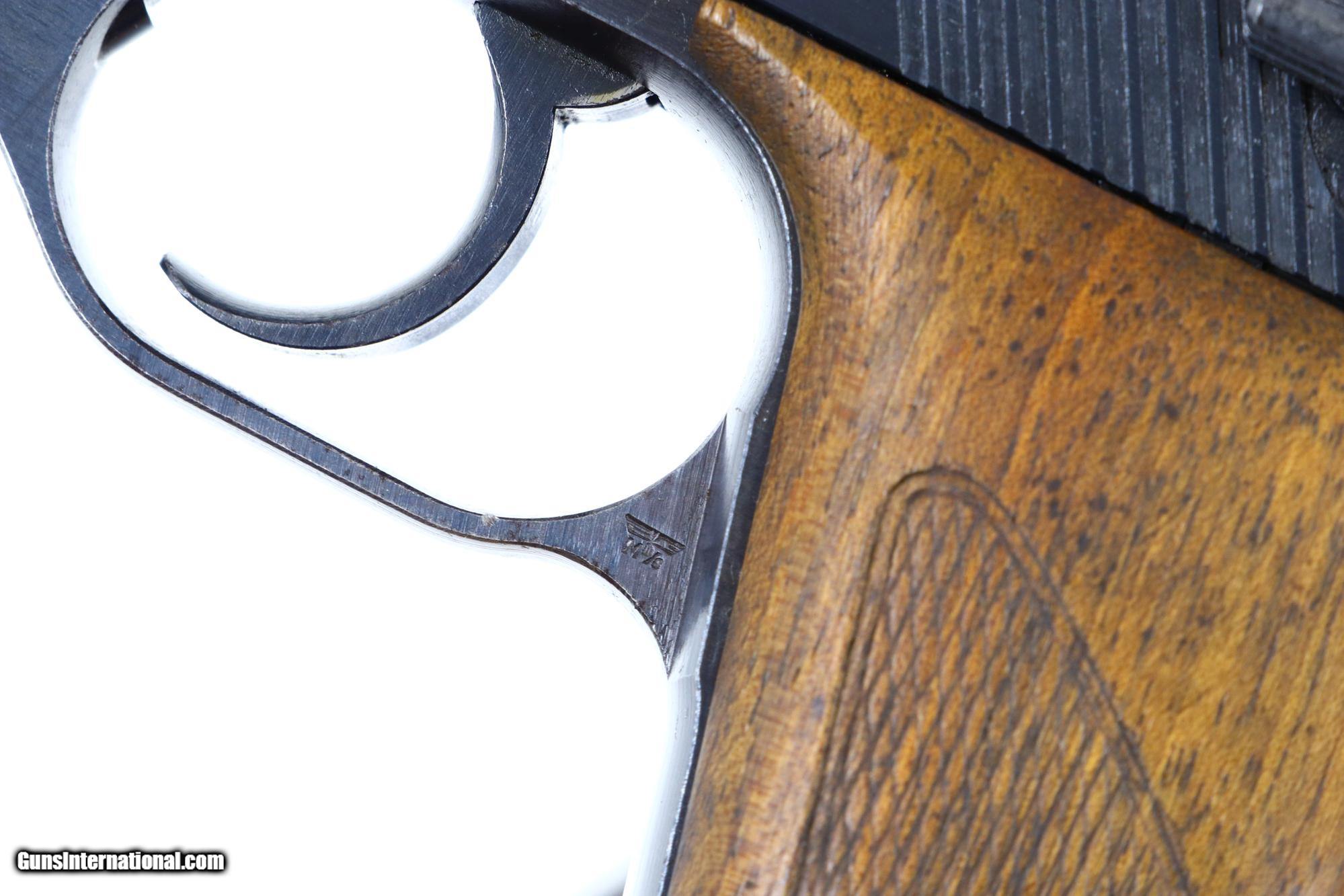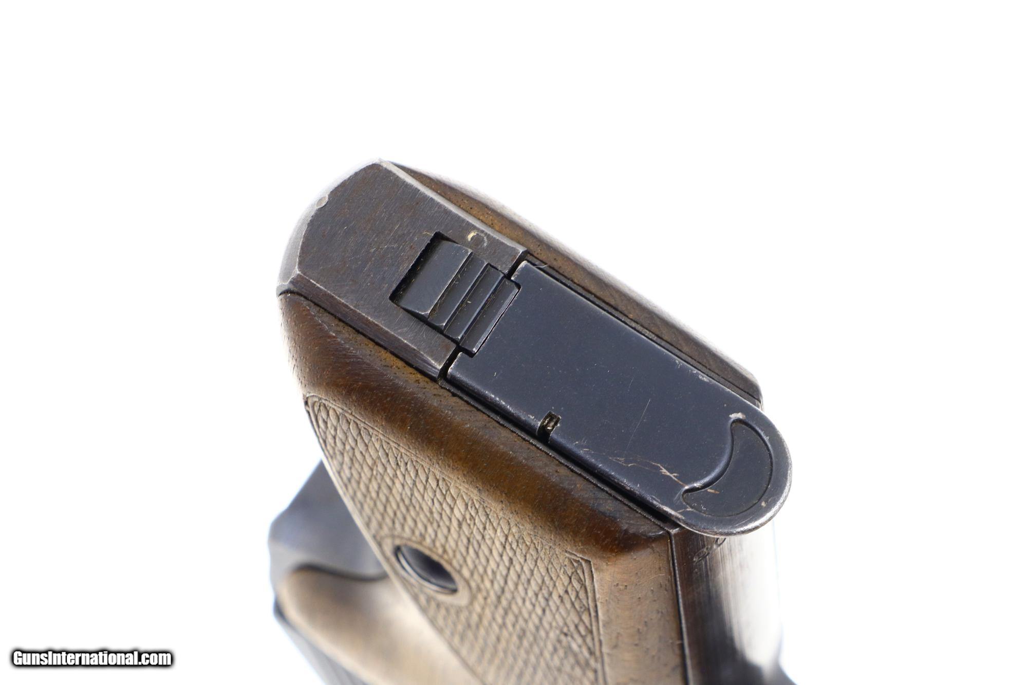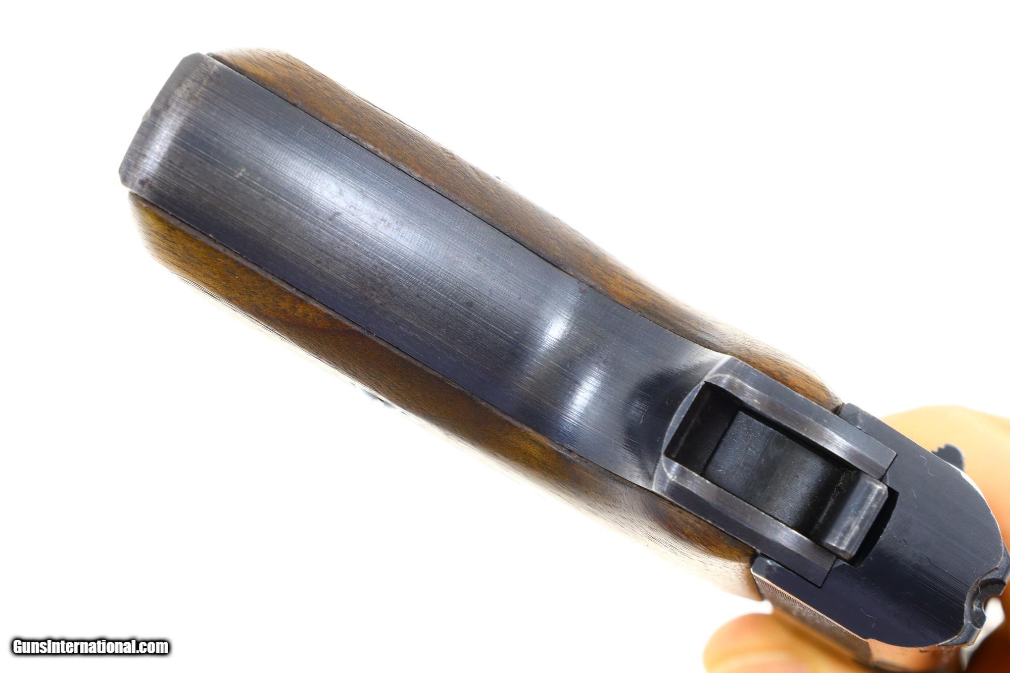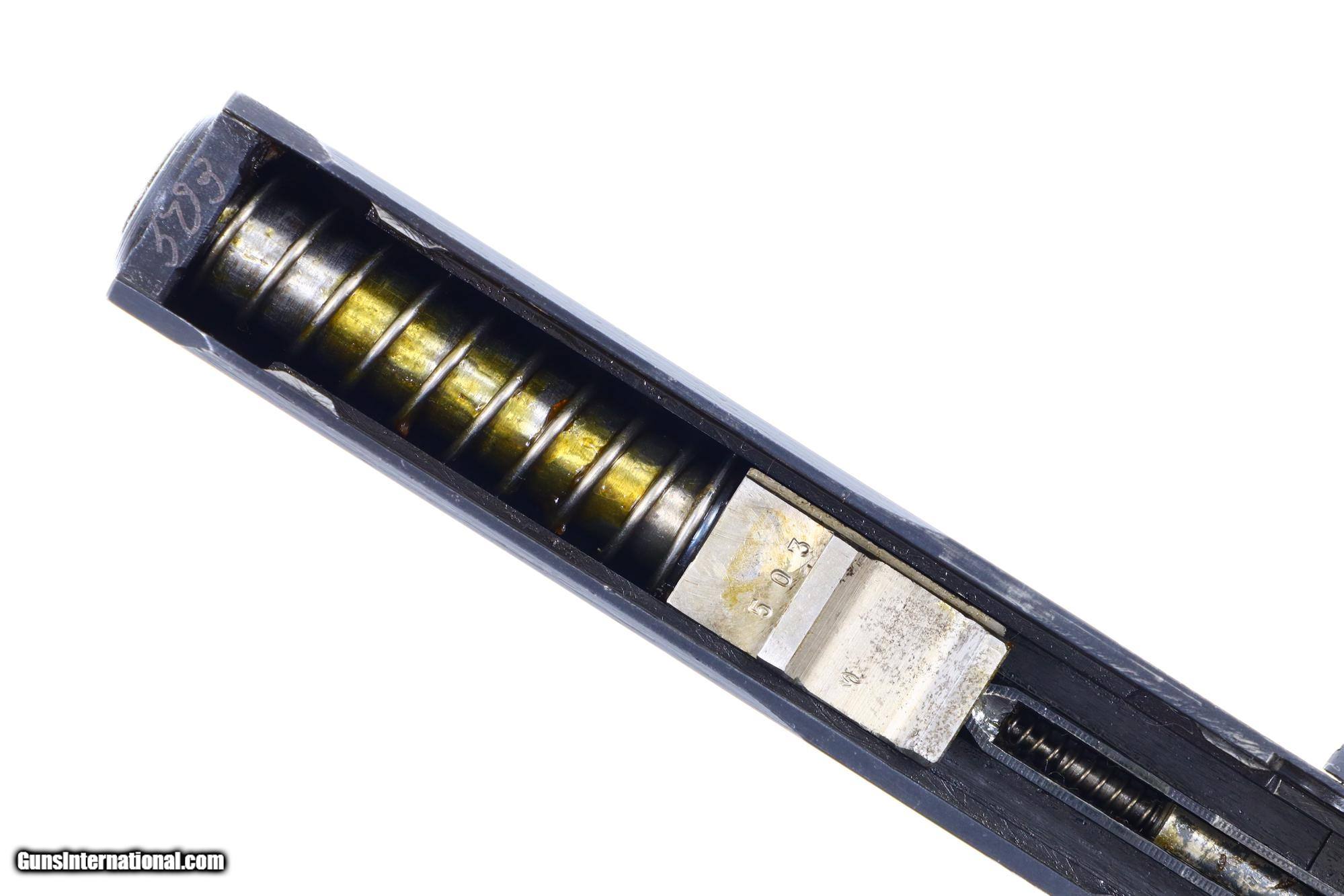 Description: Standard Late War configuration HSc whose left slide is marked with the Mauser banner followed by two line address. Matching slide with fixed front and drift adjustable rear sight within smooth channel. Nazi Navy Eagle/M III/3 acceptance on left trigger guard; Eagle/N on right trigger guard. Frontstrap with full serial number marked horizontally. Backstrap without provision for lanyard ring. Wood grips with impressed checkering. Correct magazine with unmarked in-the-white body and blued recessed floorplate. Synopsis: Extremely rare Nazi Navy HSc marked Eagle/M/3 with matching slide and barrel. Condition: Approximately 98% salt blue with slight fading of front and backstraps. Darkening grips with light handling marks, no cracks or chips. Magazine body with toning and comparable condition floorplate. Near mirror bore. Perfect manual mechanics. One of the most difficult to find WWII Nazi Navy marked HSc pistols. A HISTORIC INVESTMENT! ~~Insured shipping fee of $75; most packages shipped using FedEx 2nd Day.~~ SOLD Manufacturer: Mauser Serial Number: 886503 Caliber Info: 7.65 mm |