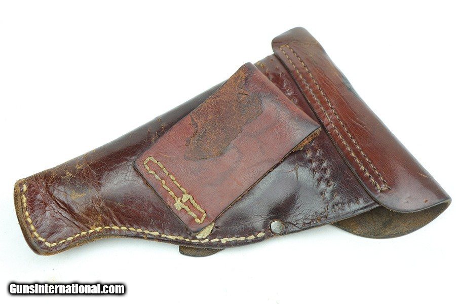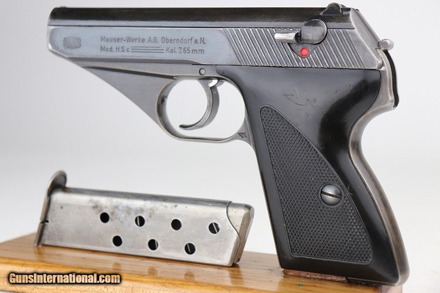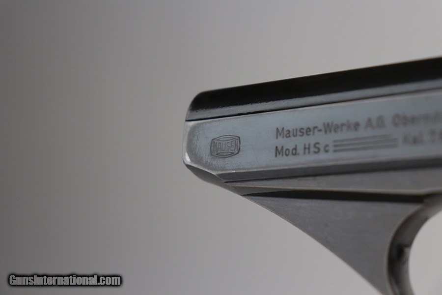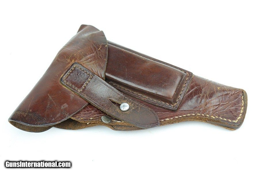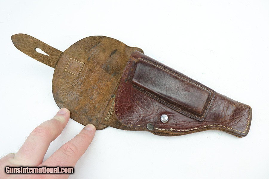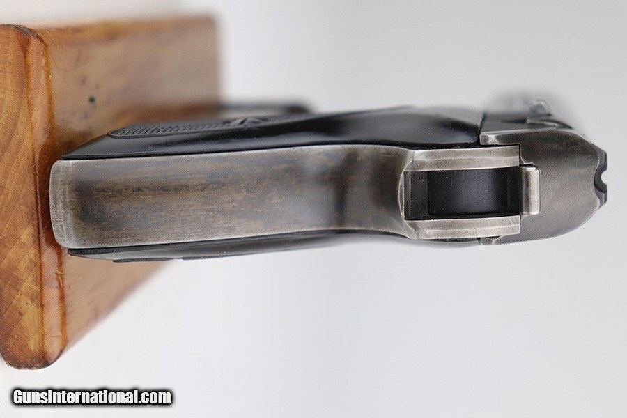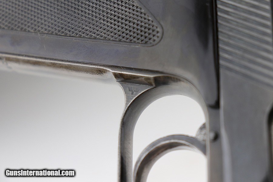 Description: This is a nice example of a Mauser HSC that was issued to the Nazi Police Force in 1944. It is all matching and has the proper Nazi police "Eagle L" proof on the left side of the trigger guard. Comes with two period-correct magazines and a period-correct un-marked brown leather holster (it looks like the belt loop was replaced and re-stitched). It also comes with a set of rare late-war bakelite grips, correct for 1944. The gun has retained roughly 75% of its blued finish. There is splotchy wear and discoloration and wear throughout, most noticeable on the straps and underside of the frame. There is noticeable scratchy wear along the the round edges of the slide. There is also wear on the high edges of the slide and around the muzzle. The bore is mint - shiny with strong rifling. SOLD Curio/Relic: Yes Handgun Caliber: 7.65x22mm Parabellum (7.65x22mm Luger, .30 Luger) |