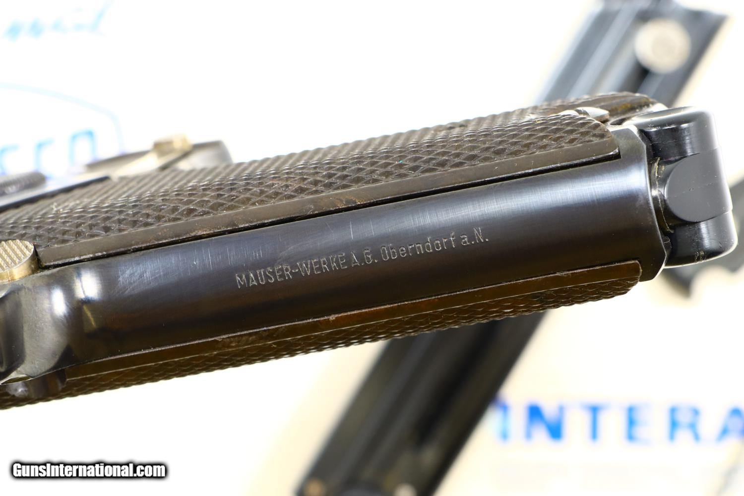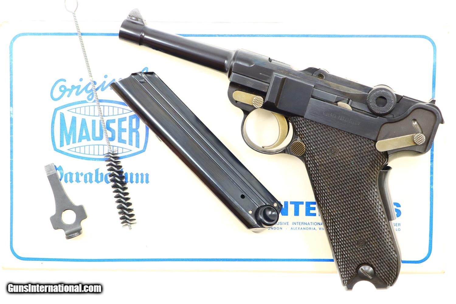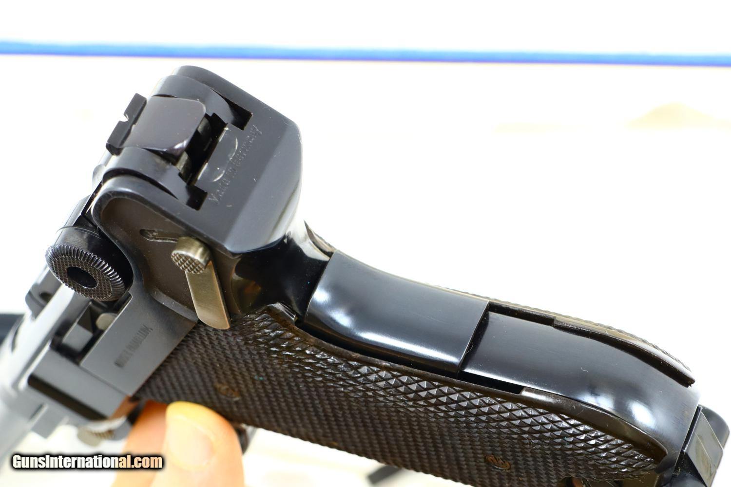 Description: Superb condition Mauser American Eagle Luger, Swiss pattern with 4 inch barrel as imported by Interarms in the early 1970s, near new with upgraded ORIGINAL BERN 1929 LUGER GRIPS, spare magazine, takedown tool, replacement brush in original, matching shipping box. Standard Configuration pistol with drift adjustable front sight and “U” notch rear sight. American Eagle etched on chamber. Original Mauser on middle link. Caliber noted on barrel. Full serial number on right side of receiver followed by Interarms markings, the serial number repeated on the right frame. Mauser address on front strap. Major components salt blued with strawed or fire blued small parts. Brown bakelite grips, made by Bern factory, for the original 1929 Luger. Each of the two magazines with Mauser banner on lower spine. Accessories as previously listed in original shipping box. Synopsis: Mauser, Interarms, American Eagle Swiss Luger, Boxed Condition: Pistol is near new, with a faint rub mark from functioning the safety lever and a tiny mark at back of frame where impacted by rear toggle link. Comparable condition grips. Magazines with minor insertional wear. Mirror bore. Perfect manual mechanics. Comparable condition accessories. Crisp box with taped corners. ~~Insured shipping fee of $55; most packages shipped using FedEx 2nd Day.~~ SOLD Manufacturer: Mauser Serial Number: 11.005797 Caliber Info: 9mm |