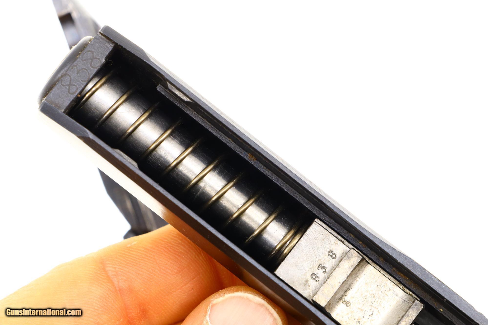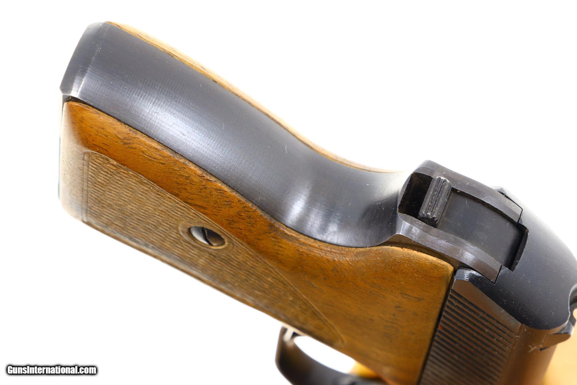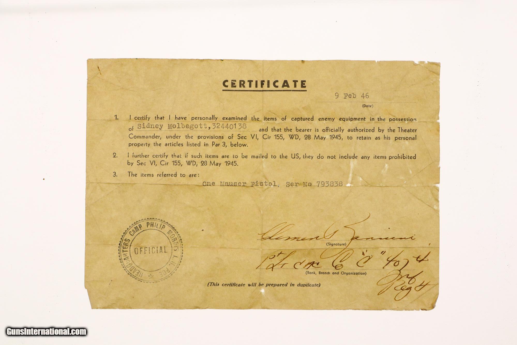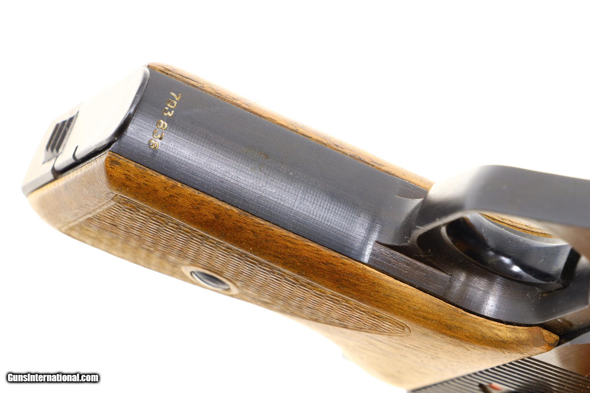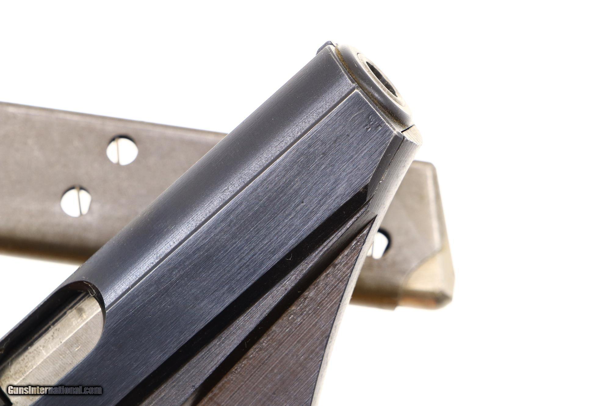Description: A standard, late war, Nazi Mauser HSc Wartime Commercial with left slide marked with Mauser Banner followed by two line address referencing manufacturer, model and caliber. Slide with fixed front and drift adjustable rear sight within smooth channel. Eagle/N on right side of slide and trigger guard. Full serial number on bottom of front strap. Backstrap without provision for lanyard ring. Wood grips with pressed checkering. Late magazine, body in the white, unmarked blued floorplate. Disassembly shows matching slide and barrel. Capture Paper shows acquisition by Sidney Molbegott, issued on Feb 9 1946, and references the pistol by serial number. Synopsis: Spectacular Mauser HSc, Late WWII Wartime Commercial, with original Capture Paper. Condition: 99+% bright original salt blue with minimal sharp edge wear, comparable condition grip straps. Super crisp grip panels, no repairs, though a previous owner's name, very faded, on right upper panel. Excellent magazine. Mirror bore. Perfect manual mechanics. Capture Paper with creases and ink fading as invariably found on original documents. A phenomenal, super high condition, Late WWII Wartime Commercial HSc, whose condition would be nearly impossible to upgrade, especially nice when accompanied by Capture Papers! ~~Insured shipping fee of $65; most packages shipped using FedEx 2nd Day.~~ SOLD Curio/Relic: Yes Manufacturer: Mauser Serial Number: 793838 Caliber Info: 7.65mm |