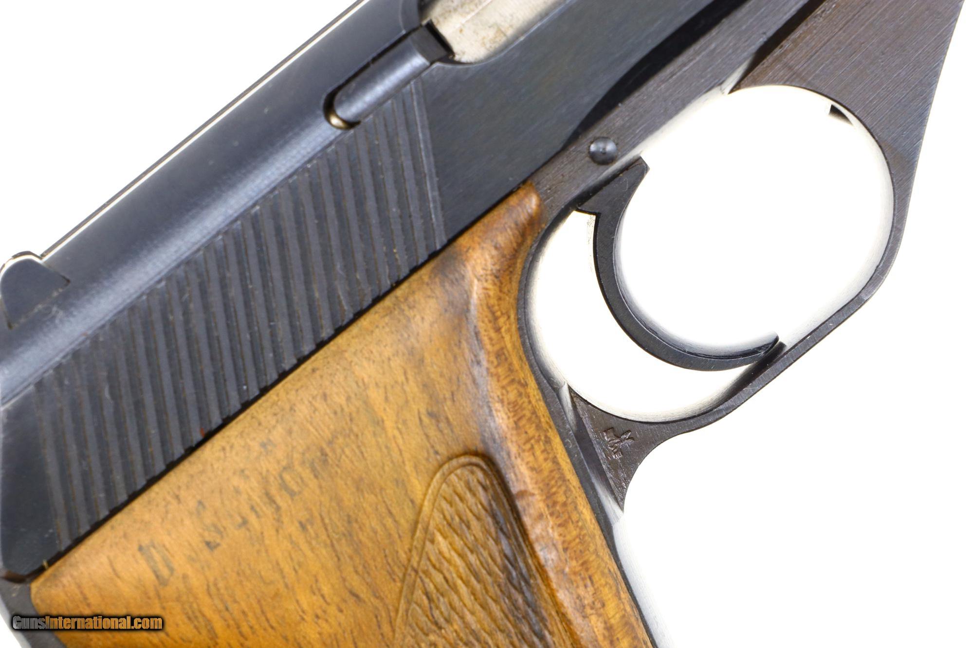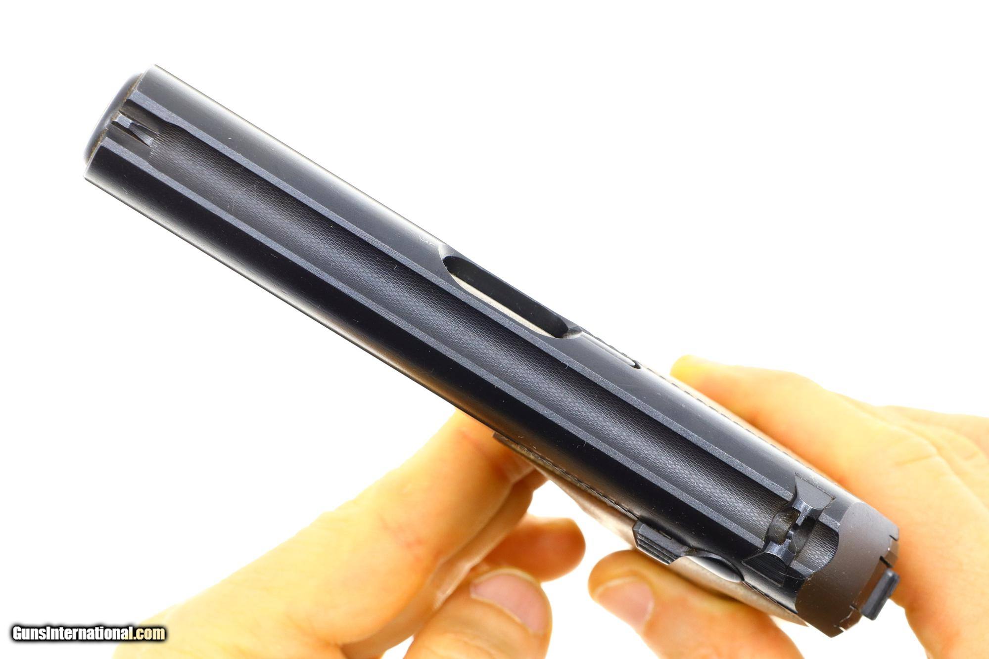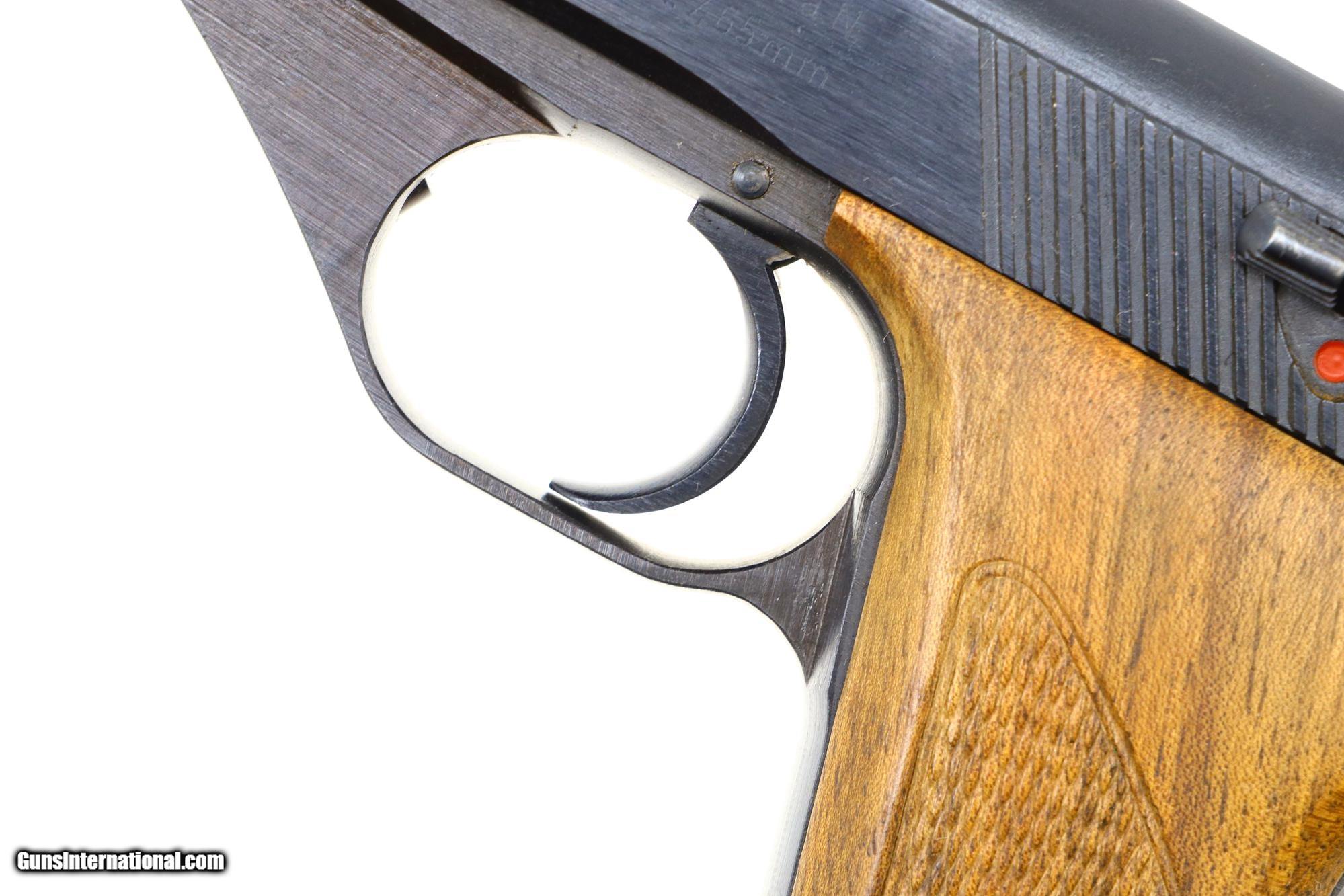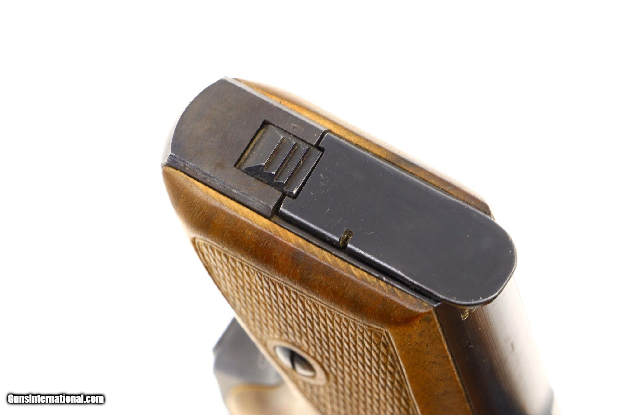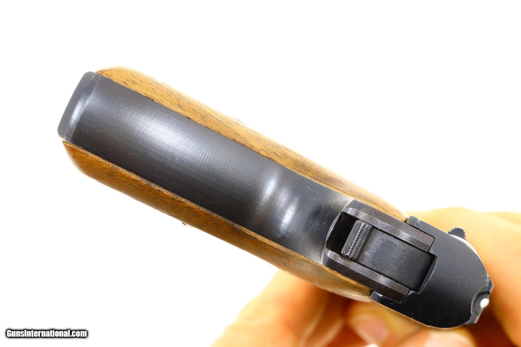 Description: A standard, late war, Nazi Mauser HSc Wartime Commercial with left slide marked with Mauser Banner followed by two line address referencing manufacturer, model and caliber. Slide with fixed front and drift adjustable rear sight within smooth channel. Eagle/N on right side of slide and trigger guard. Full serial number on bottom of front strap. Backstrap without provision for lanyard ring. Wood grips with pressed checkering. Late magazine, body in the white, unmarked blued floorplate. Disassembly shows matching slide and barrel. Capture Paper shows acquisition by Sidney Molbegott, issued on Feb 9 1946, and references the pistol by serial number. Synopsis: Spectacular Mauser HSc, Late WWII Wartime Commercial, with original Capture Paper. Condition: 99+% bright original salt blue with minimal sharp edge wear, comparable condition grip straps. Super crisp grip panels, no repairs, though a previous owner's name, very faded, on right upper panel. Excellent magazine. Mirror bore. Perfect manual mechanics. Capture Paper with creases and ink fading as invariably found on original documents. A phenomenal, super high condition, Late WWII Wartime Commercial HSc, whose condition would be nearly impossible to upgrade, especially nice when accompanied by Capture Papers! ~~Insured shipping fee of $65; most packages shipped using FedEx 2nd Day.~~ SOLD Curio/Relic: Yes Manufacturer: Mauser Serial Number: 793838 Caliber Info: 7.65mm |