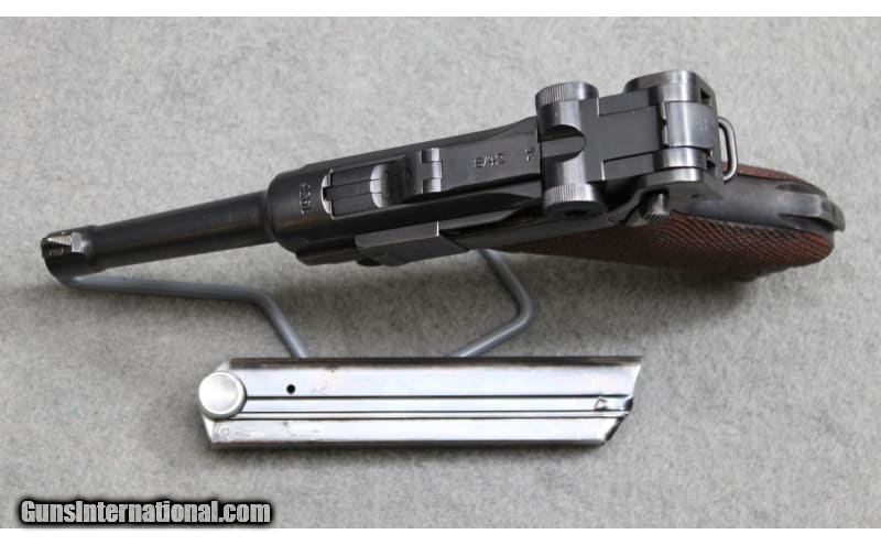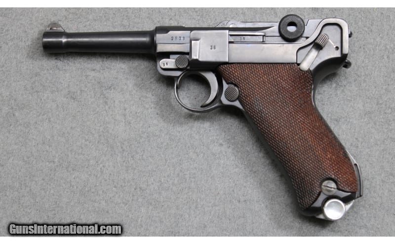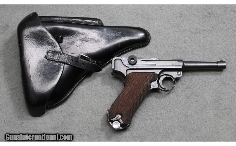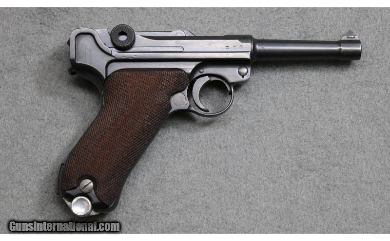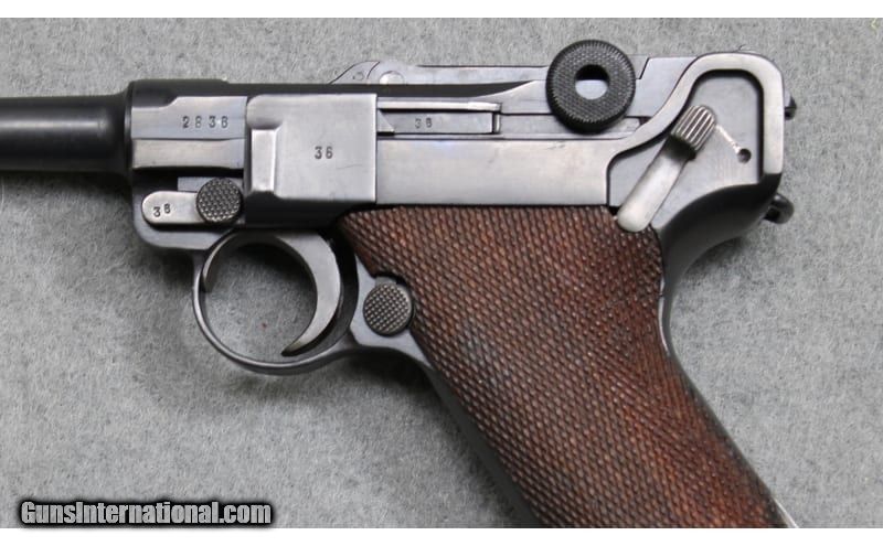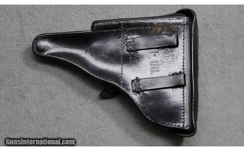 Description: Mauser ("S/42" coded) P-08 "Luger" semiautomatic pistol chambered in 9mm Luger. 1936 dated. Matching visible serial numbers on the frame, barrel, and extension, along with matching partials on small parts. Comes with a single non-matching magazine and includes a "gjh/41" coded leather flap holster marked "P.08." and with initials "TAV" carved into the back. None SOLD Metal Condition: Refinished Very Good with Minor Handling Marks and Light Pitting Under Finish Wood Condition: Replacement Grips Very Good with Minor Handling Marks Bore Condition: Slight Darkening with Light Pitting Barrels: 3 inches Weight: 3.5 lbs Item Location: Fort Worth, TX |