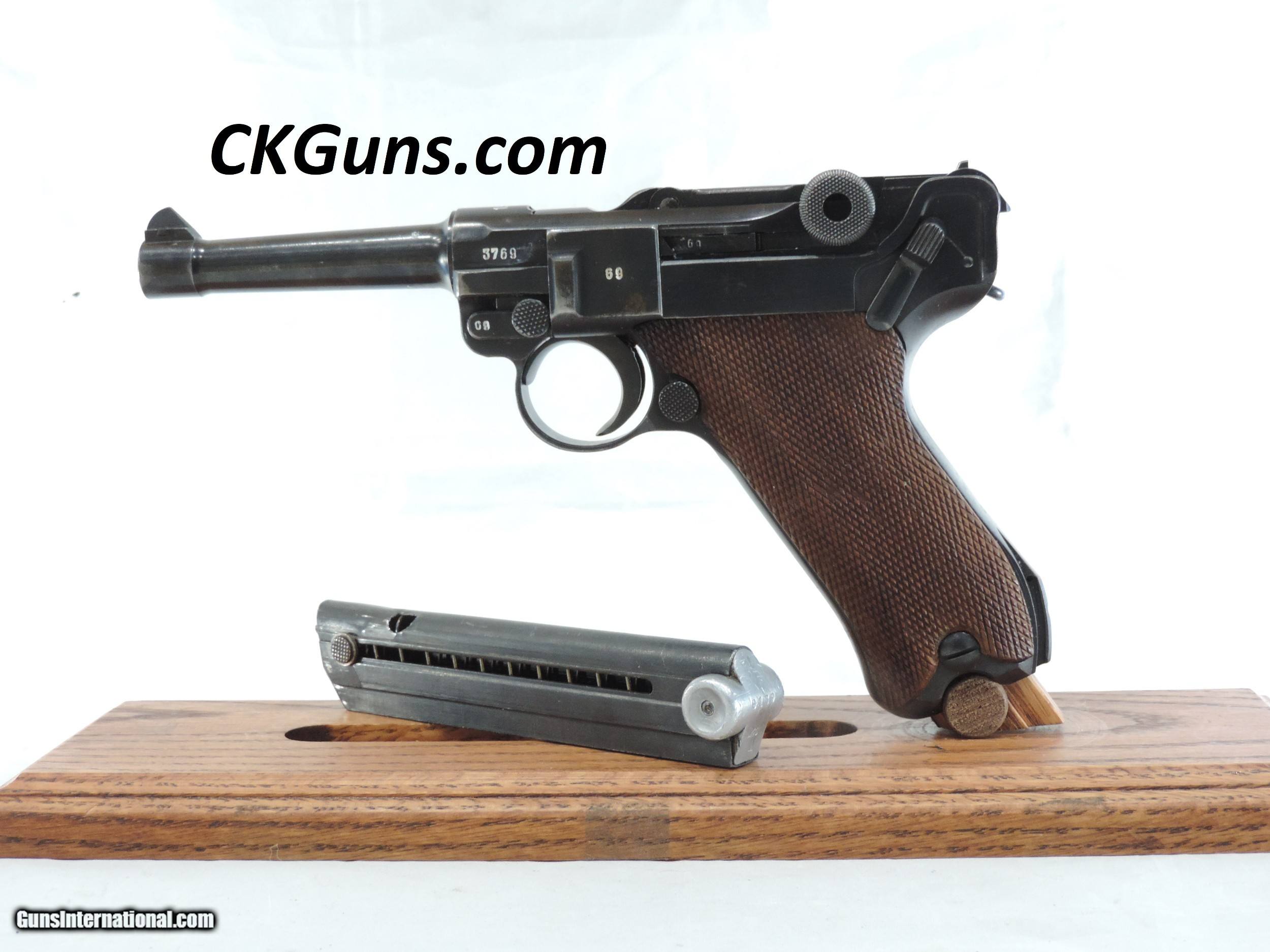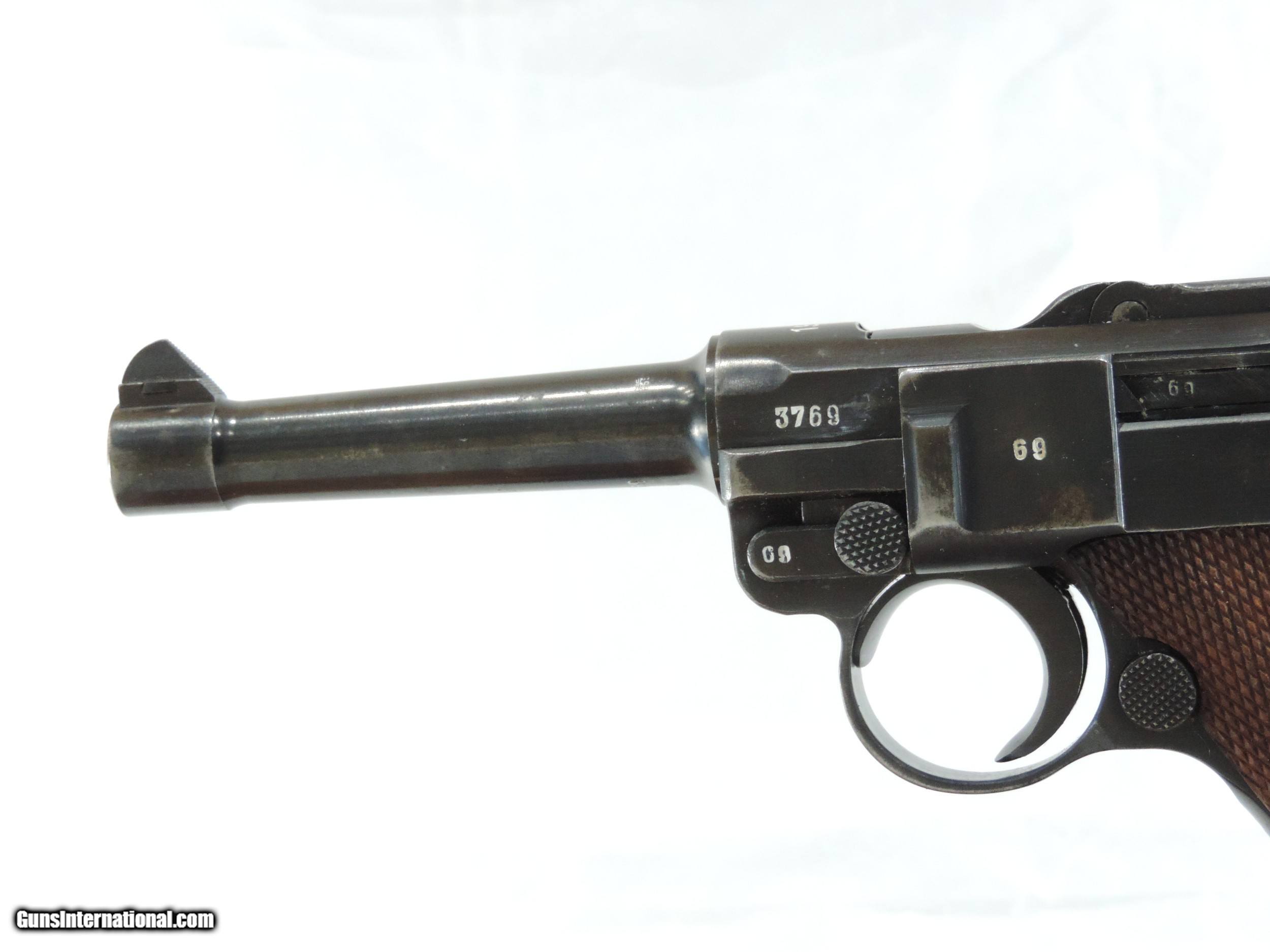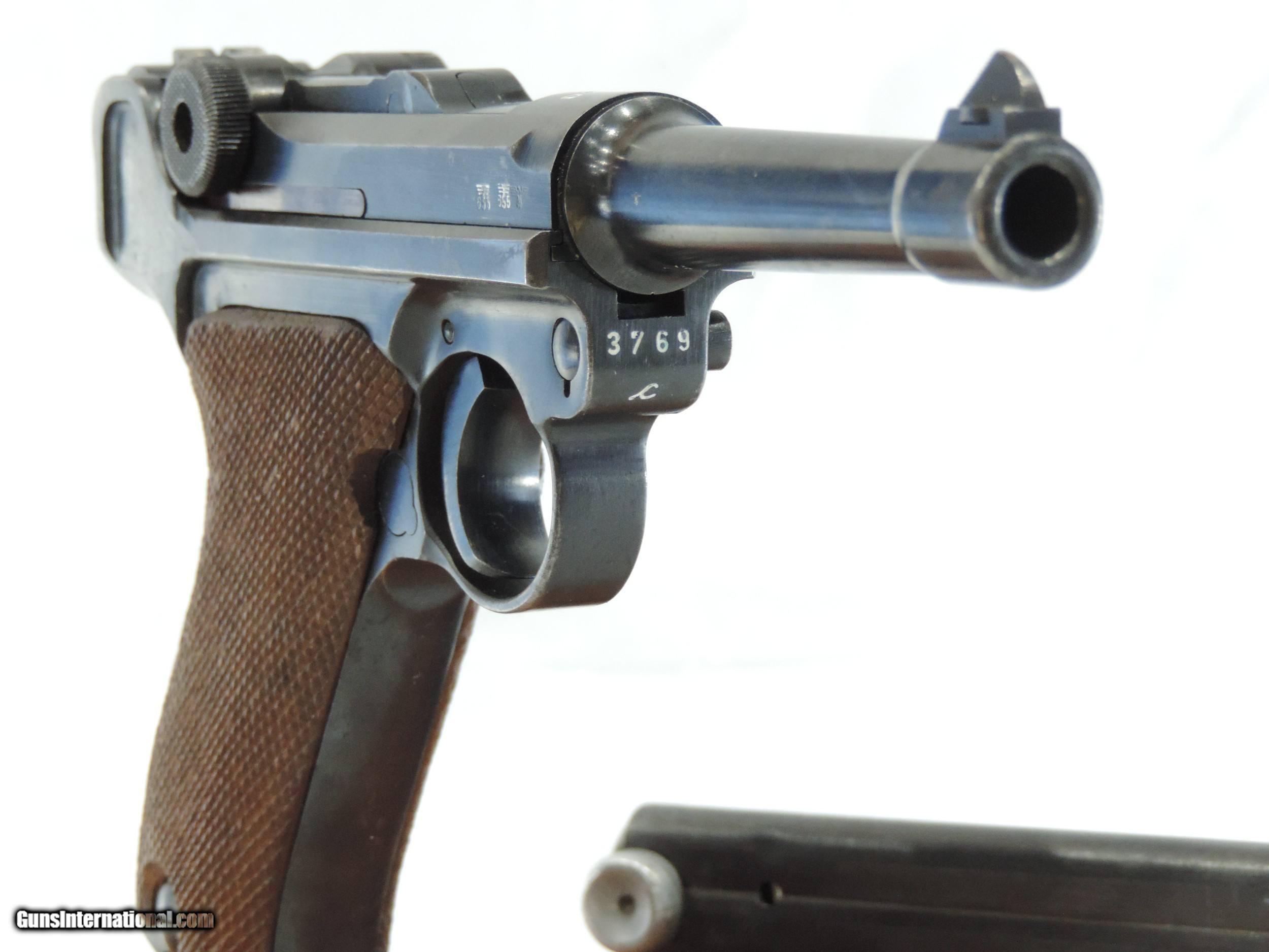 Description: INV. 10550 MAUSER (LUGER) P.08, CAL. 9MM, SER. 3769c. THIS "byf/40" BEAUTY HAS RETAINED ABOUT 95-96% OF THE ORIGINAL FACTORY FINISH. THE ONLY LOSS IT HAS IS SOME SLIGHT SHARP EDGE SILVERING FROM HOLSTER WEAR AND A FEW SCATTERED PIN PRICKS. THERE ARE NO RUST SPOTS, RUB MARKS OR SCRATCHES. ALL NUMBERS MATCH AND HAVE THE CORRECT WAFFENAMTS AND EAGLE/SWASTIKAS. THE SLIDE RAILS, BOLT FACE AND FEED RAMP SHOW SLIGHT IF ANY USE. THE BARREL IS SUNSHINE BRIGHT WITH RAZOR SHARP RIFLING AND SCATTERED FROST. THIS EARLY "BYF" CODED IT IS A GREAT FIND FOR EVEN THE MOST CRICTCAL INVESTOR AND CERTAINLY CENTERPIECE FOR THE COLLECTOR. MODESTLY PRICED AT...... $2695.*** ***100% SATISFACTION GUARANTEE" THE WHITE CRAYON IS SO THE BUYER IS SURE THAT MARINGSARE CORRECT. IT IS EASILY REMOVED WITH A TOOTHBRUSH AND LIGHTER FLUID. BE ASSURED IT DOES NOT HARM THE FINISH. WE WILL DO IT PRIOR TO SHIPPING UPON REQUEST. To purchase this firearm or if you want to request more information contact us at: Email ckguns[at]ymail[dot]com Phone 201-512-0002 Cell 201-575-6838 FAX 201-215-4759 We accept most major credit cards. Prices shown are Discounted 3% for Cash or Check. The buyer must be familiar with all the laws governing the purchase and the ownership of firearms in their own city and state. The Yankee Armorer, Inc is not responsible for any failure to comply with or observe these laws. The Yankee Armorer, Inc will only ship after full payment and receipt of all required documents. Shipping: Add $35.00 for handguns, $45.00 for long guns. New Jersey buyers are subject to a 7% sales tax. The Yankee Armorer, Inc offers a 3 day inspection period with full refund upon return of intact firearm and in the original condition. The Yankee Armorer, Inc offers a no interest lay away program - 25% down; 25% in 30 days; 25% in 60 days; and full payment in 90 days. Any violation of this policy is subject to restocking and forfeiture of all payments. Any variation from this policy must be agreed to in advance. Unshipped Cancelled sales are subject to a 20% restocking fee. Be advised that all firearms sold by The Yankee Armorer, Inc. or the Gun Exchange, LLC (SELLER) are sold as collector’s items. They have not been fired or tested for safety and must be examined by a license gunsmith prior to use. By purchasing any item from the (SELLER), you are agreeing to hold the (SELLER) free from any damages or lawsuits of any nature. Any item left for transfer or storage will be charged to $25.00 per month, per item from the day of its receipt. Any variation from this policy must be agreed to in advance. Store hours 10:00 am to 5:00 pm Tuesday -Saturday. It's always best to call for appointment. Store 201-512-0002, cell 201-575-6838. SOLD Curio/Relic: Yes |