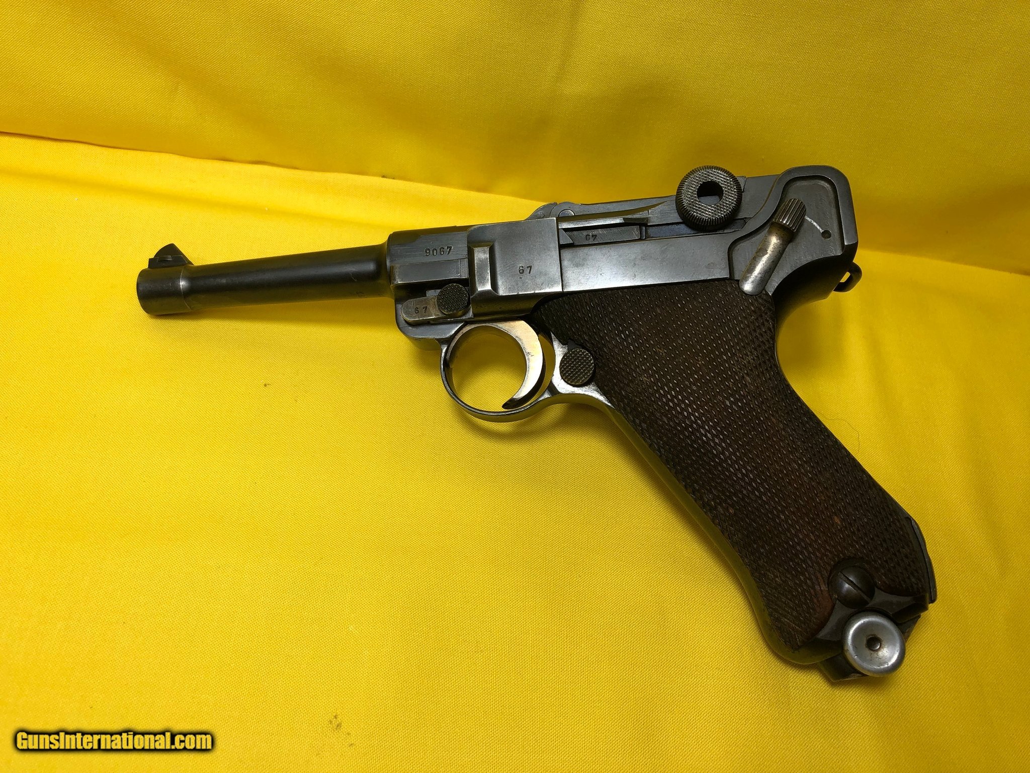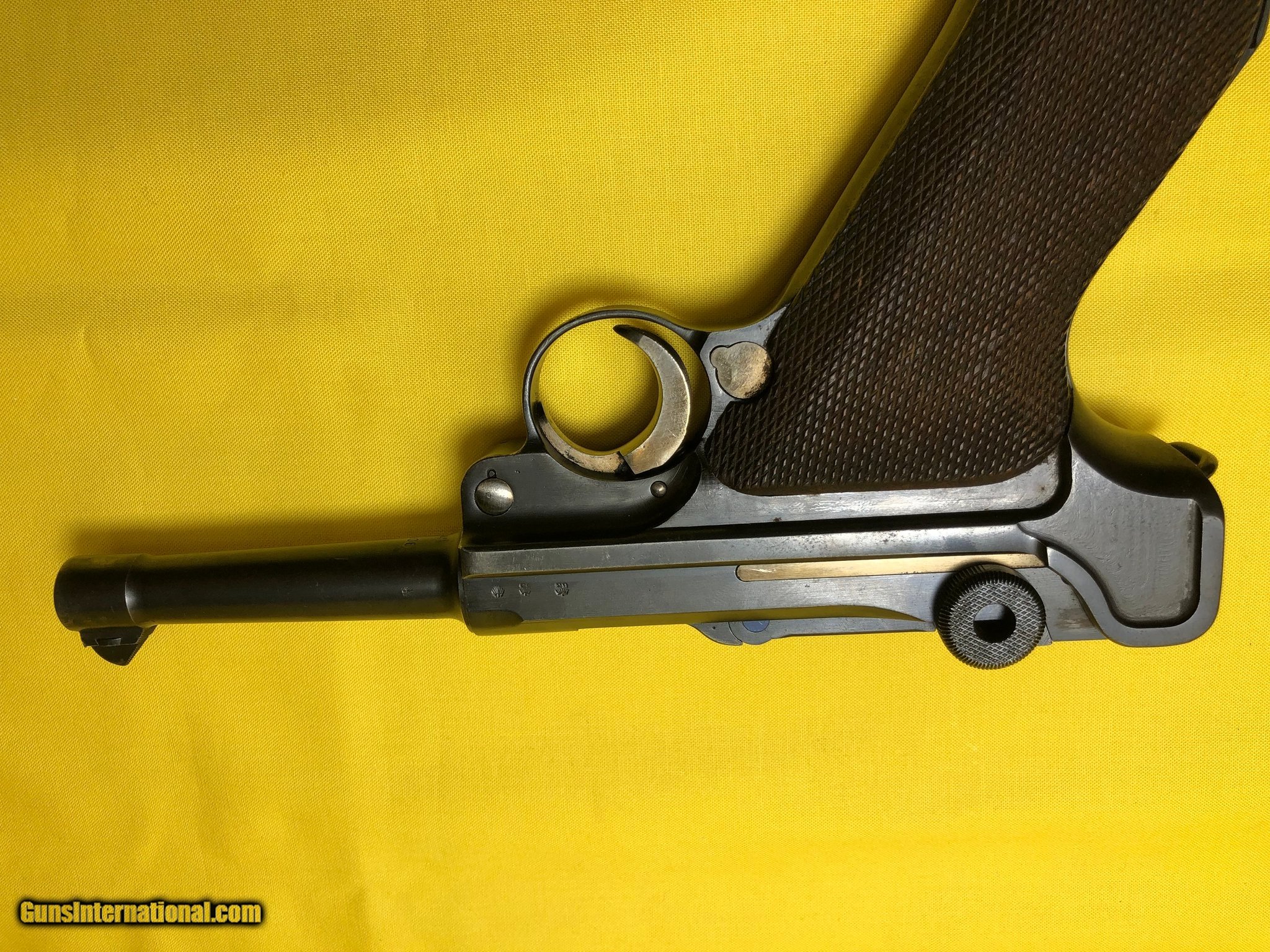 Description: Guns Listing ID: 1299173 This is a 1936 prewar Mauser Luger PO 8 pistol in very good to excellent condition. Very rare to see one in this condition. It has the Nazi markings and all numbers match. The gun was brought home by a World War II GI and locked away in a safe dry location and never fired. It is in very good working condition. The action is smooth and tight and the barrel is in very good condition inside and out. There is some light patina on the barrel. The receiver and toggle are in very good condition. The safety has one spot of rust. The stock is in amazing condition. There is one magazine again with Nazi markings. The gun does have a loop for a lanyard. This is the best early Luger we have seen from this time period. If you have been looking for a Luger PO 8 take a close look at this gun. It would be great gun for a collector. It is priced to sell quickly, so don‚‚t hesitate SOLD Manufacturer: MAUSER Model: LUGER P08 Caliber Info: 9MM LUGER (9X19 PARA) Condition: Used - Non-Certified Barrels: 4 BARREL Finish: BLACK /W WOOD STOCK |