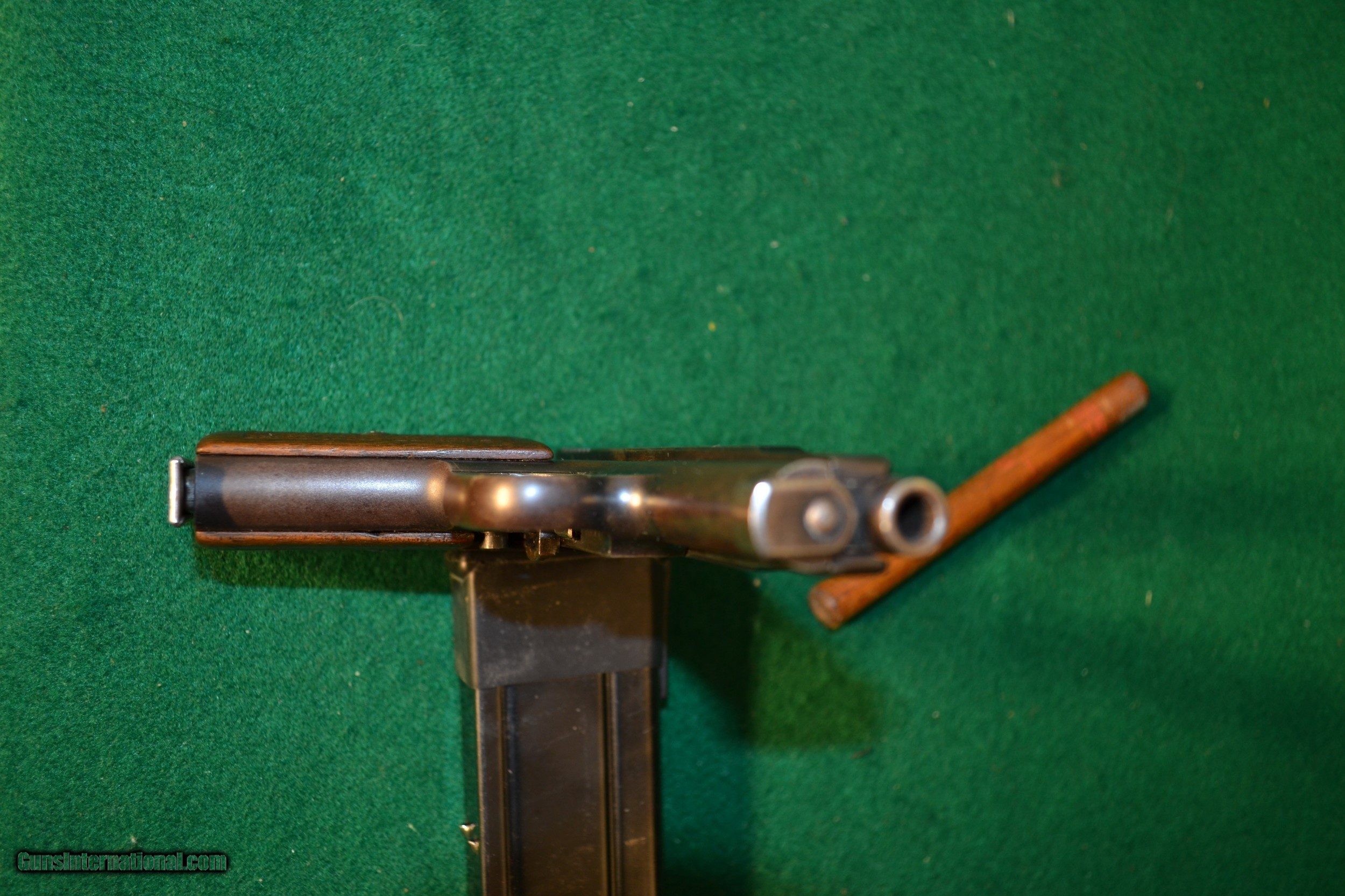 Description: Sale Pending !! This early Mauser Ser No 8510 M-1910 9 Shot (.25 cal or 6.35) magazine (appears to be matching - No Markings). The gun bluing is abt 70-85% w/some edge wear and a slight patina. It is an early version. I would say about 1910-11. The hard wood is a wrap around grip & is excellent w/no mars. The action is norma w/a smooth bore and a nice twist. To me a nice addition to the collector who wants an original type Mauser for their collection or carry. These Mausers are kown for their ageless dependability. i would rate this an an NRA good to Very-Good ! SOLD Curio/Relic: Yes Handgun Caliber: .25 ACP (6.35mm Browning, 6.35×16mmSR) Manufacturer: Mauser Model: M-1910 Serial Number: 8510 Barrel Length: 3 inch Bore: Good w/nice twist Condition: Good - very Good Metal Condition: Good Wood Condition: Very Good to Excellent Bore Condition: Good Stock: Grip - Wrap around Walnut Manufacture Date: 1910 |