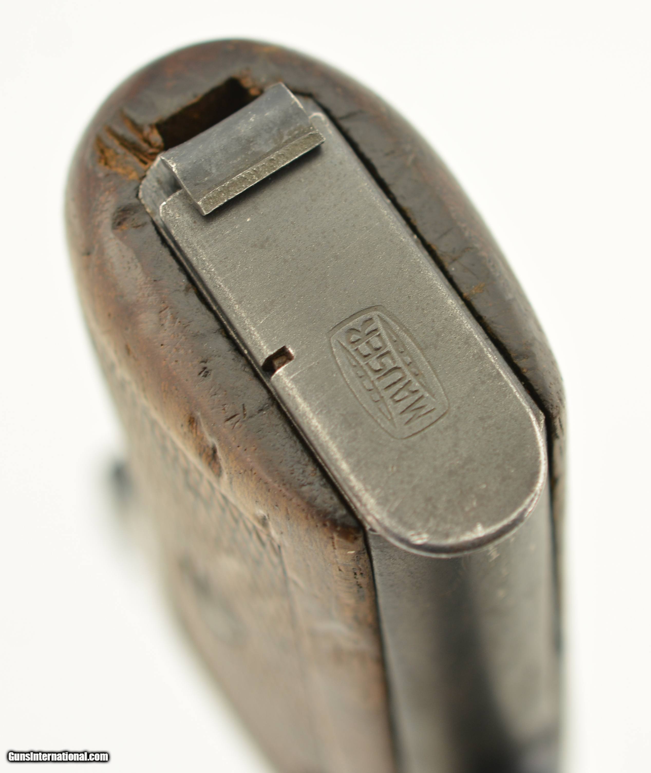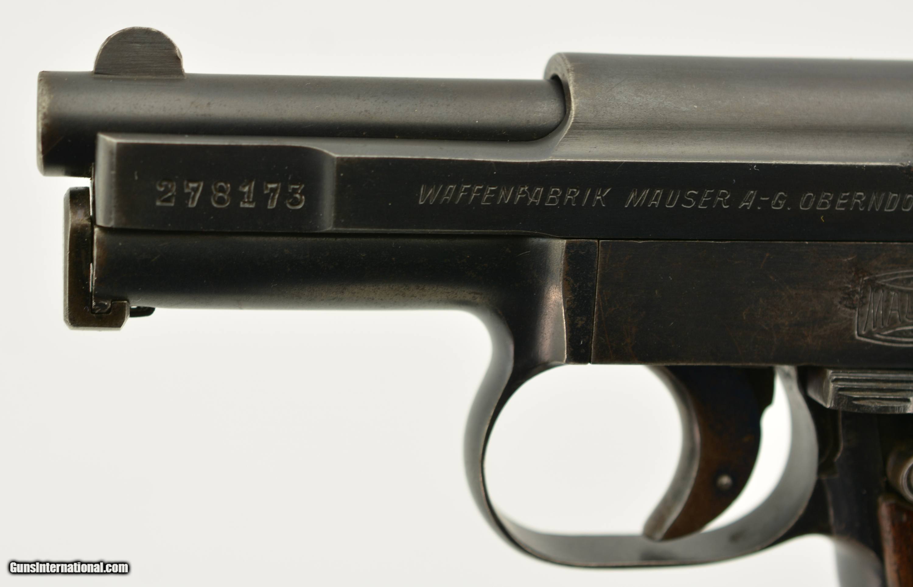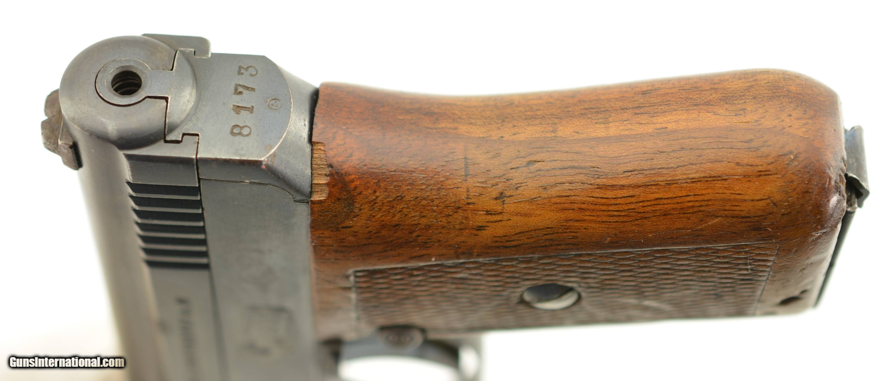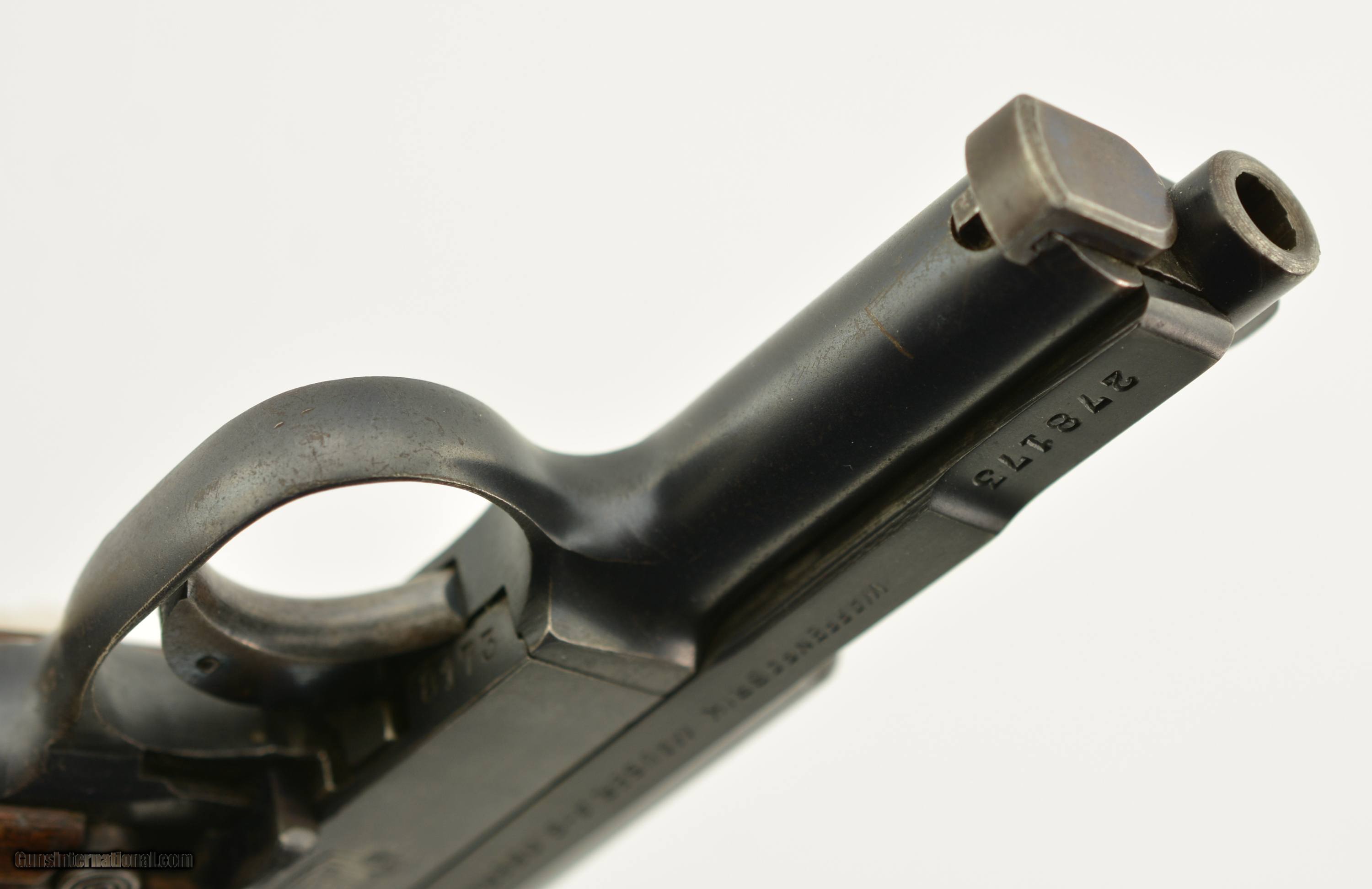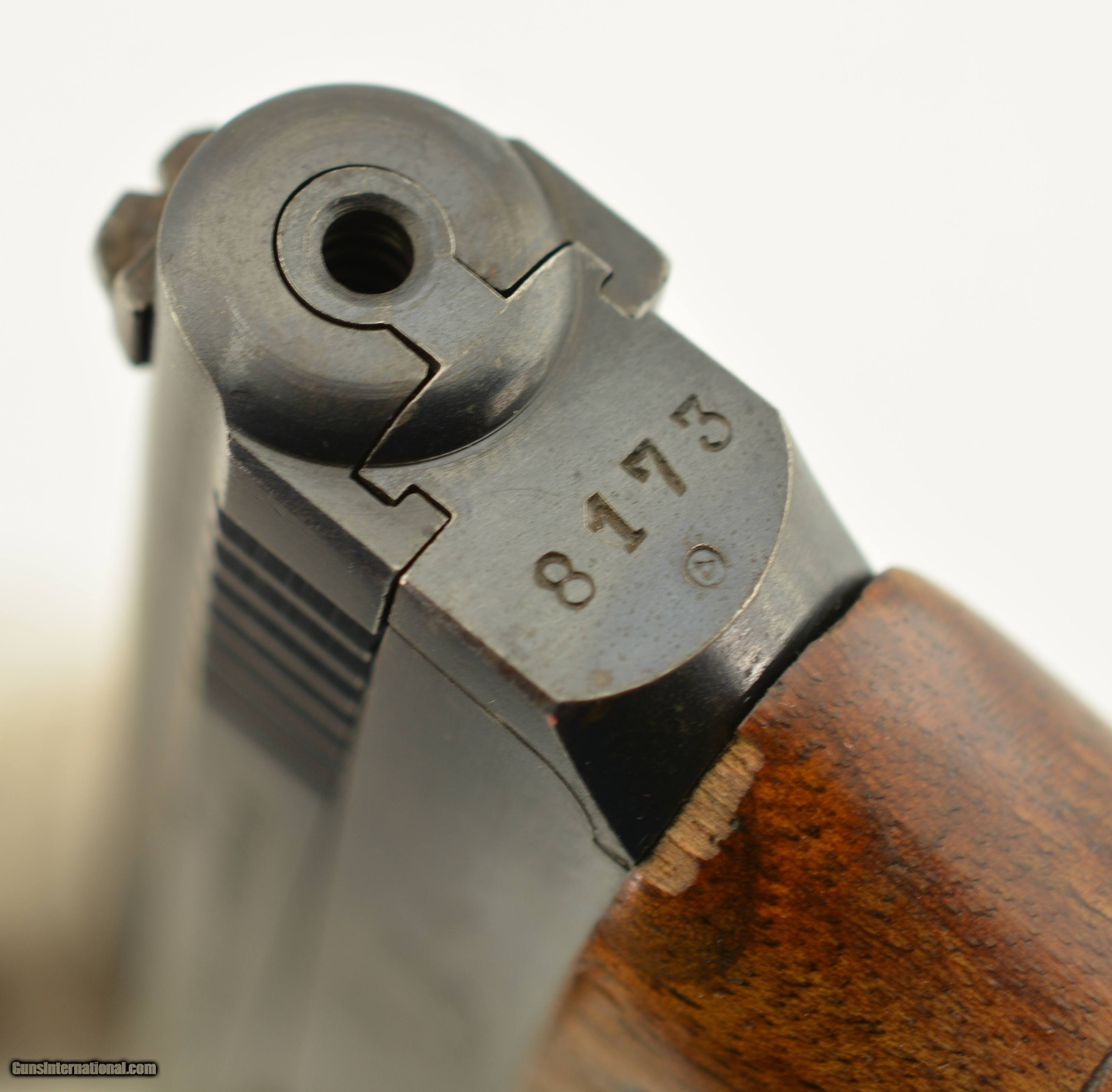 Description: Serial #278173, 6.35mm (.25 ACP), 3" barrel with a fine, bright bore that has some mild freckling within the grooves. This is a handsome little pistol that has matching numbers on the frame, slide, and barrel, with the metal retaining 90-92% of the original blue finish that has silvered along the exposed edges and projections. A small amount of the original bright fire blue remains on the trigger, while some traces of fire blue remain on the end of the barrel pin. Some further finish loss occurs on the sideplate around the Mauser banner. The tiny "(triangle in circle)" Portuguese property marking is plainly visible on the rear of the frame, as are the "(crown) / U" proofs. The checkered walnut grip mild overall wear, but does exhibit some small handling marks at the butt on the left side. The pistol comes with a single original magazine. This is a very nice little Portuguese Model 1910, and is in fine condition overall. FFL or C&R SOLD Curio/Relic: Yes |