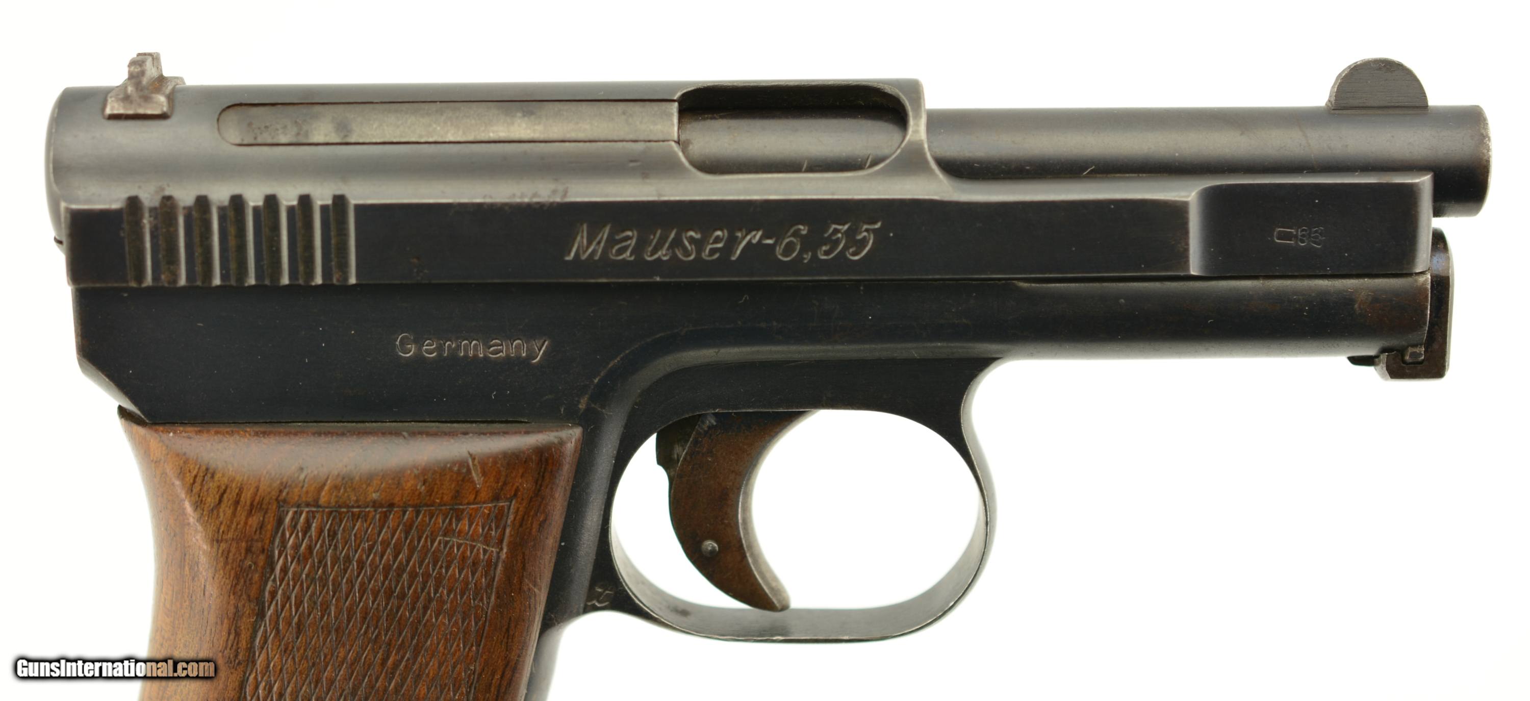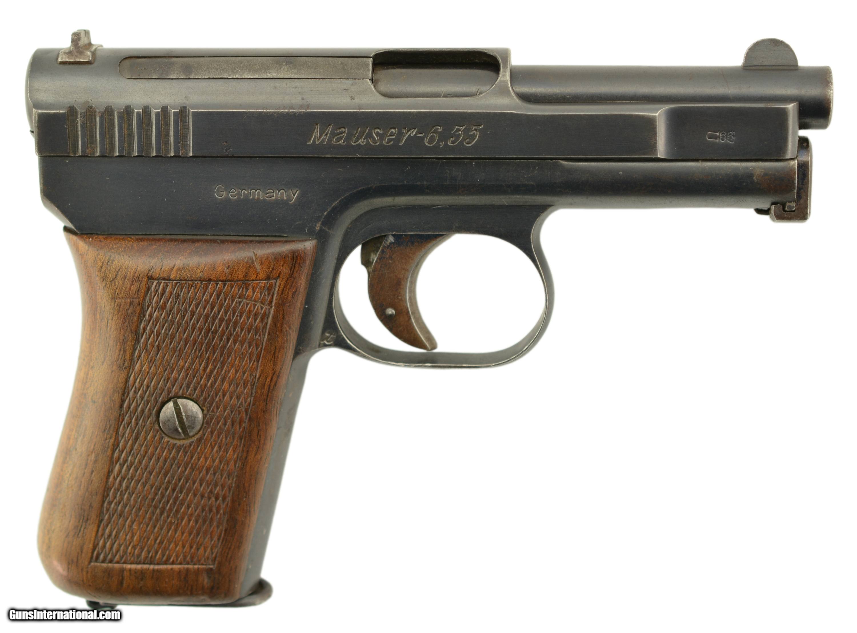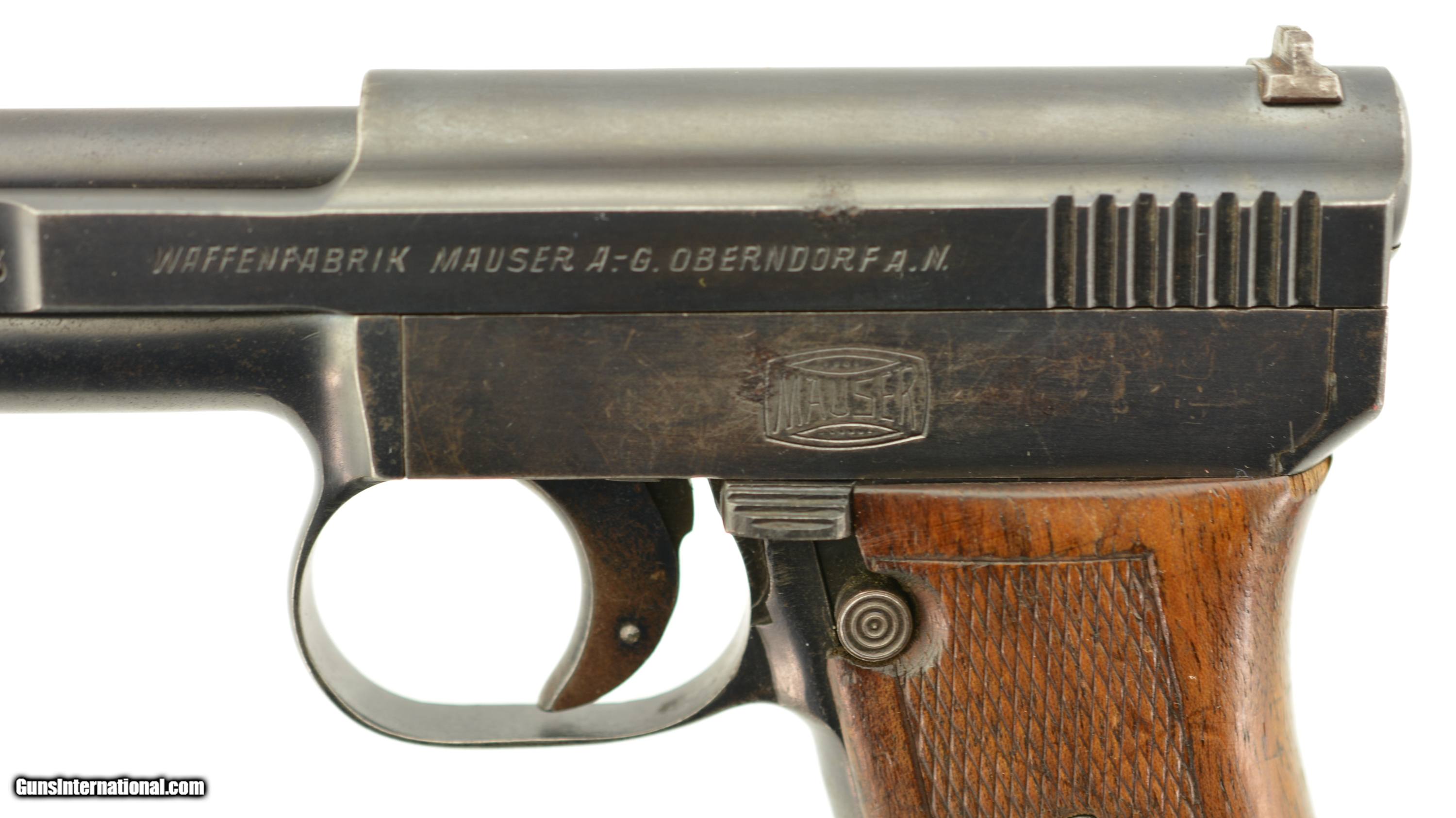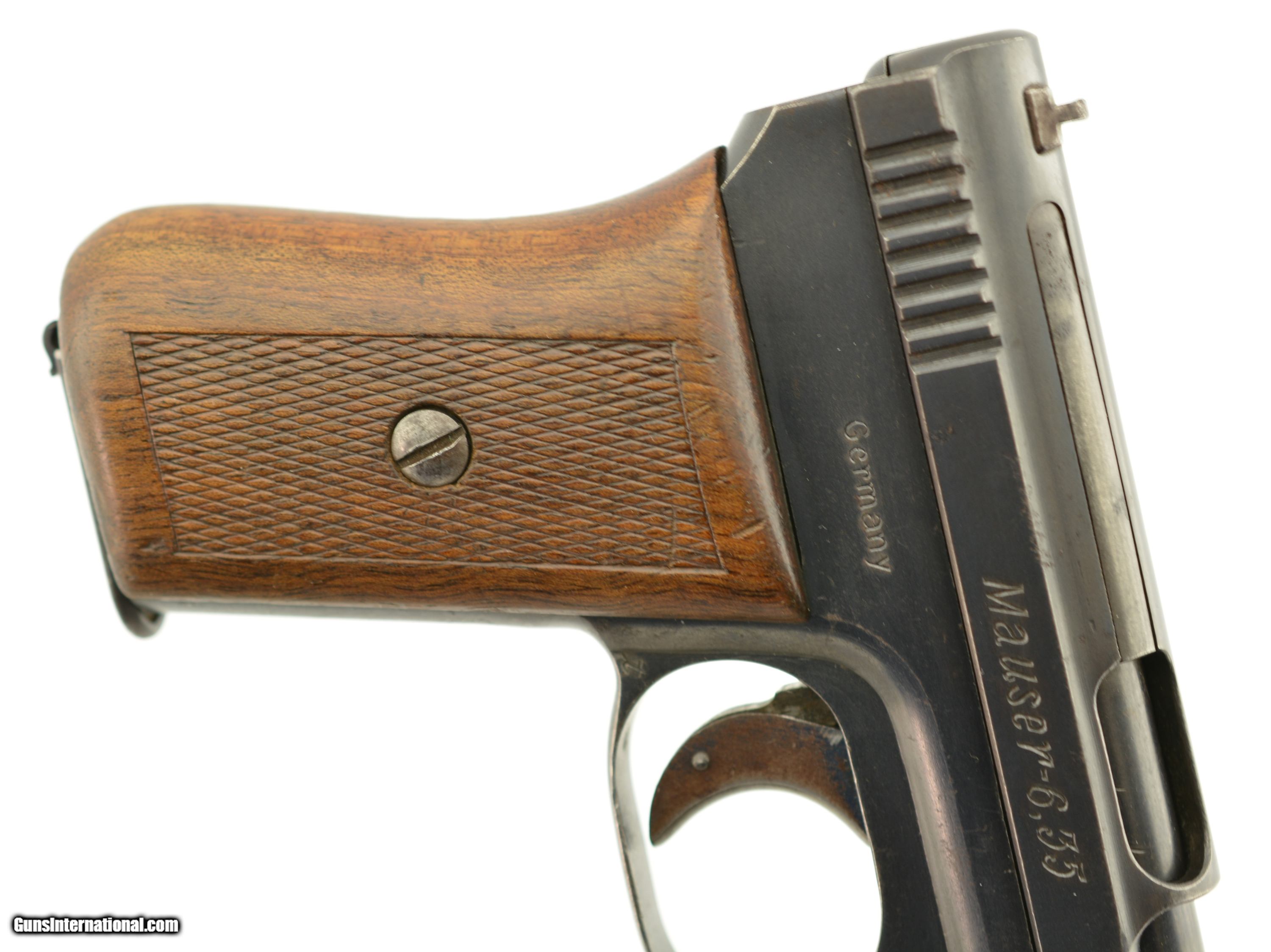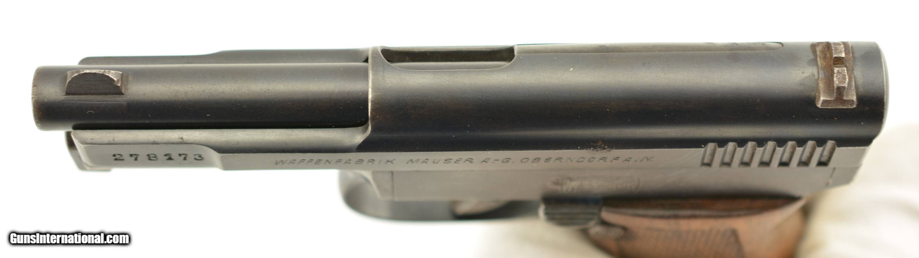 Description: Serial #278173, 6.35mm (.25 ACP), 3" barrel with a fine, bright bore that has some mild freckling within the grooves. This is a handsome little pistol that has matching numbers on the frame, slide, and barrel, with the metal retaining 90-92% of the original blue finish that has silvered along the exposed edges and projections. A small amount of the original bright fire blue remains on the trigger, while some traces of fire blue remain on the end of the barrel pin. Some further finish loss occurs on the sideplate around the Mauser banner. The tiny "(triangle in circle)" Portuguese property marking is plainly visible on the rear of the frame, as are the "(crown) / U" proofs. The checkered walnut grip mild overall wear, but does exhibit some small handling marks at the butt on the left side. The pistol comes with a single original magazine. This is a very nice little Portuguese Model 1910, and is in fine condition overall. FFL or C&R SOLD Curio/Relic: Yes |