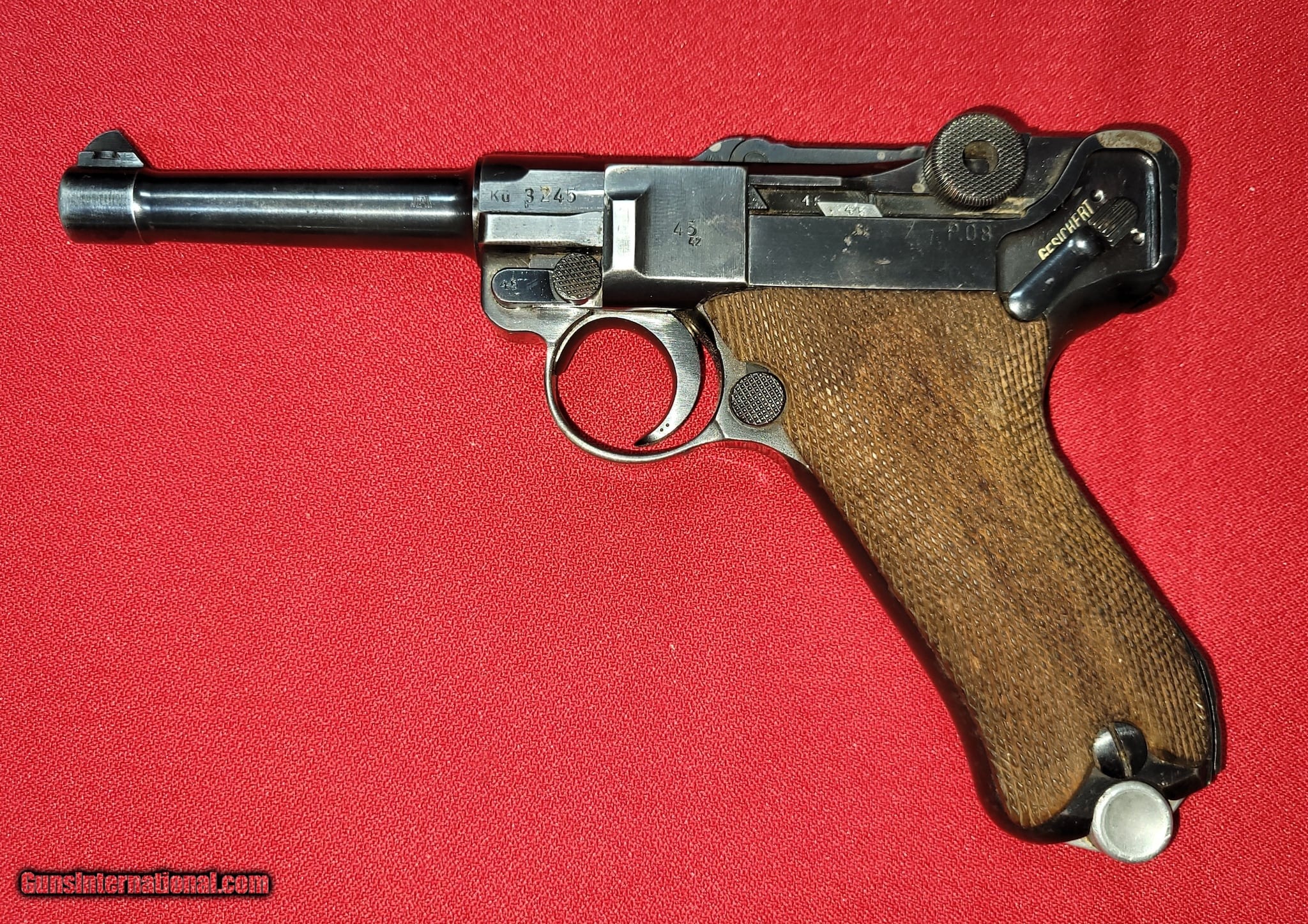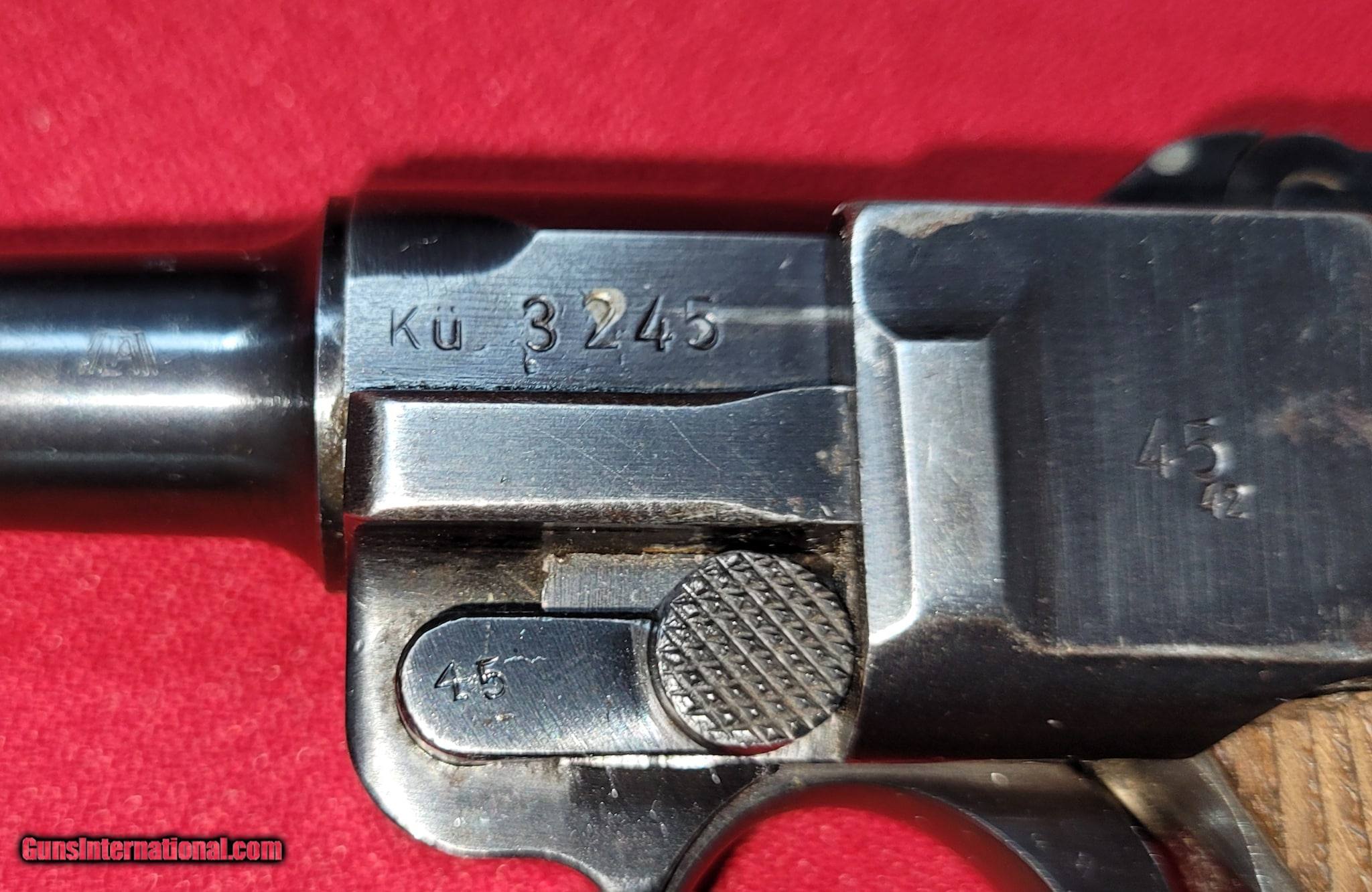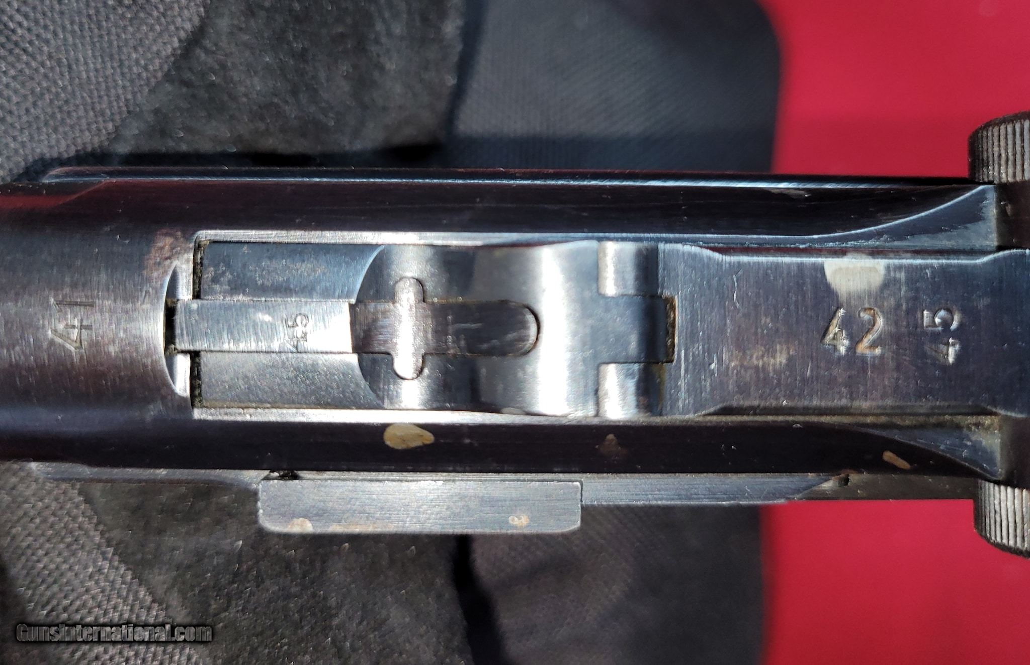 Description: Guns Listing ID: 736218 This 42 coded Luger was manufactured by Mauser in 1941 with serial # 3245 and appears to have all matching serial numbers. A 655 military proof stamp is present on the barrel as well as Mauser proof marks on the right side of the receiver and on the left side of the barrel near the action. The original bluing estimated at 90%. Includes two period matching magazines and leather holster. This model has the stock connection point on the backstrap. HISTORY. The Luger was originally designed in 1898 by Georg J. Luger and first manufactured two years later by a German company called Deutsche Waffen-und Munitionsfabriken (DWM). The Luger is a toggle locked, recoil operated, semi-automatic pistol that is chambered in 9mm Parabellum. It utilizes an adjustable front blade sight and fixed V notch rear sight that is located on the rear toggle link. It is fed by a single stack 8 round detachable box magazine, but it can also be fed by using a 32 round detachable drum. The Swiss Army first purchased the Luger in 1900, followed by the German Navy in 1904 and German Army in 1908. The popularity of the weapon is understandable – durable, well-made and with so many variations, making it the most popular collector gun in the world. SOLD Curio/Relic: Yes Manufacturer: MAUSER Model: P-08 Caliber Info: 9 MM (9X19 PARA) Condition: Used - Non-Certified Barrels: 4 BARREL Finish: WOOD GRIPS/BLUED STE |