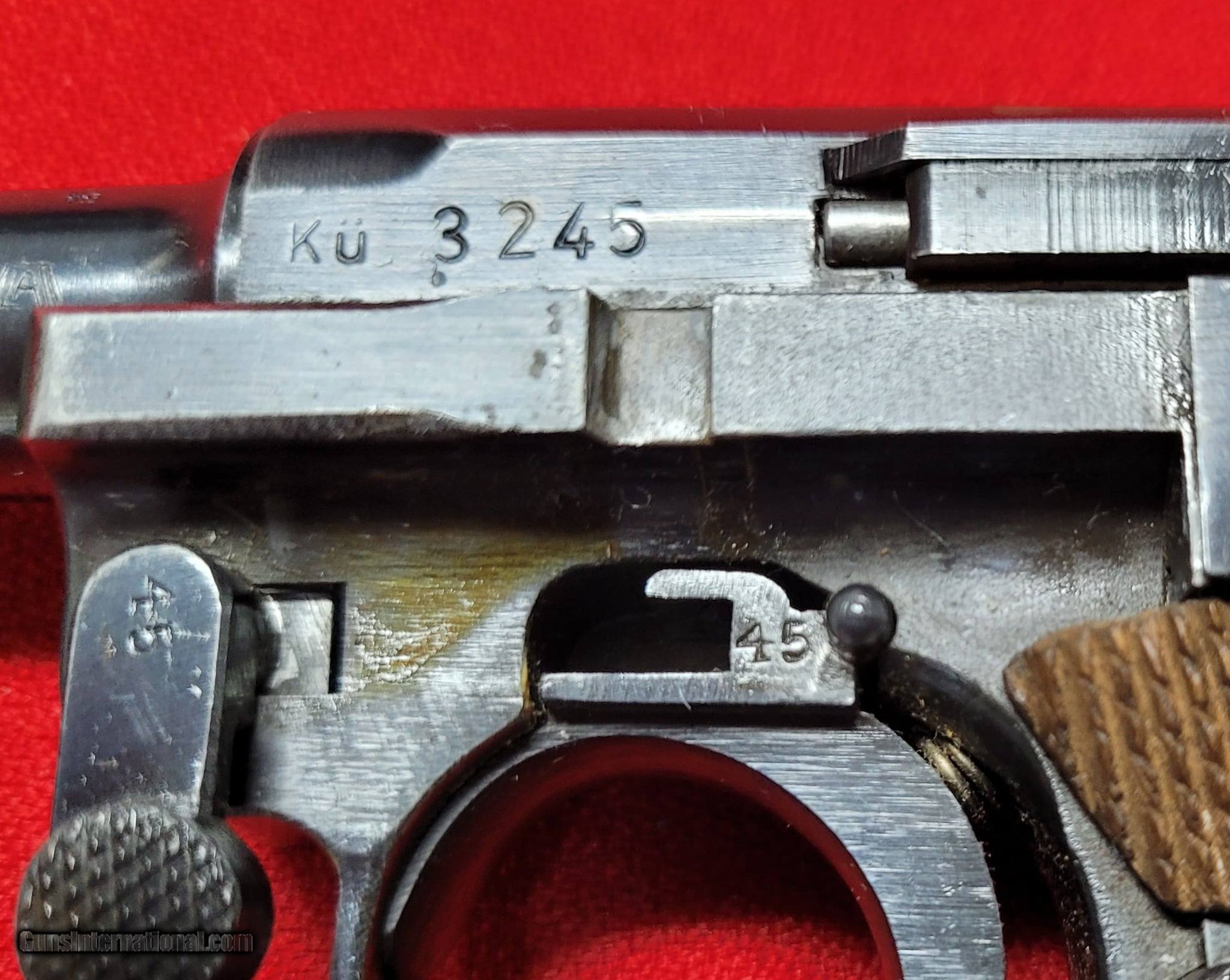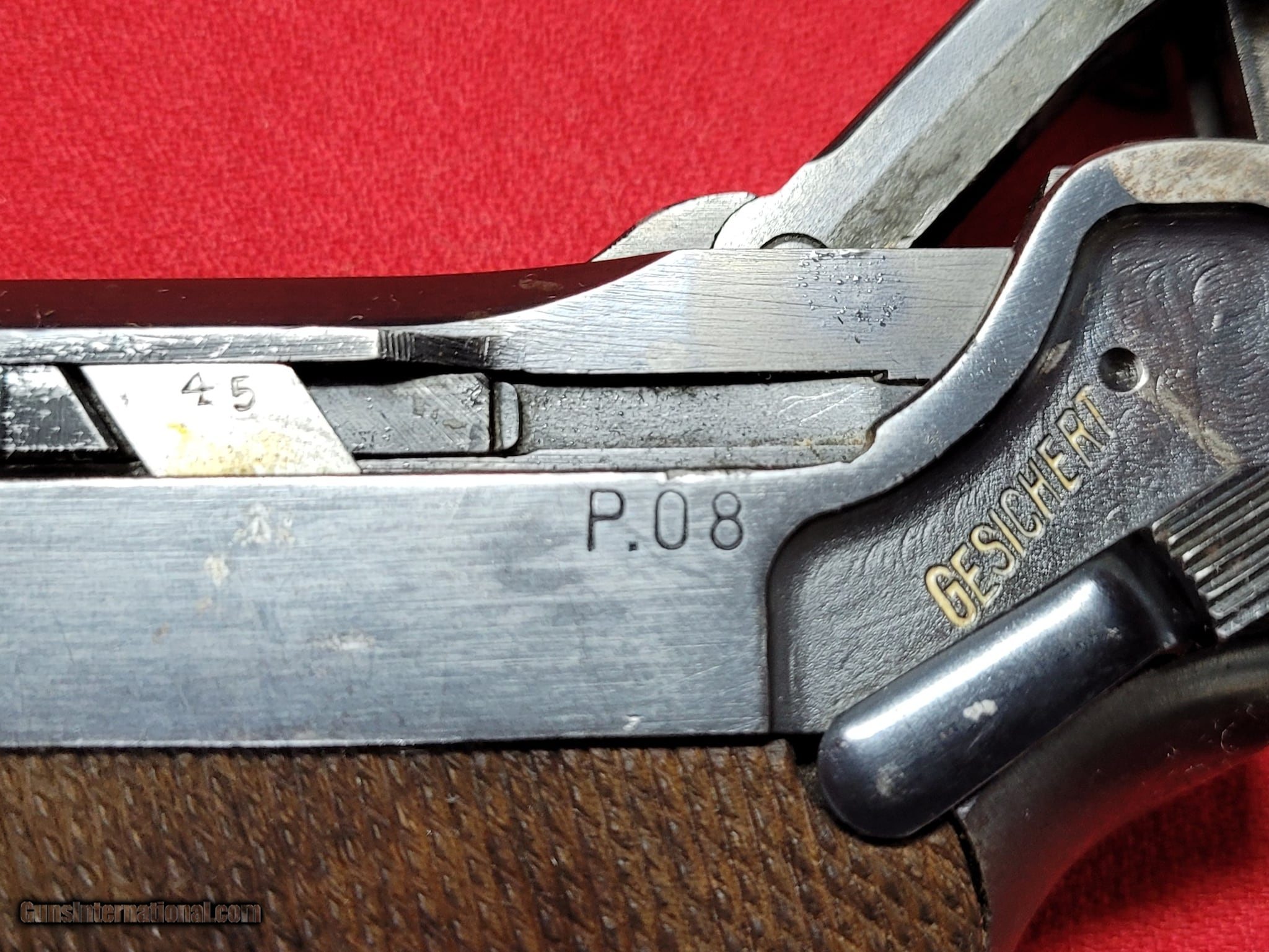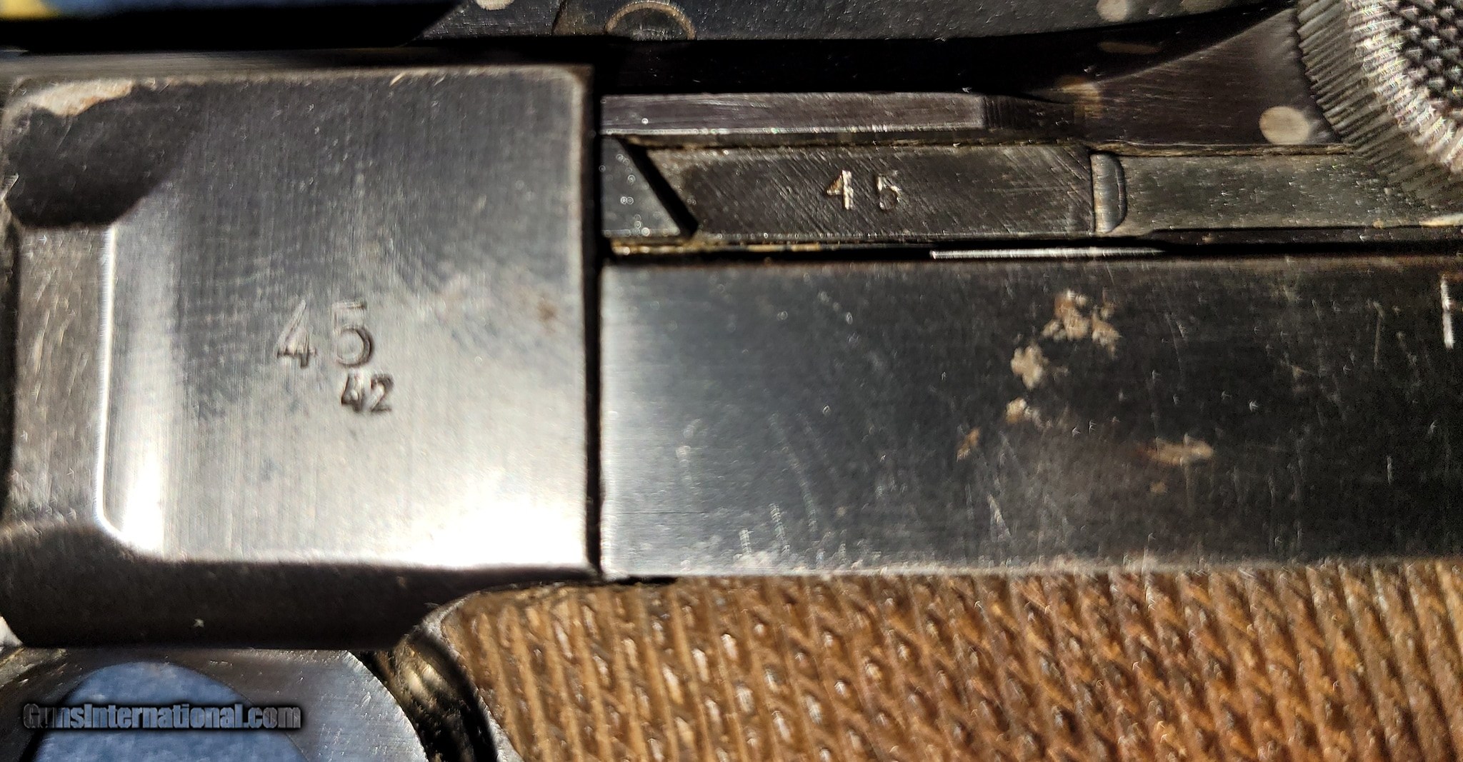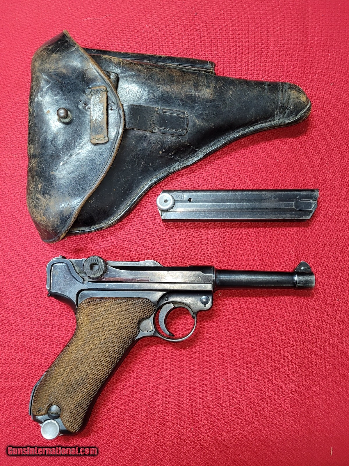 Description: Guns Listing ID: 736218 This 42 coded Luger was manufactured by Mauser in 1941 with serial # 3245 and appears to have all matching serial numbers. A 655 military proof stamp is present on the barrel as well as Mauser proof marks on the right side of the receiver and on the left side of the barrel near the action. The original bluing estimated at 90%. Includes two period matching magazines and leather holster. This model has the stock connection point on the backstrap. HISTORY. The Luger was originally designed in 1898 by Georg J. Luger and first manufactured two years later by a German company called Deutsche Waffen-und Munitionsfabriken (DWM). The Luger is a toggle locked, recoil operated, semi-automatic pistol that is chambered in 9mm Parabellum. It utilizes an adjustable front blade sight and fixed V notch rear sight that is located on the rear toggle link. It is fed by a single stack 8 round detachable box magazine, but it can also be fed by using a 32 round detachable drum. The Swiss Army first purchased the Luger in 1900, followed by the German Navy in 1904 and German Army in 1908. The popularity of the weapon is understandable – durable, well-made and with so many variations, making it the most popular collector gun in the world. SOLD Curio/Relic: Yes Manufacturer: MAUSER Model: P-08 Caliber Info: 9 MM (9X19 PARA) Condition: Used - Non-Certified Barrels: 4 BARREL Finish: WOOD GRIPS/BLUED STE |