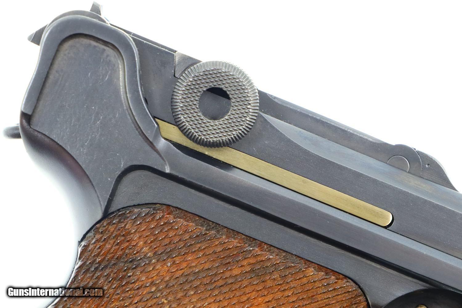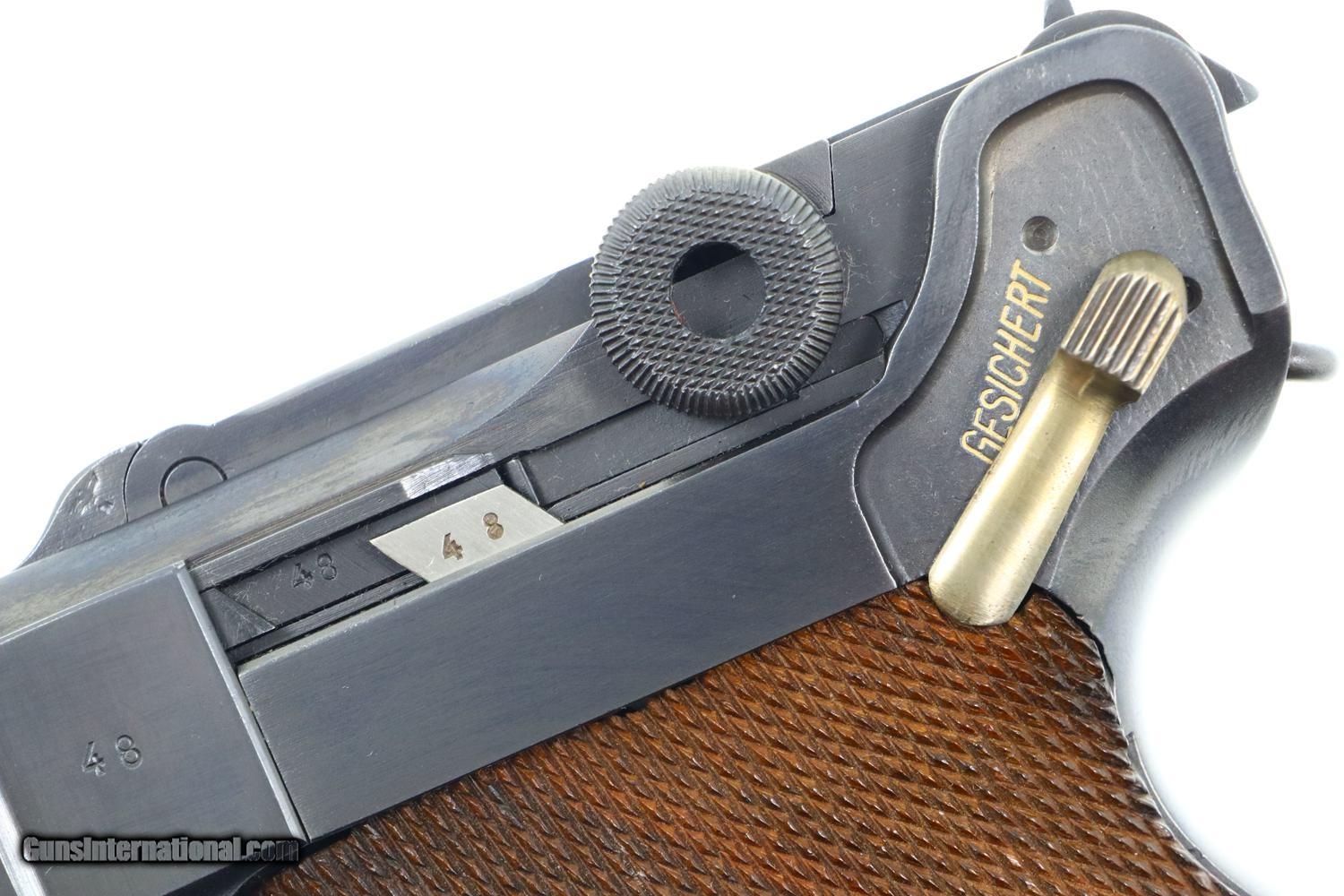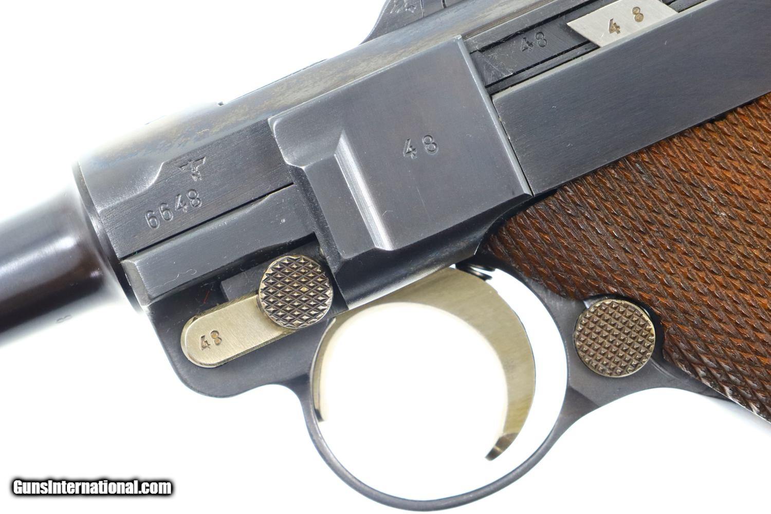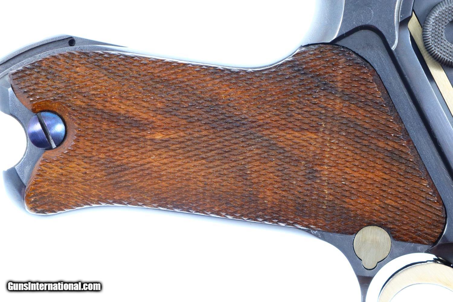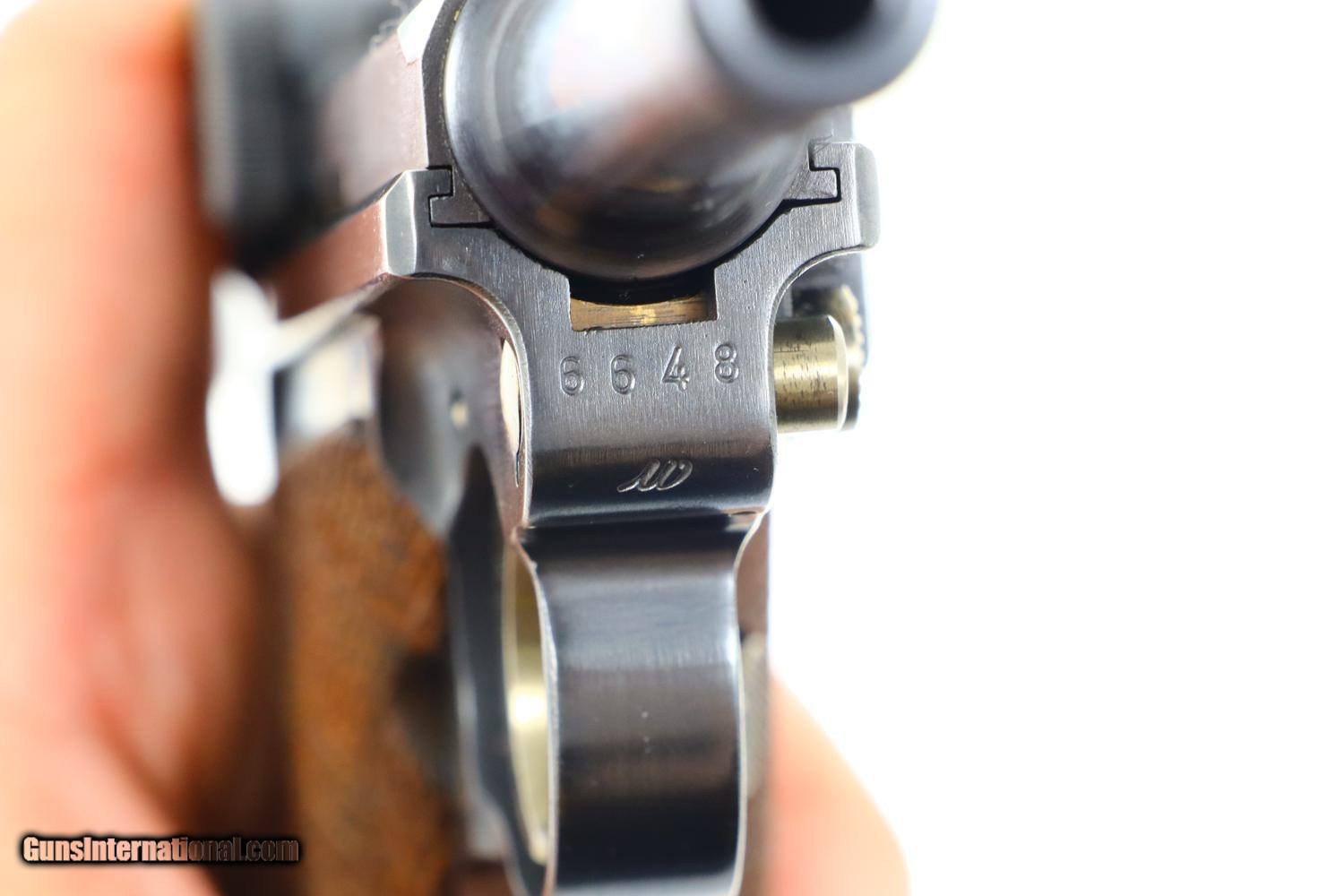 Description: Synopsis: Mauser, 1940 dated, Swedish Commercial Luger, 6648w, FB00762 Description: Scarce Mauser Banner Swedish Commercial Luger, 1940 chamber date, Cal: .30 Luger. Standard configuration Luger with 4” barrel having drift adjustable front sight and fixed “V” notch rear sight. 1940 chamber date, middle toggle link marked with Mauser Banner. Full serial number with letter suffix on front of frame with the serial number repeated under the barrel and on left side of receiver. Disassembly shows all matching numbers except wooden grips, the left panel marked with a large "70". Haenel Schmeiser stainless steel extruded magazine with aluminum plug and police type markings: “2/2124/Eagle N.” Condition: Over 99% crisp salt blue with comparable condition strawed/fire blued small parts and grips. Exc Haenel Schmeiser magazine. Mirror bright bore with very sharp rifling. Perfect manual mechanics. A gorgeous looking 1940 Swedish Mauser Banner Luger in .30 caliber! ~~Insured shipping fee of $75; most packages shipped using FedEx 2nd Day.~~ SOLD Manufacturer: Mauser Serial Number: 6648w Caliber Info: .30 Luger |