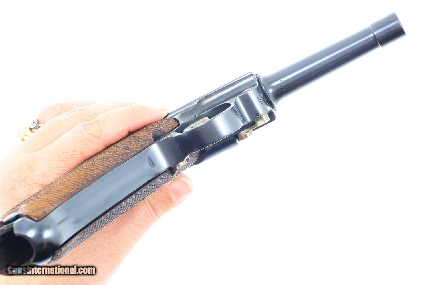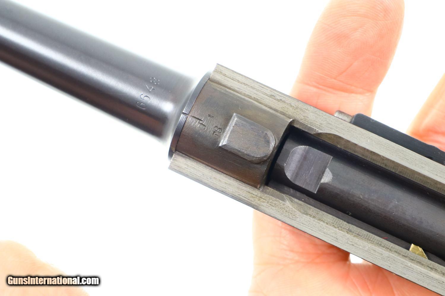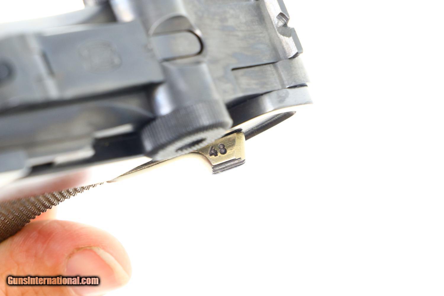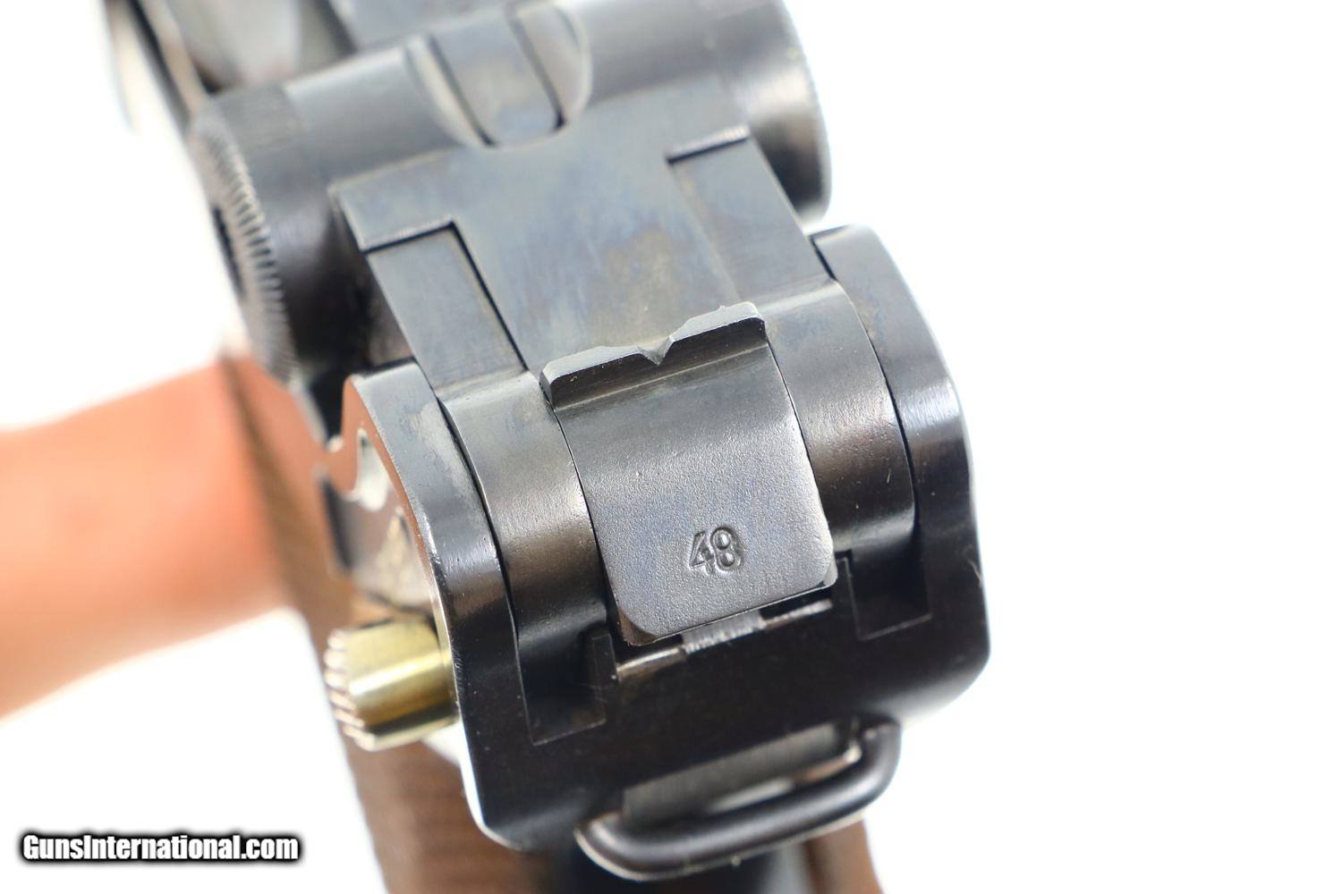 Description: Synopsis: Mauser, 1940 dated, Swedish Commercial Luger, 6648w, FB00762 Description: Scarce Mauser Banner Swedish Commercial Luger, 1940 chamber date, Cal: .30 Luger. Standard configuration Luger with 4” barrel having drift adjustable front sight and fixed “V” notch rear sight. 1940 chamber date, middle toggle link marked with Mauser Banner. Full serial number with letter suffix on front of frame with the serial number repeated under the barrel and on left side of receiver. Disassembly shows all matching numbers except wooden grips, the left panel marked with a large "70". Haenel Schmeiser stainless steel extruded magazine with aluminum plug and police type markings: “2/2124/Eagle N.” Condition: Over 99% crisp salt blue with comparable condition strawed/fire blued small parts and grips. Exc Haenel Schmeiser magazine. Mirror bright bore with very sharp rifling. Perfect manual mechanics. A gorgeous looking 1940 Swedish Mauser Banner Luger in .30 caliber! ~~Insured shipping fee of $75; most packages shipped using FedEx 2nd Day.~~ SOLD Manufacturer: Mauser Serial Number: 6648w Caliber Info: .30 Luger |