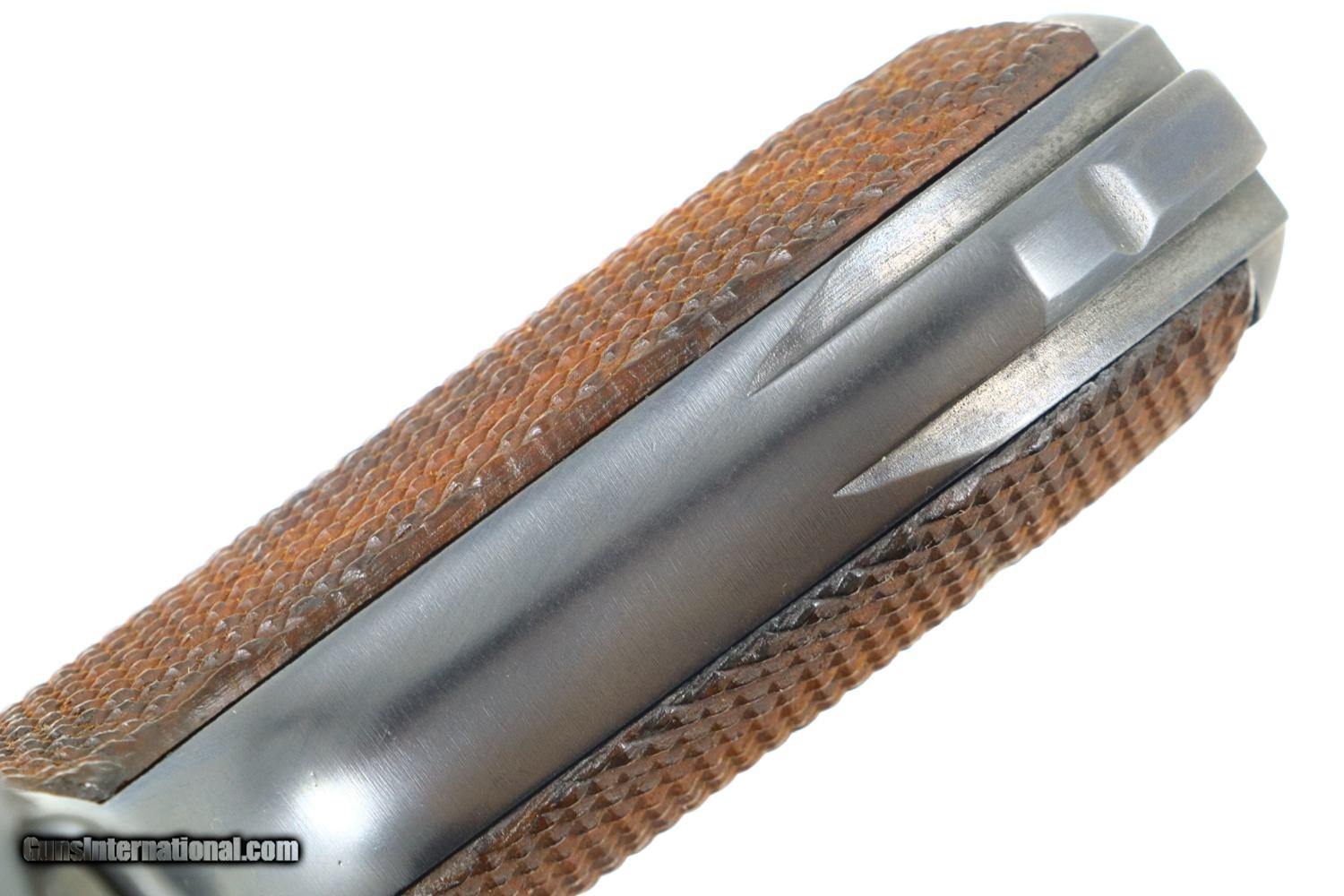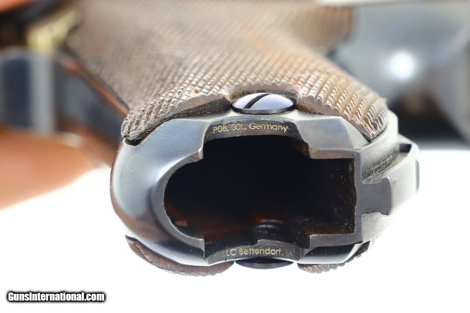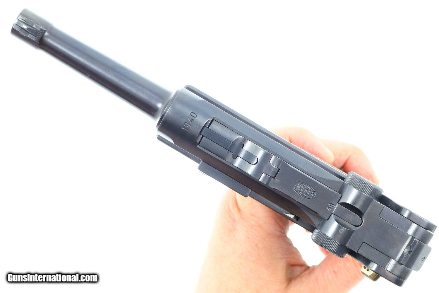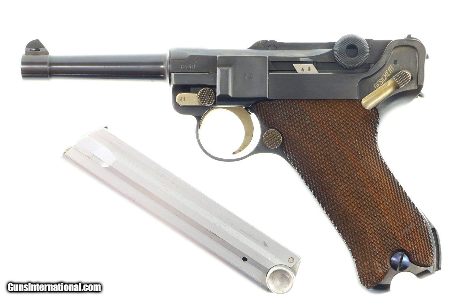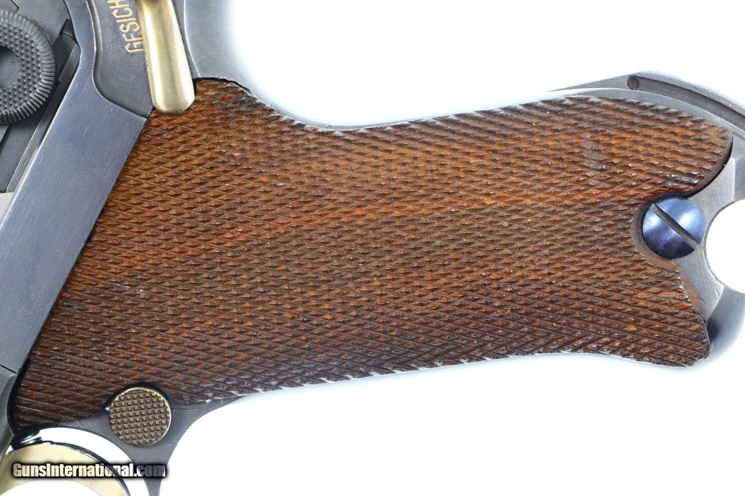 Description: Synopsis: Mauser, 1940 dated, Swedish Commercial Luger, 6648w, FB00762 Description: Scarce Mauser Banner Swedish Commercial Luger, 1940 chamber date, Cal: .30 Luger. Standard configuration Luger with 4” barrel having drift adjustable front sight and fixed “V” notch rear sight. 1940 chamber date, middle toggle link marked with Mauser Banner. Full serial number with letter suffix on front of frame with the serial number repeated under the barrel and on left side of receiver. Disassembly shows all matching numbers except wooden grips, the left panel marked with a large "70". Haenel Schmeiser stainless steel extruded magazine with aluminum plug and police type markings: “2/2124/Eagle N.” Condition: Over 99% crisp salt blue with comparable condition strawed/fire blued small parts and grips. Exc Haenel Schmeiser magazine. Mirror bright bore with very sharp rifling. Perfect manual mechanics. A gorgeous looking 1940 Swedish Mauser Banner Luger in .30 caliber! ~~Insured shipping fee of $75; most packages shipped using FedEx 2nd Day.~~ SOLD Manufacturer: Mauser Serial Number: 6648w Caliber Info: .30 Luger |