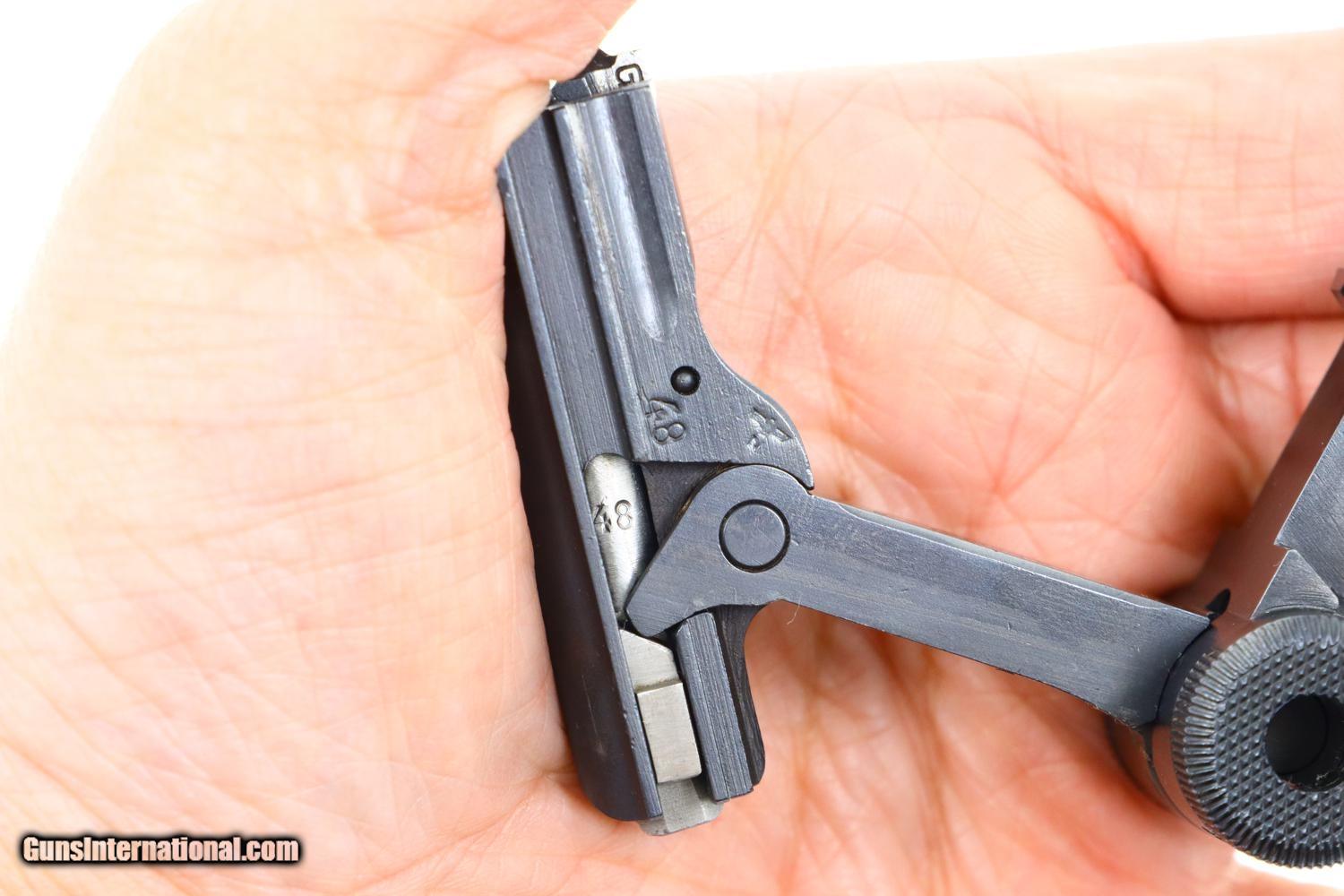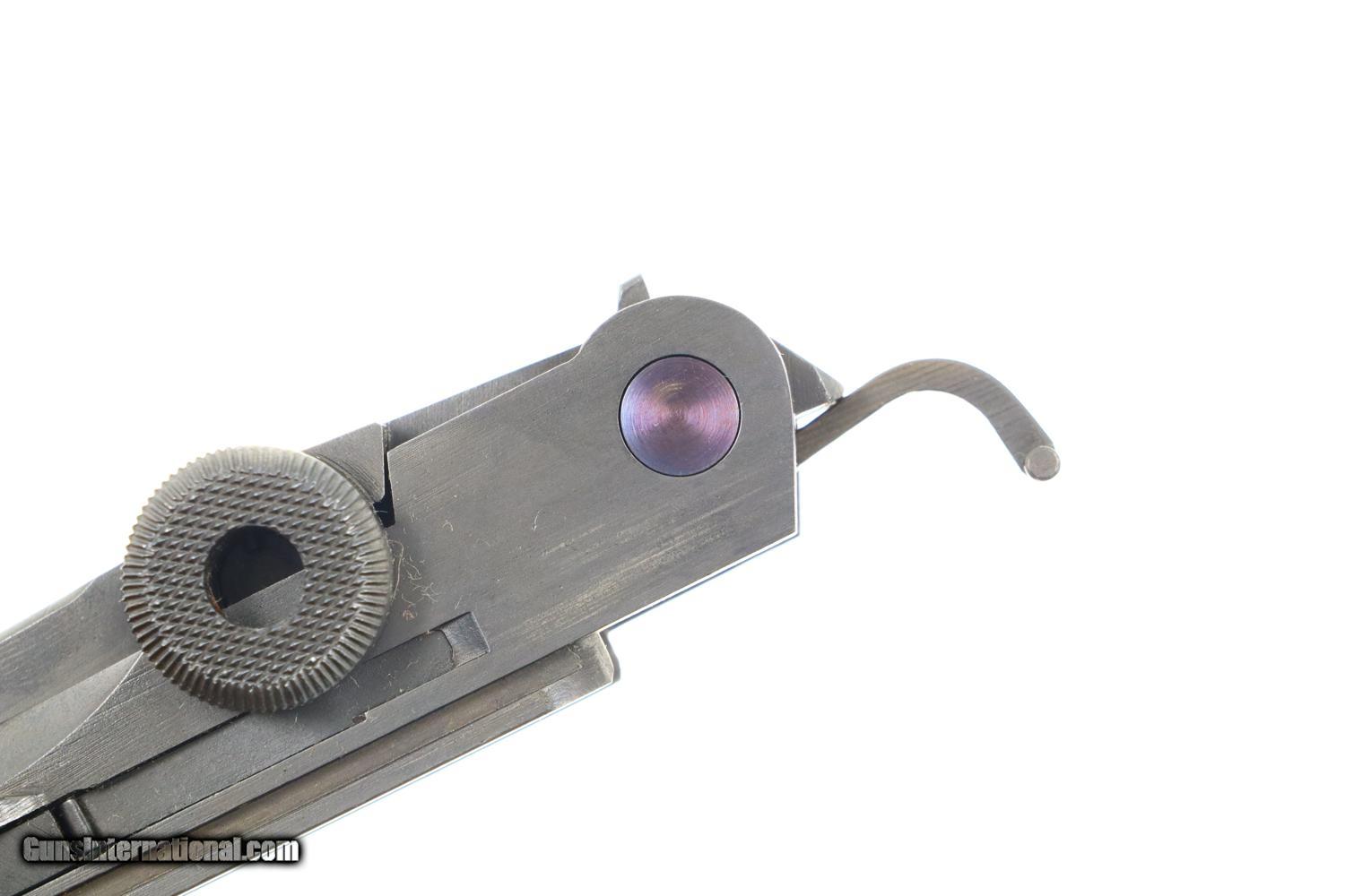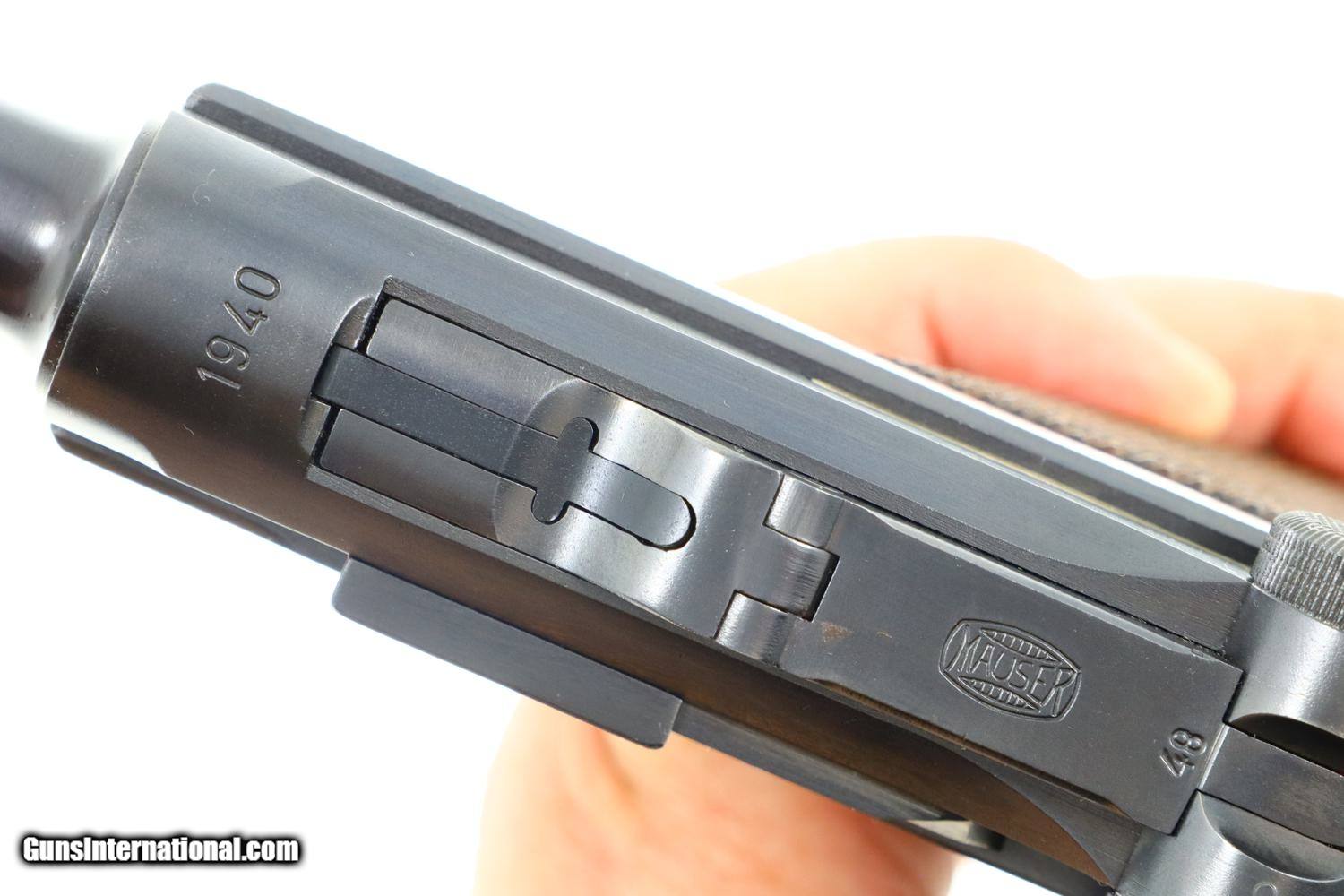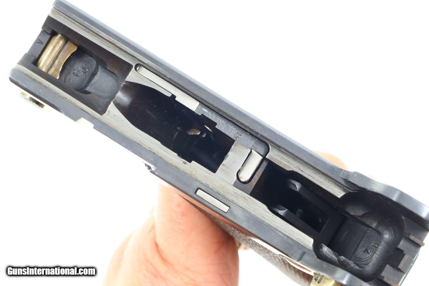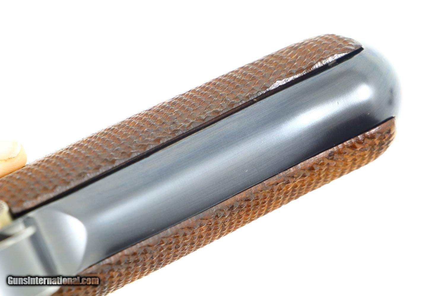 Description: Synopsis: Mauser, 1940 dated, Swedish Commercial Luger, 6648w, FB00762 Description: Scarce Mauser Banner Swedish Commercial Luger, 1940 chamber date, Cal: .30 Luger. Standard configuration Luger with 4” barrel having drift adjustable front sight and fixed “V” notch rear sight. 1940 chamber date, middle toggle link marked with Mauser Banner. Full serial number with letter suffix on front of frame with the serial number repeated under the barrel and on left side of receiver. Disassembly shows all matching numbers except wooden grips, the left panel marked with a large "70". Haenel Schmeiser stainless steel extruded magazine with aluminum plug and police type markings: “2/2124/Eagle N.” Condition: Over 99% crisp salt blue with comparable condition strawed/fire blued small parts and grips. Exc Haenel Schmeiser magazine. Mirror bright bore with very sharp rifling. Perfect manual mechanics. A gorgeous looking 1940 Swedish Mauser Banner Luger in .30 caliber! ~~Insured shipping fee of $75; most packages shipped using FedEx 2nd Day.~~ SOLD Manufacturer: Mauser Serial Number: 6648w Caliber Info: .30 Luger |