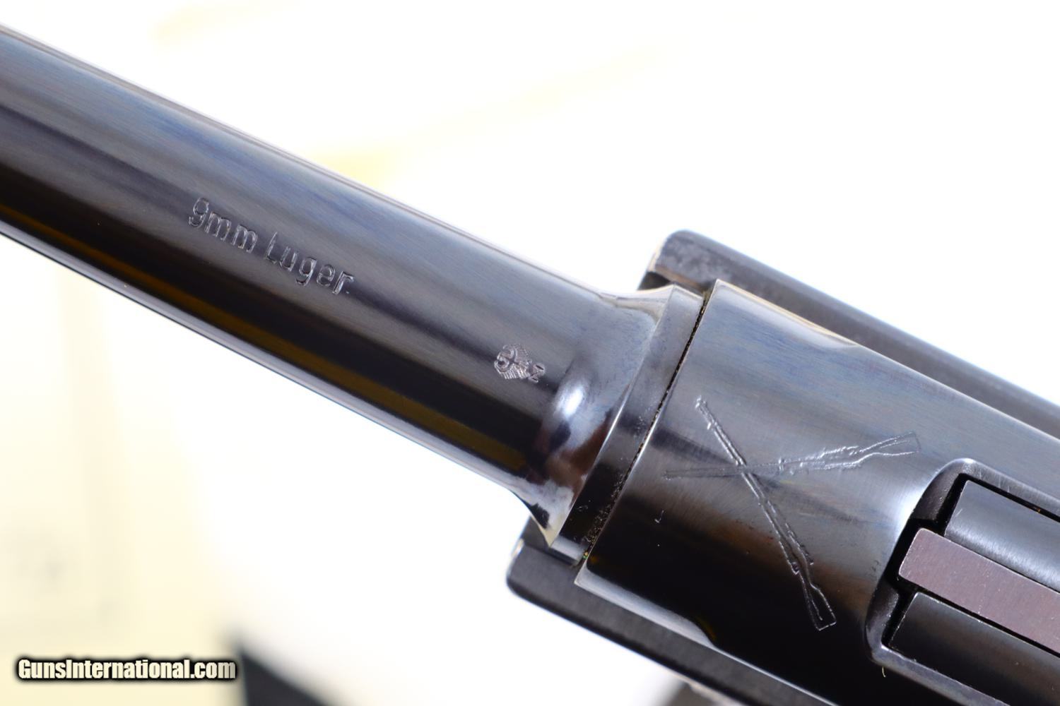 Description: Synopsis: Mauser, P08, Russian Commemorative, Boxed w/Accessories, 155von250R, FB00909 Description: Spectacular, as new, Mauser 1908 Russian Commemorative Luger complete with all accessories in original blue/white Interarms shipping box. SN: 155von250R. Cal: 9mmP. Standard Russian commemorative with 4 inch barrel having drift adjustable front sight and fixed U notched rear sight. Gold inlayed DWM initials on middle toggle link with gold inlay “70 Jahre/Parabellum-Pistole/Kaiserreich Rusland” on the left side of the frame. Cyrillic safety markings. Serial number on right side of receiver. No INTERARMS LOGO. Single line Mauser address on frontstrap. Original Mauser marked and serial numbered hanging tag. Complete with spare magazine, cleaning rod, takedown tool, instruction booklet and numbered test target in original blue and white cardboard shipping box with Styrofoam liner and factory label on both sides. Condition: The pistol and accessories present as new. They styrofoam insert has a few oil stains and handling impressions. The shipping box has one split corner that could be easily repaired. A difficult to commemorative to encounter with out Interarms markings. ~~Insured shipping fee of $75; most packages shipped using FedEx 2nd Day.~~ SOLD Manufacturer: Mauser Serial Number: 155von250R Caliber Info: 9mm Luger |