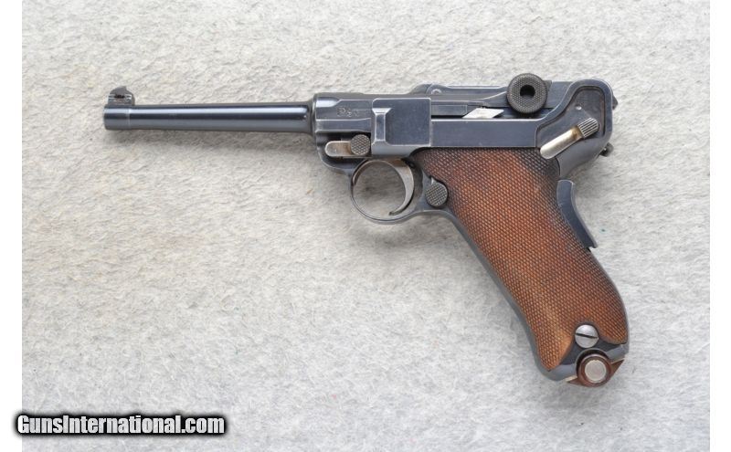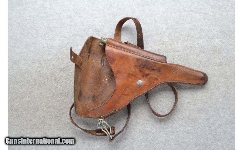 Description: This Mauser Model P36 is a toggle locked recoil operated semi-automatic pistol in 9mm Cal. It has a 4.75 inch barrel. A blade front and notch rear sight. The grip is a diamond checkered walnut. The top is stamped with a cross in a striped shield and 45. There is a cross on the barrel right side. The left side has P36 with a cross in the P. It comes with a leather holster and two magazines. Magazine numbers do not match the serial number. SOLD Manufacturer: S/N 11462 Caliber Info: 9mm Chambers: Semi-Auto 8 round magazine. Metal Condition: Very good with a little blue wear. Wood Condition: Very good. Bore Condition: Very good. Barrels: 4.75 inch blued barrel. Stock: Diamond checkered grip walnut. Weight: 34 oz. Sights: Blade front. Notch rear. Extras: Comes with a brown leather holster and two magazines. Item Location: Richfield, WI |