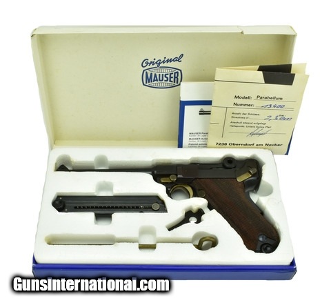 Description: Mauser Parabellum Luger 9mm caliber pistol. Original German made Luger, 1970’s vintage. Desirable 6” model in 9mm. Excellent condition with box, papers and accessories.