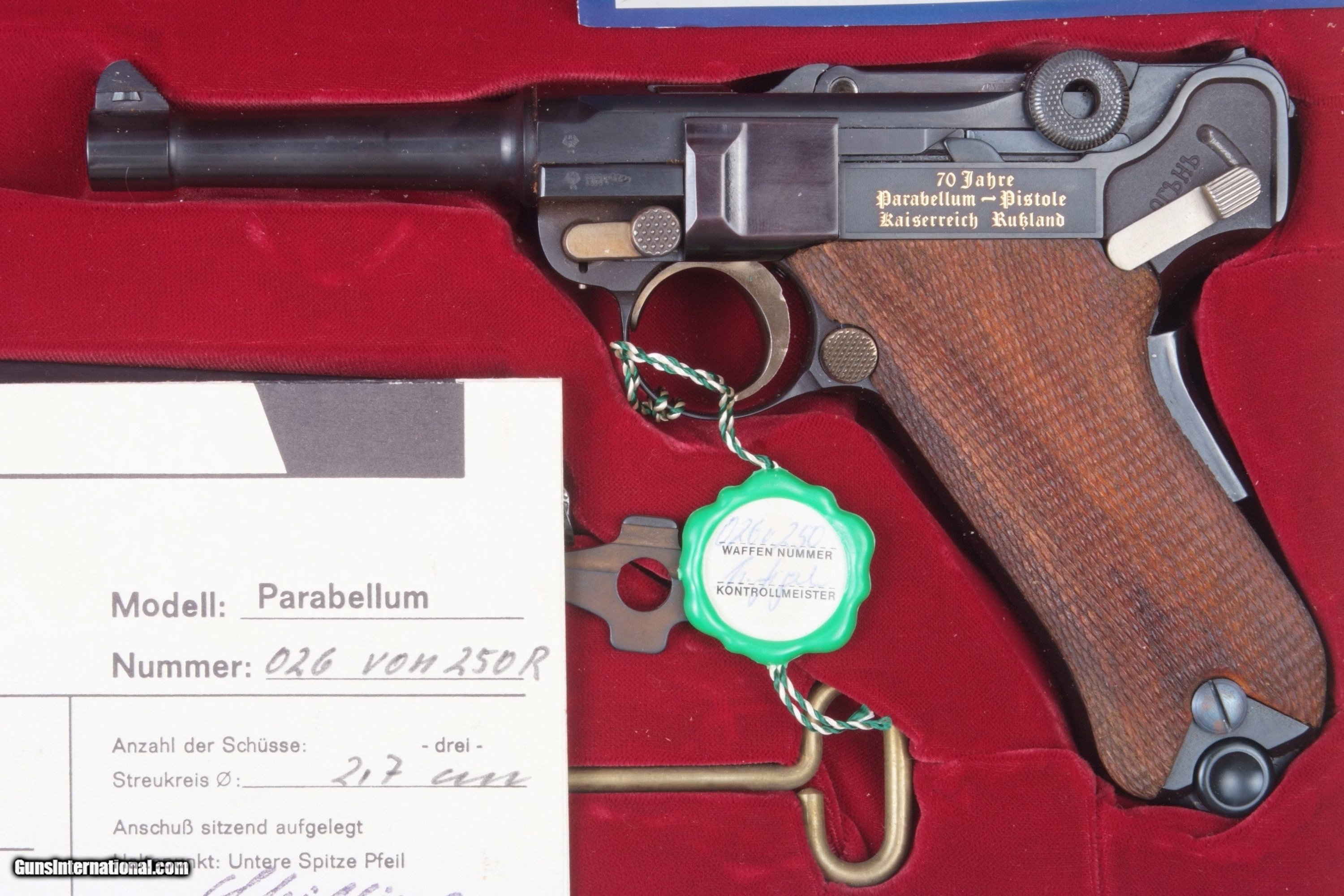 Standard Russian commemorative with 4 inch barrel having drift adjustable front sight and fixed U notched rear sight. Gold inlayed DWM initials on middle toggle link with gold inlay “75 Jahre/Parabellum-Pistole/Kaiserreich Rusland” on the left side of the frame. Cyrillic safety markings. Serial number on right side of receiver. No INTERARMS LOGO. Single line Mauser address on frontstrap. Original Mauser marked and serial numbered hanging tag. Complete with spare magazine, cleaning rod, takedown tool, instruction booklet and numbered test target in original blue and white cardboard shipping box with Styrofoam liner and factory label on right side. Included with boxed pistol is an excellent brown leatherette Mauser marked presentation case, lined with dark burgundy velvet, showing faint impressions but no tears.