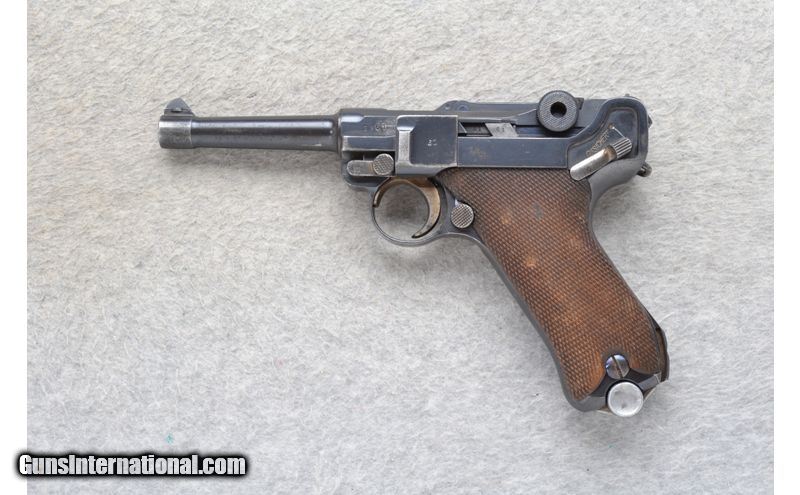 Description: This Mauser Model S/42 1936 Luger is a semi-automatic pistol in 9mm Cal. It has a 4 inch barrel. A blade front and notch rear sight. The grip is a diamond checkered walnut. It has matching serial numbers including the aluminum knob magazine. 9mm Luger SOLD Chambers: Semi-Auto 8 round magazine. Metal Condition: Good. Light wear, handling marks and freckling. Wood Condition: Good. Has handling marks and light wear. Barrels: 4 inch blued. Sights: Blade front. Notch rear. Item Location: Acworth, GA |