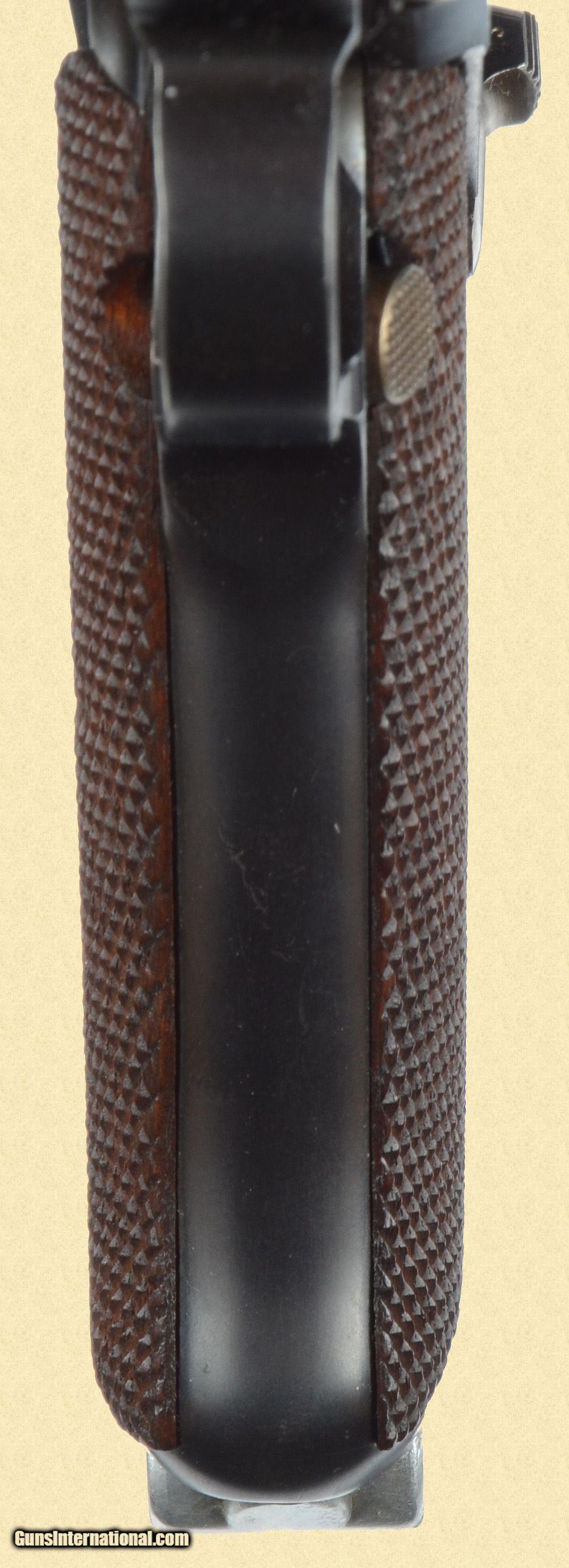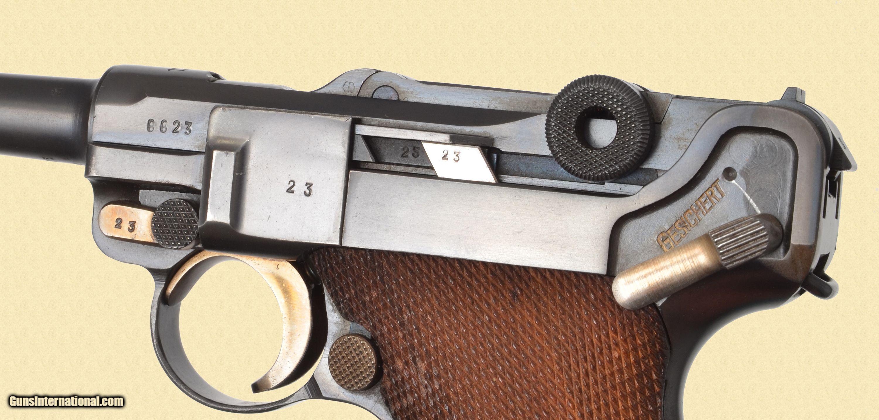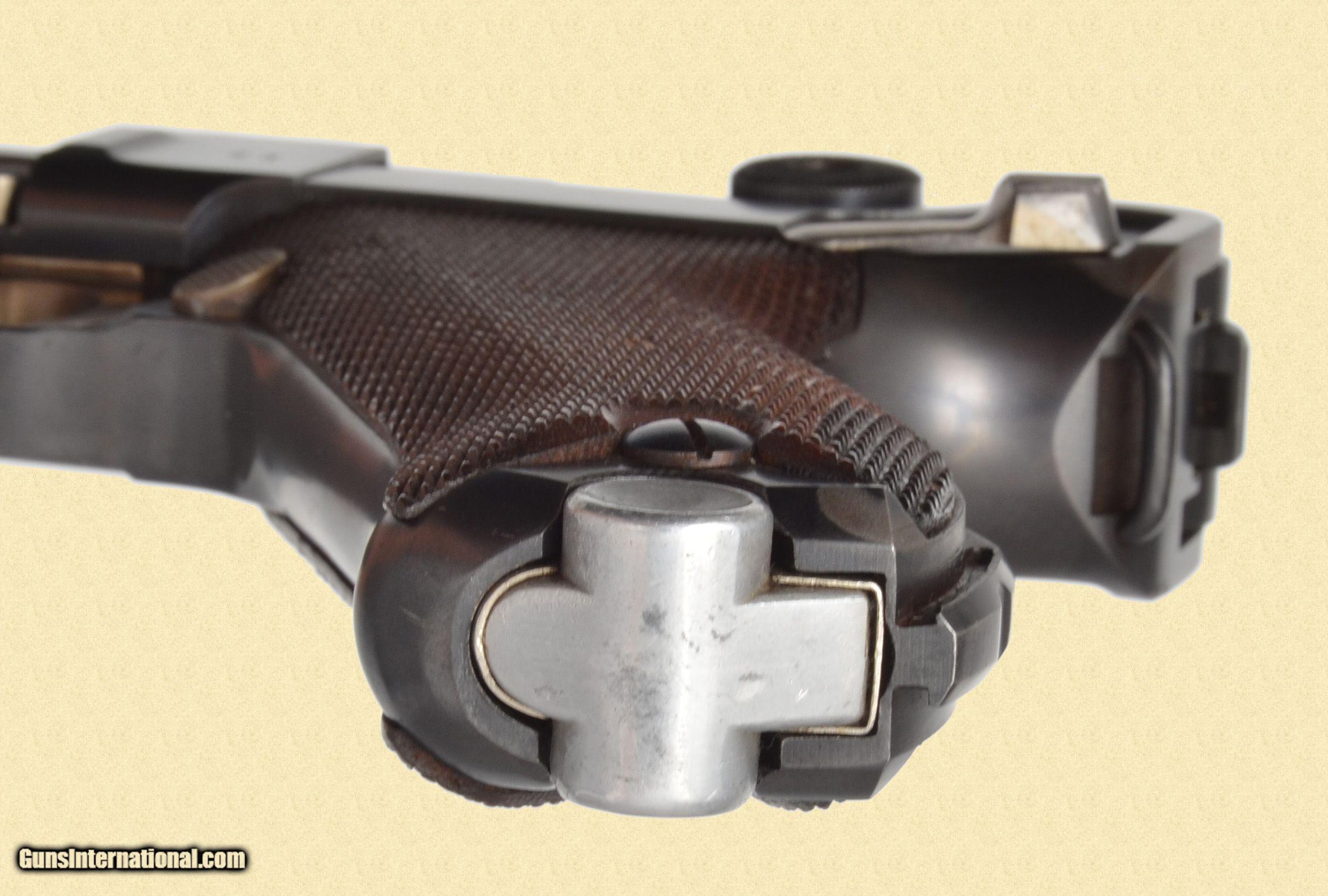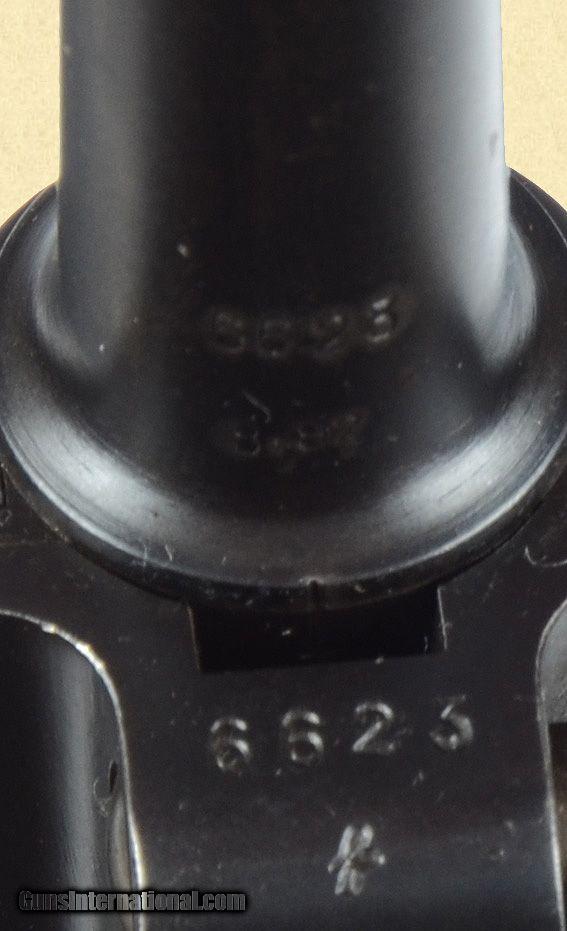 Description: 9mm Luger; 97% blue, 90% straw, excellent bore, very good grips, 4'' barrel, Original blue finish, strawed small parts and matching number checkered walnut grips. All matching except the magazine which is the proper variation bright sheet steel with aluminum bottom. The magazine base is not numbered or proofed. Stamped on top of the toggle with the Mauser code S/42 and on top of the chamber with the date 1936. The right side of the receiver is stamped with two droop wing eagle/63 proofs and a droop wing eagle military acceptance test proof. Other acceptance test proofs appear on the right side of the barrel and left side of the breechbolt. A small droop wing eagle/63 proof is located on the left side of the barrel. The metal finish shows minor sharp edge wear and light high point wear on the sideplate hump and front corners of the frame rails. The left side of the toggle housing along the back edge has some faded finish and the lower back corner of the left grip panel has a dark area at the lower back corner . Mechanically fine with a clean sharp bore. C&R/FFL Please call (309)342-5800 Tues-Fri, 10 am -6pm (CST), or Sat 1pm-6pm (CST), for further information, or to purchase firearms. FEDERAL FIREARMS LICENSE (FFL): is required on all shipments of modern guns. We must wait for a copy from your dealer before we can ship to them. We will also ship C&R eligible firearms to Curio and Relic (C&R) license holders. We accept your signed, legible FFL and C&R licenses via fax at 309/ 342-5730 (always on), email at FFLsimpsonltd or through the mail at Simpson Ltd; 140 S Seminary St; Galesburg, IL 61401. Pre-1898 firearms and non-firearms items are exempt from licensing requirements. All items shipped to an Illinois address will be charged 8.75% sales tax. NOTE: Because of recent shipping restrictions and charges placed on us by UPS and FedEx (handguns must ship via next day or 2nd day air and they have added a $10 surcharge for parcels over 48”. Our return policy lasts a maximum of 3 days from the time you receive your item. If 3 days have passed since you received your purchase, and we have not been contacted by you, unfortunately, we can’t offer you a refund or exchange. If you are not happy with your purchase, please contact us by phone and/or email to arrange for a return. Items must be shipped back to us to arrive with 7 days of notification of return. SOLD Curio/Relic: Yes Serial Number: 6623f |