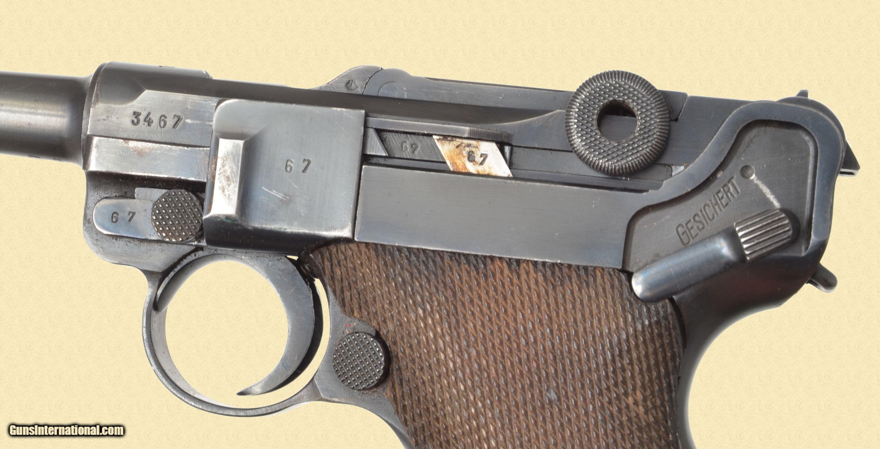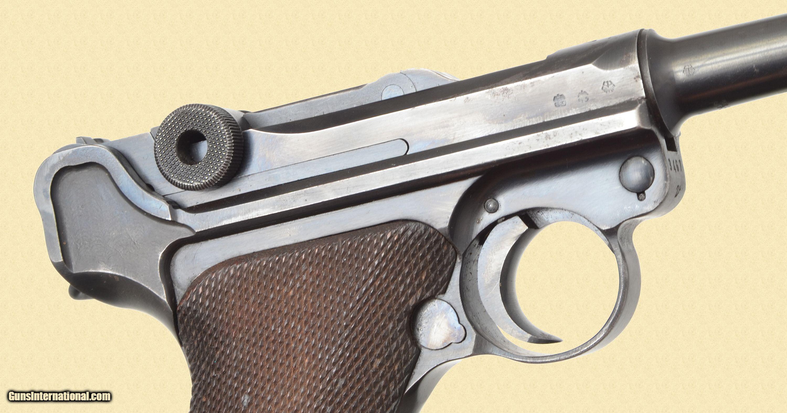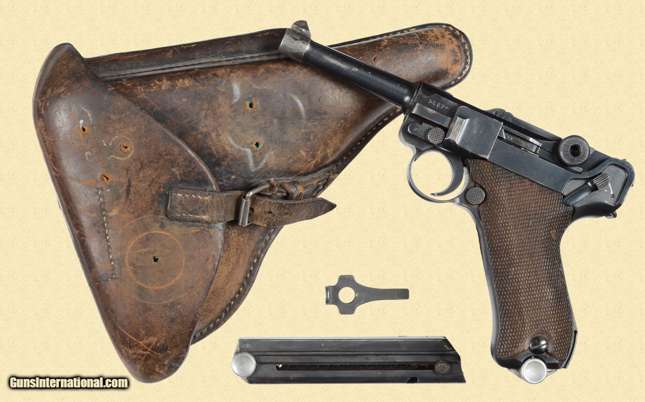 Description: 9mm Luger; 87% blue, Good bore, good grips, 4'' barrel, All blue finish variation S/42 1937. Original blue finish and checkered walnut grips. All matching including the two magazines, one marked with the + indicating the extra mag issued with the gun. The right grip panel is not numbered, the left panel matches and the grips match each other in condition and color. Stamped on top of the toggle with the Mauser code S/42 and on top of the chamber with the date 1937. The right side of the receiver is stamped with two droop wing eagle/63 proofs and a drrop wing eagle military acceptance stamp. Other acceptance stamps appear on the right side of the barrel and left side of the breechbolt. A small droop wing eagle/63 proof is located on the left side of the barrel. The metal finish shows edge wear and high point holstering wear. The end of the barrel has finish loss with some minor spotting. There is also an area on the right side upper edge of the receiver with some finish loss. The grips show light handling with well defined checkering. Rig, includes the two matching magazines, a droop wiong eagle/63 proofed takedown tool and an original 1937 dated leather holster. The holster is in only fair condition, with both belt loops on the back having come apart from the holster, then riveted in place, one at the top and the other at the bottom, then bolted together to form one loop. Also the front of the flap and holster body has small holes where once was attached different insignia. The original stitching sans the belt loops remains intact. The pistol is mechanically fine. The bore shows some wear and light frost throughout. C&R/FFL Please call (309)342-5800 Tues-Fri, 10 am -6pm (CST), or Sat 1pm-6pm (CST), to speak with our sales team for further information, or to purchase firearms. FEDERAL FIREARMS LICENSE (FFL): is required on all shipments of modern guns. We must wait for a copy from your dealer before we can ship to them. We will also ship C&R eligible firearms to Curio and Relic (C&R) license holders. We accept your signed, legible FFL and C&R licenses via fax at 309/ 342-5730 (always on), email at FFLsimpsonltd or through the mail at Simpson Ltd; 140 S Seminary St; Galesburg, IL 61401. Pre-1898 firearms and non-firearms items are exempt from licensing requirements. All items shipped to an Illinois address will be charged 8.75% sales tax. NOTE: Because of recent shipping restrictions and charges placed on us by UPS and FedEx (handguns must ship via next day or 2nd day air and they have added a $10 surcharge for parcels over 48”. Our return policy lasts a maximum of 3 days from the time you receive your item. If 3 days have passed since you received your purchase, and we have not been contacted by you, unfortunately, we can’t offer you a refund or exchange. If you are not happy with your purchase, please contact us by phone and/or email to arrange for a return. Items must be shipped back to us to arrive with 7 days of notification of return. SOLD Curio/Relic: Yes Serial Number: 3467v |