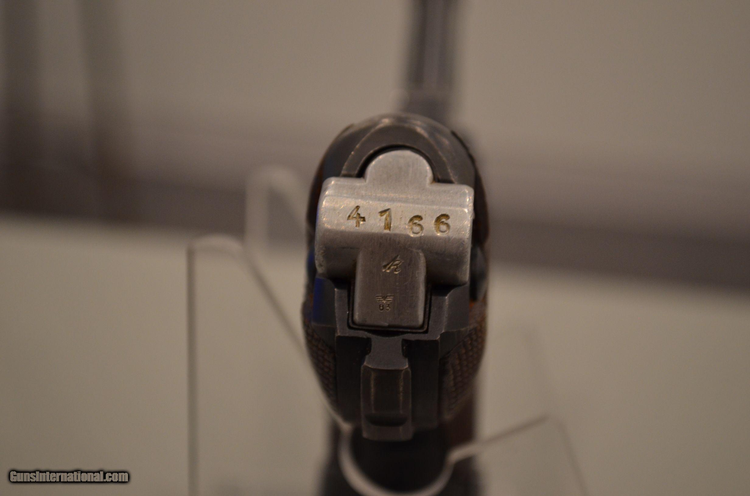 Description: This is a S42(Mauser) Luger. This is an all numbers matching pistol. The finish is good overall but the barrel soed show some bluing loss. The grips are nice and show no cracks or chips. The bore is ain good shape and should make for a great shooter. Please Contact Jason in sales with any questions at 610-258-5500 Ext 104 ALL FIREARMS SUBJECT TO SALE IN STORE!!!!! SOLD Curio/Relic: Yes Manufacturer: Mauser Model: P08 Serial Number: 4166 Caliber Info: 9mm Bore Condition: Strong Lands and Grooves Action: Semi-Auto Manufacture Date: 1938 |