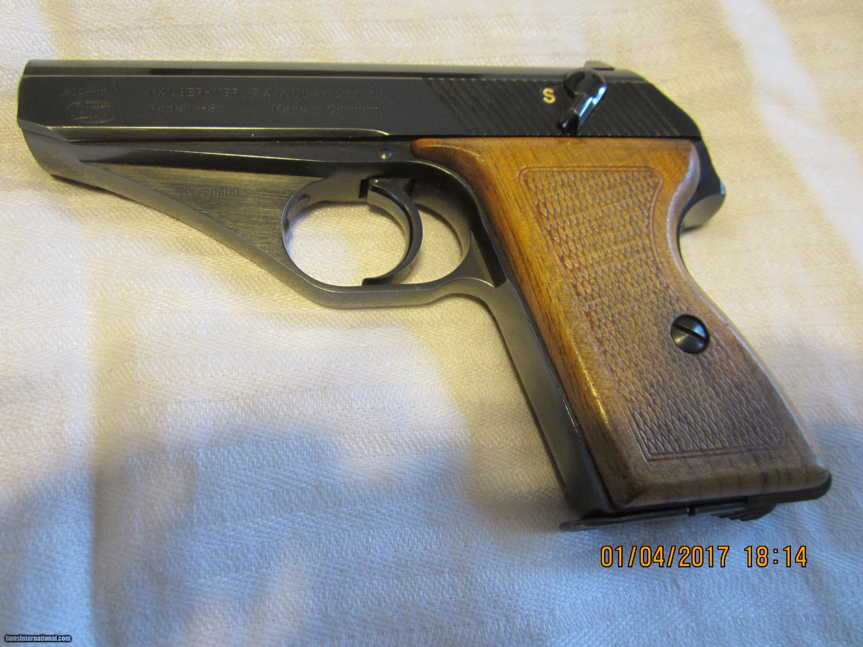 Description: A nicely designed Mauser pistol, made in Germany, small enough to carry concealed, with a 4 & 1/4" barrel, in 99% condition. It has a high beautiful blue finish and checkered walnut grips also in 99% condition. The bore is bright and shiney with sharp rifling. It could be unfired. The slide is marked with the Mauser name. It is a semi-automatic pistol, double action with enough hammer exposed to allow it to manually cocked. There are front and rear sights designed to not snag on clothing. There is a safety with the lever on the left side of the frame. The caliber is marked in the ejection port. The magazine is marked "Mauser". Many Mauser pistols were made in Italy and the quality of workmanship is not the same as those made in Germany. SOLD Manufacturer: Mauser-Werk AG, Oberndorf aN Made in Germany Model: HSc Serial Number: $525- +shipping Caliber Info: .380 (9mm kurz) Bore: 99% rifled Condition: 99% Metal Condition: 99% Wood Condition: 99% Bore Condition: Excellent Barrels: one Barrel Type: round Action: semi-action Triggers: one Stock: walnut/checkered Finish: Blued Weight: 1.5 lbs Sights: front & rear Manufacture Date: 1983-1985 Engraving: no Item Location: California |