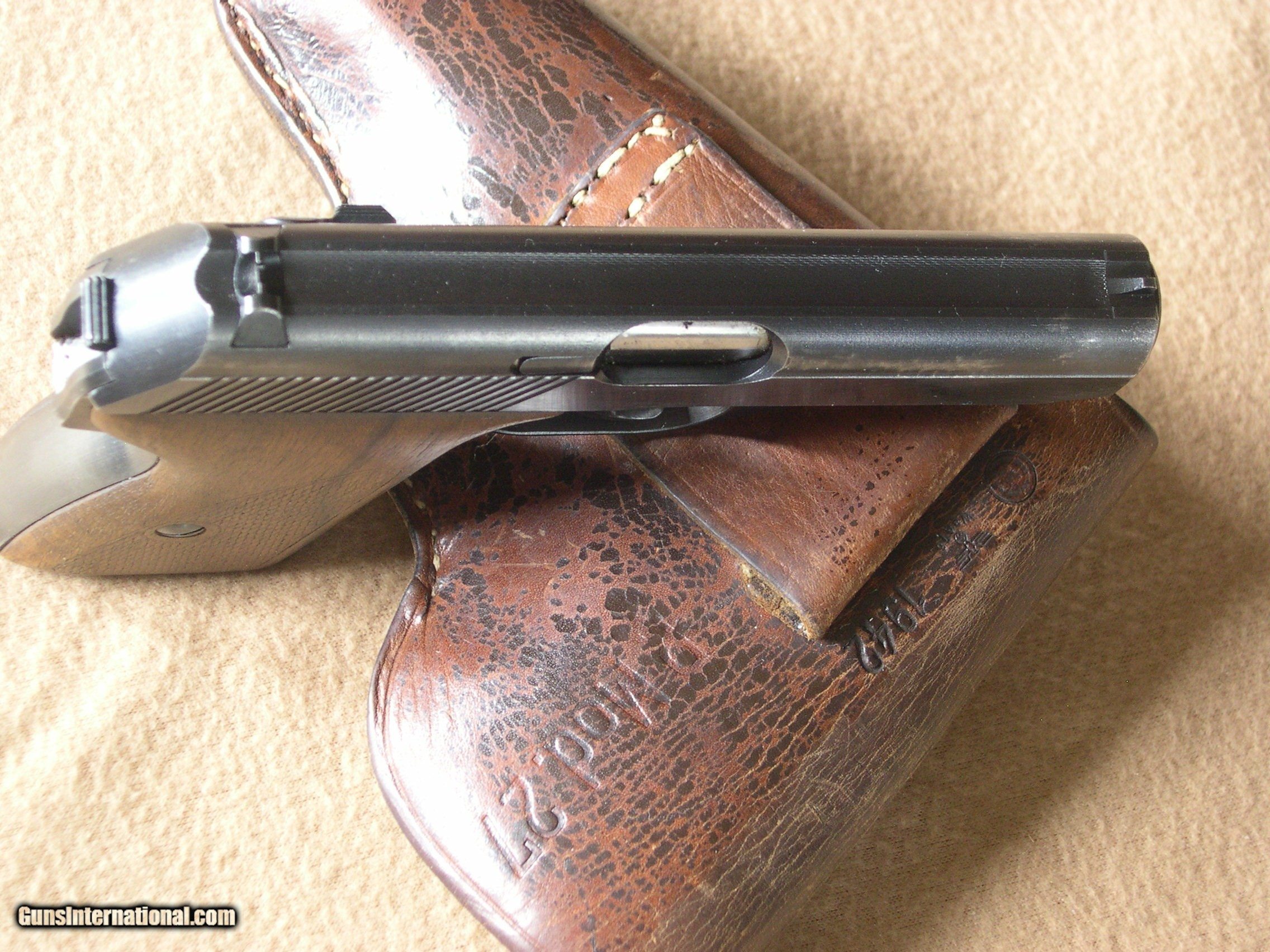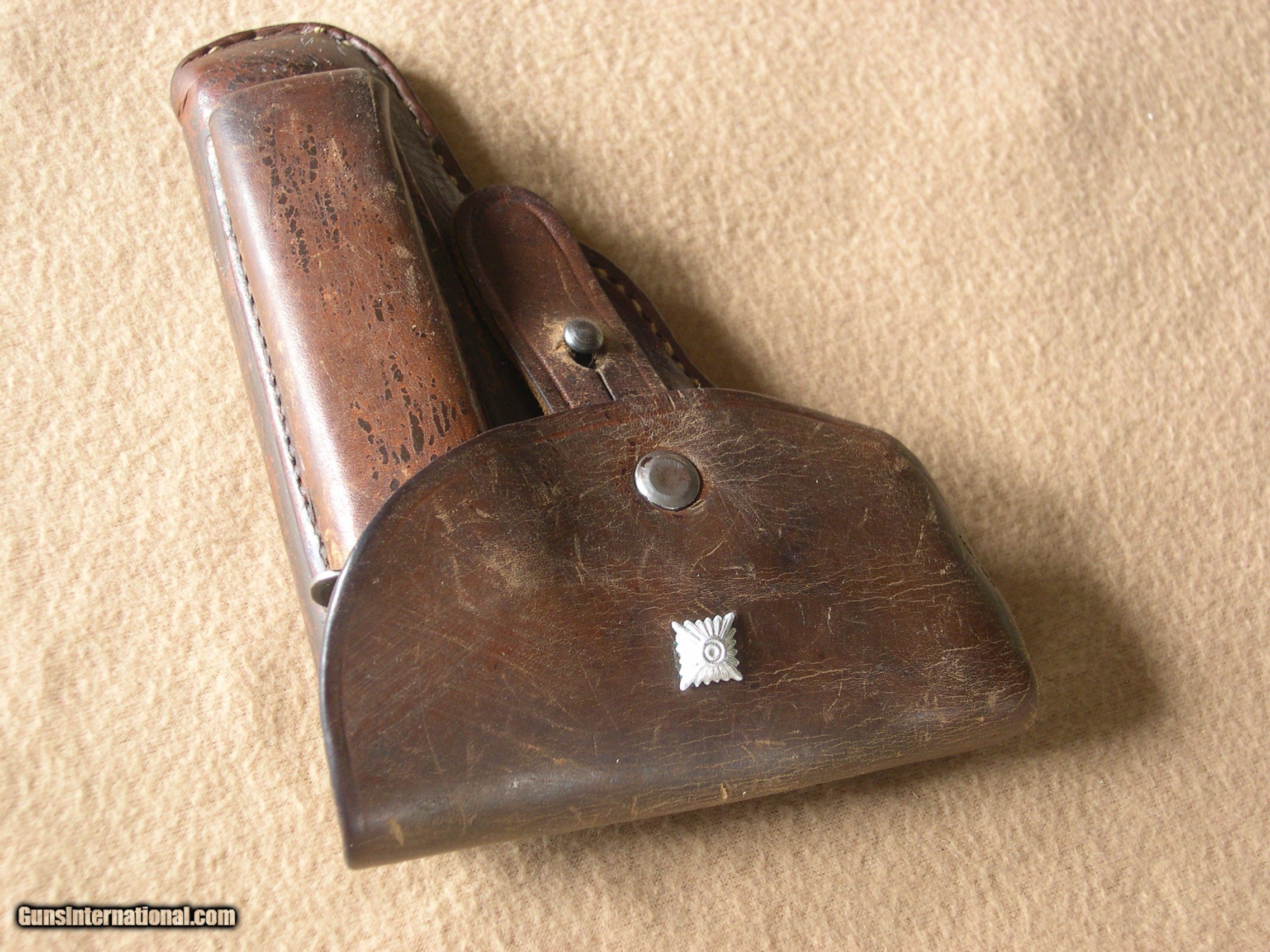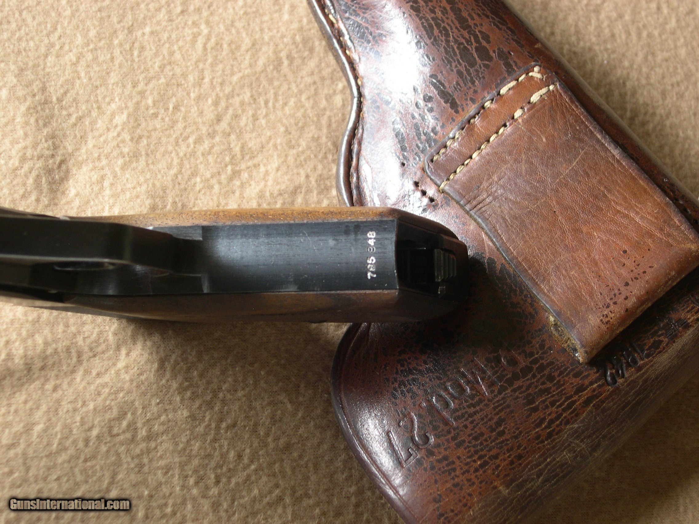 Description: This comes with 1942 Holster, Nazi proofed also, for P model 27, this HSC pistol fits perfectly! with one mag. 98 % original blue and wood also ! on trigger guard waffen eagle #135, gun has slight holster wear, on slide only, 99% on rest of gun, nice original wood grips, grip straps with 99% blue also! this gun all factory original !!! SOLD |
